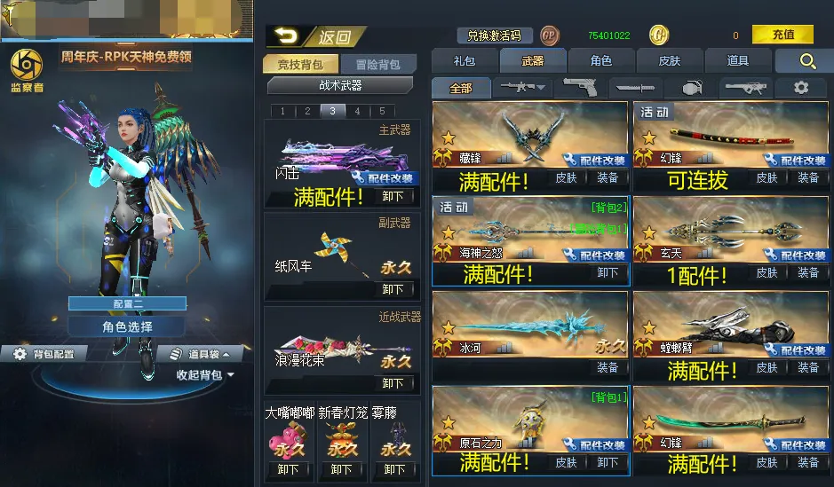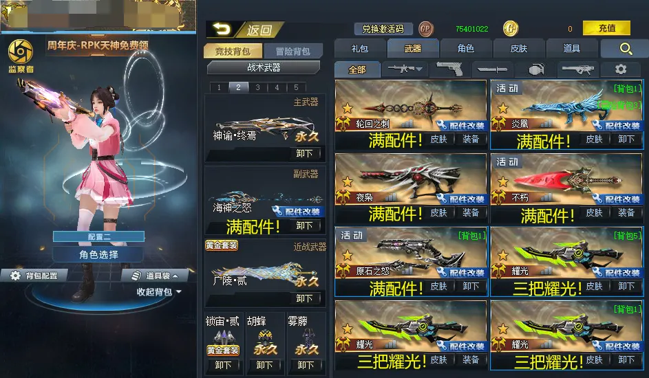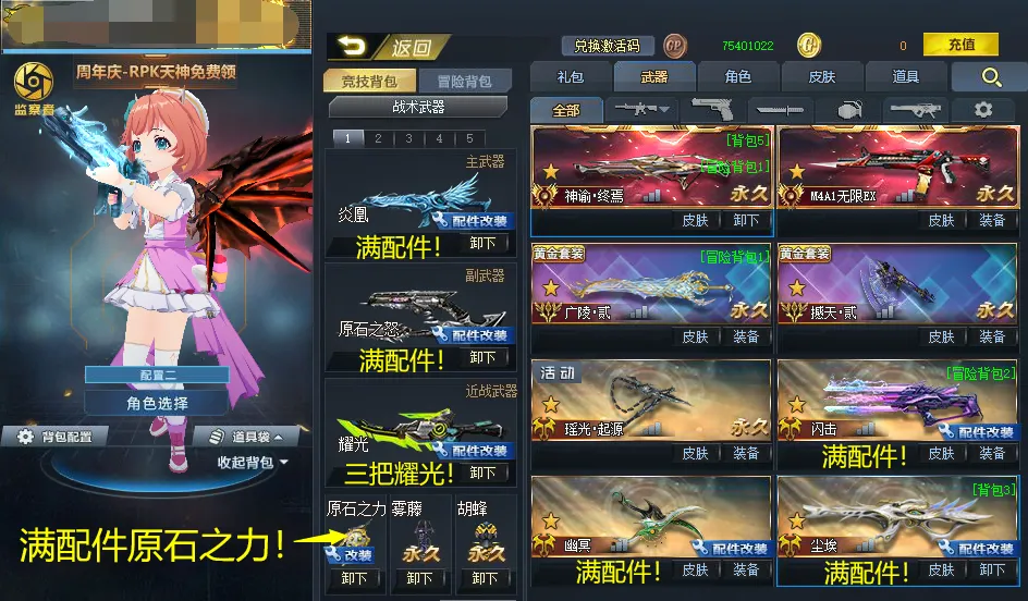 满配件武器:瑶光起源!三把耀光!闪击!尘埃!幽冥!轮回之刺!炎凰!夜枭!不朽!原石之怒!藏锋!双连拔幻锋!海神之怒!螳螂臂!原石之怒,1玄天!