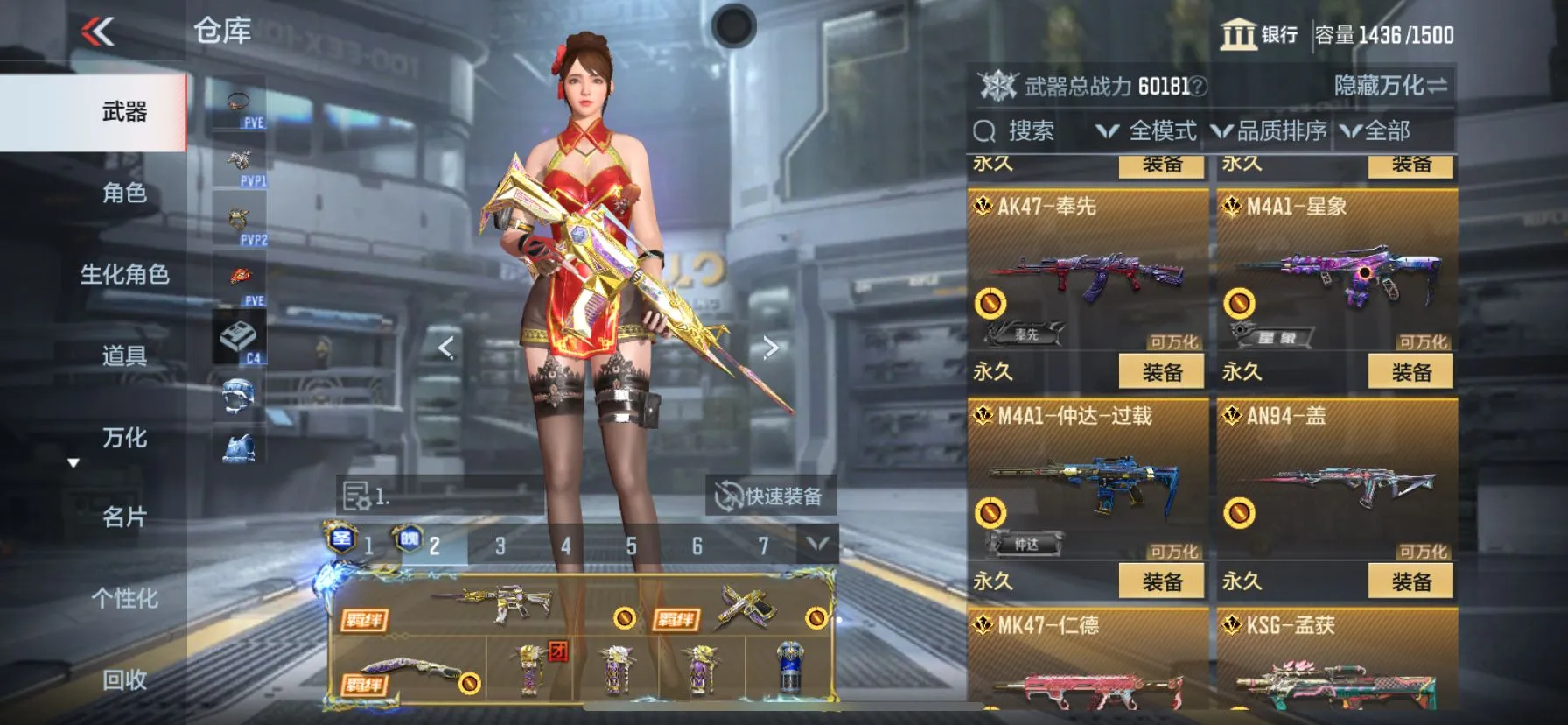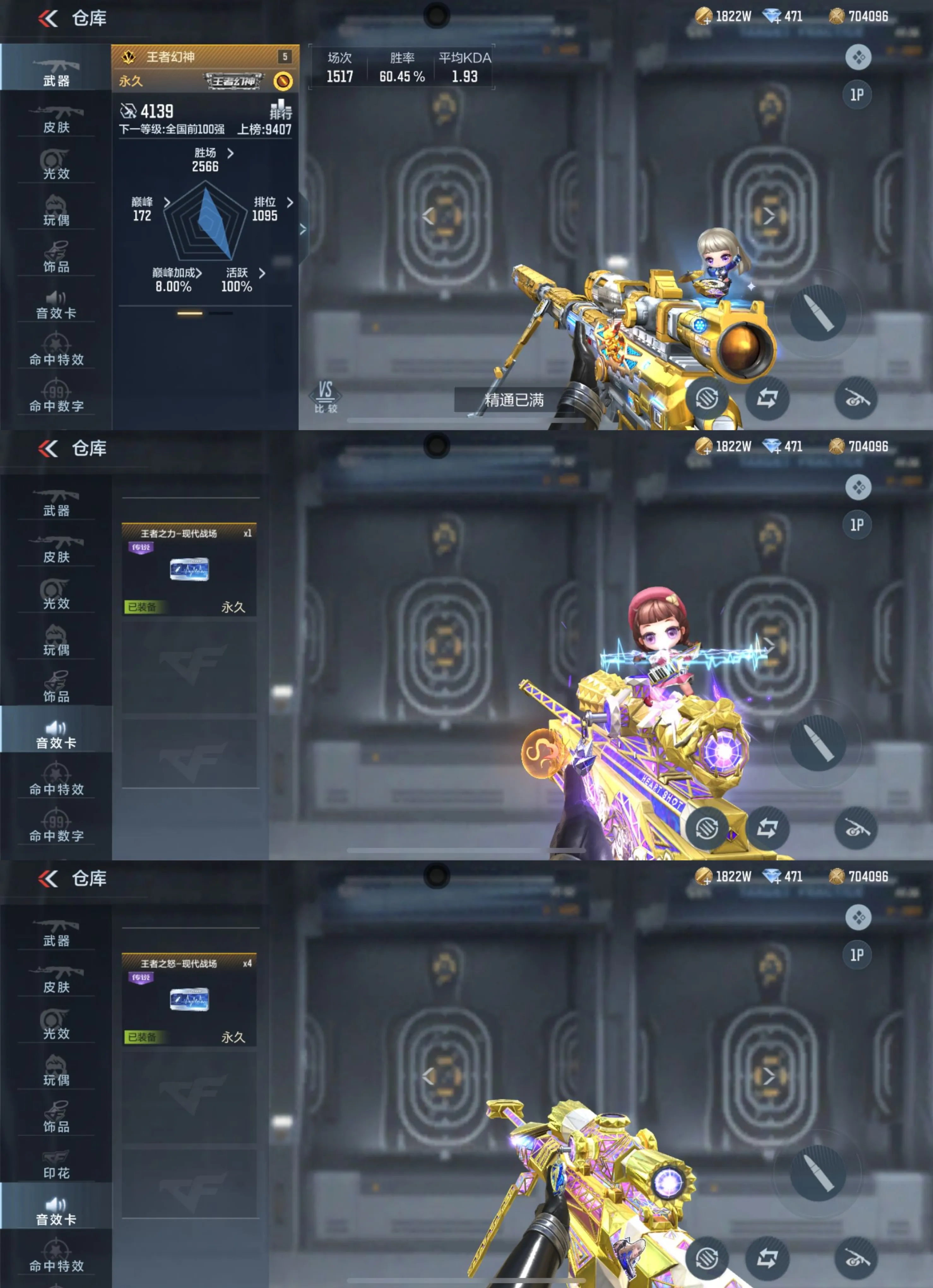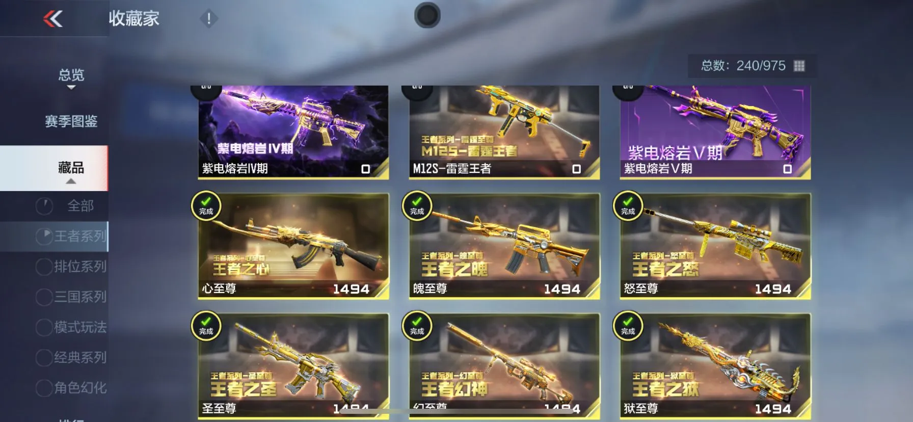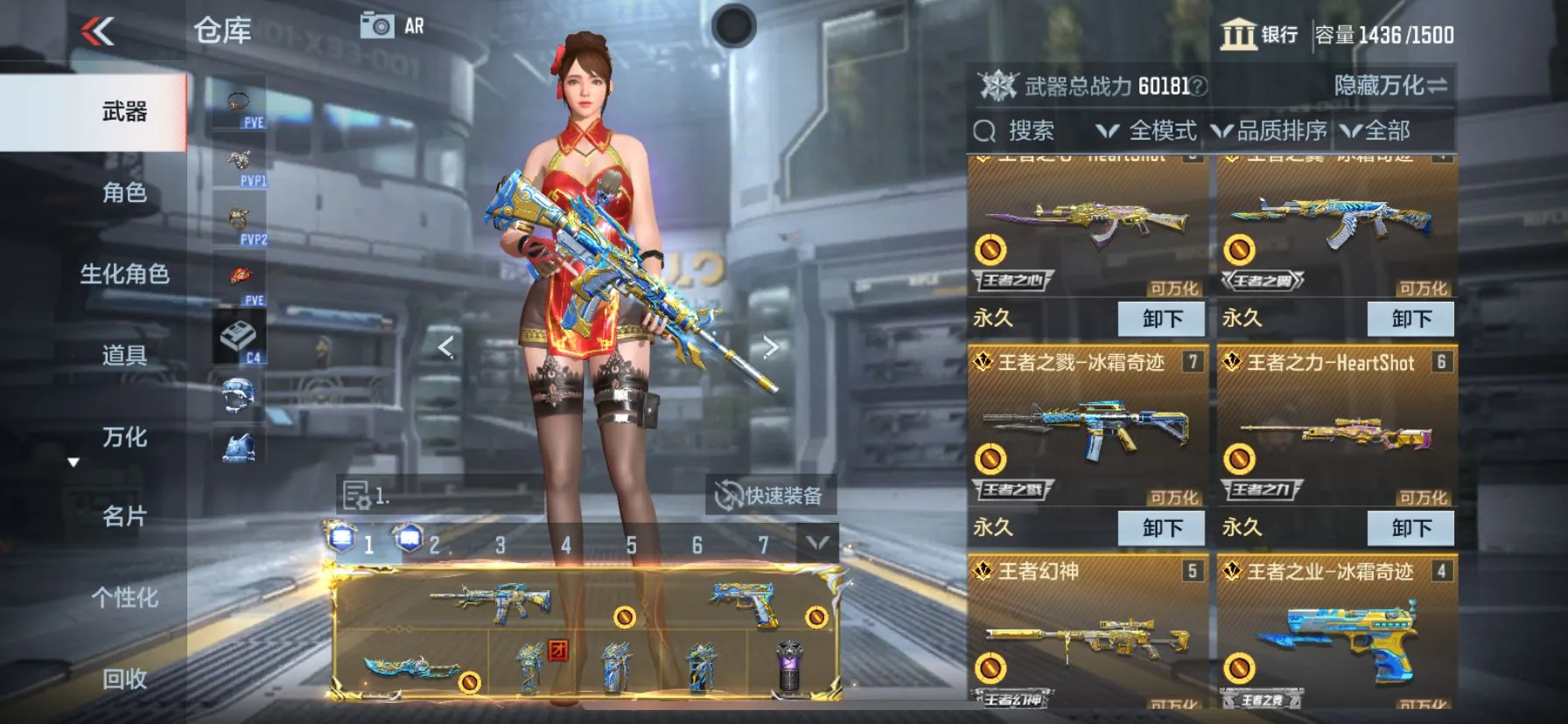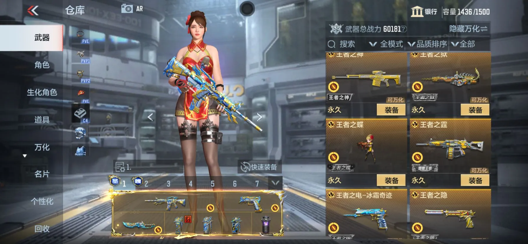 【武器】武器-王者之霆,武器-王者之魄,武器-王者之影,武器-王者之心,武器-王者之翼,武器-王者之戮,武器-王者之力,武器-王者之怒,武器-王者幻神,武器-王者之神,武器-王者之狱,武器-王者之业武器-王者之迹*4, 武器-王者之电,武器-王者之魂,武器-王者之隐,武器-王者之击,武器-王者之痕,武器-王者之啸,武器-王者之锋*2,武器-AN94-盖,武器-KSG-孟获,武器-AK47-奉先,武器-AK47-孟德,武器-AK47-波塞冬*2,武器-M4A1-仲达,武器-M4A1-星象,武器-M4A1-游骑兵*2,武器-MK47-仁德,武器-M200-幻神,武器-81式-光明之神,武器-MK47-云舞,武器-COP357-雷霆,武器-MK23-幻神*3,武器-炽芒蝶刃,武器-09式狙-天神,武器-09式狙-幻兽,武器-98K-血月,武器-98K-黑骑士*3,武器-9A91-天神,武器-AA12-火药,武器-AK12-天启武器-AK47-塔罗牌觉醒,武器-AK47-常胜,武器-AK47-幸运日觉醒,武器-AK47-无影,武器-AK47星速,武器-AK47-木兰,武器-AK47-死神,武器,AK47-沙漠郡主-二觉,武器-AK47-沙漠郡主一走武器-AK47-火麒麟,武器-AK47-破空冰刃,武器-AK47-血武士,武器-AK47-角斗士,武器-AK47-谜城烟火,武器-AK47-雅韵青花,武器-AK47-黑鲨