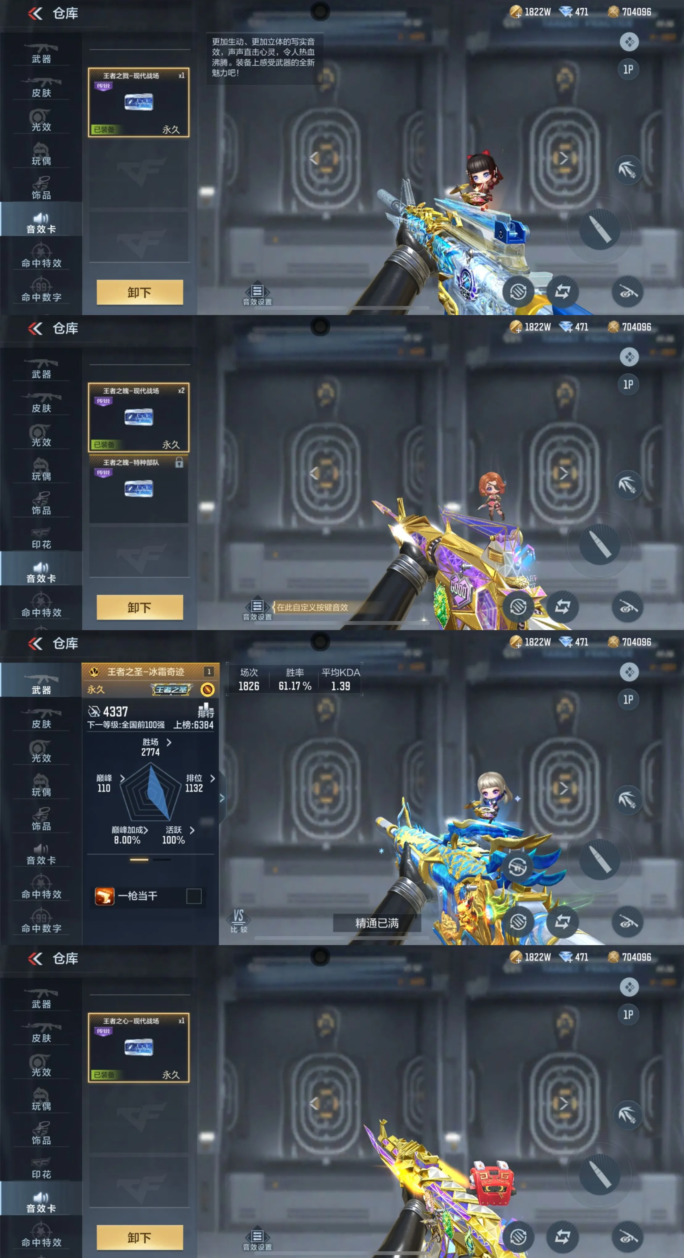 【音效卡】M4A1-仲达-现代战场*1,王者之力-现代战场*1,王者之戮-现代战场*1,王者之魄-现代战场*2,王者之心-现代战场*1,王者之怒-现代战场*4,巴雷特-毁灭-现代战场*2, AK47-无影-现代战场1,M4A1-雷神-电音*灯