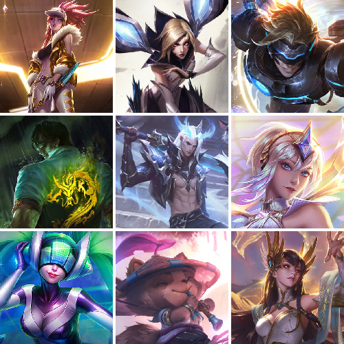 【传说皮肤】偶像歌手阿狸 律政大亨蒙多 战地机甲厄加特 源计划超体莫德凯撒 源计划毁灭派克 驯龙学者黑默丁格 星之守护者洛 星之守护者霞 灵魂莲华锤石 暗星锤石 天煞劫 真实伤害艾克 星之守护者金克丝 西部魔影卢锡安 西部天使赛娜 暗星尊烬 黑夜使者亚索 灌篮高手德莱厄斯 蔷薇绅士杰斯 霸天异形卡兹克 神王德莱厄斯 苍穹之光韦鲁斯 女校长菲奥娜 宇航员诺提勒斯 泳池派对吉格斯 星之守护者阿狸 符文战熊沃利贝尔 灵魂莲华阿狸 焰尾妖狐阿狸 耀星女神拉克丝 星之守护者拉克丝 枯萎之壤泽拉斯 冰霜亚龙希瓦娜 死亡骑士盖伦 黎明使者锐雯 月蚀骑士蕾欧娜 战斗学院伊泽瑞尔 腥红之月鬼武姬阿卡丽 炼狱魔犬内瑟斯 源计划净化薇恩 神龙尊者圣龙李青 神拳李青 第三类接触黑默丁格 丧尸布兰德 地狱行者孙悟空 冰川巨兽墨菲特 女警狙击凯特琳 战斗学院凯特琳 苹果机器人布里茨 最终BOSS维迦 女主播迦娜 黯晶凤凰艾尼维亚 电玩女神娑娜 绅士科加斯 恶魔之刃泰达米尔 西部天使艾希 烈焰雄心崔丝塔娜 女皇艾希 源计划联合艾希 驯龙炮手崔丝塔娜 约德尔国队长提莫 提莫约德尔人的一大步 恶魔男爵瑞兹 战场女武神凯尔 钢铁之翼凯尔 源计划林易 魔幻卡牌崔斯特 大天使长米迦勒凯尔 地狱之门卫士加里奥 铁哥们儿奥拉夫