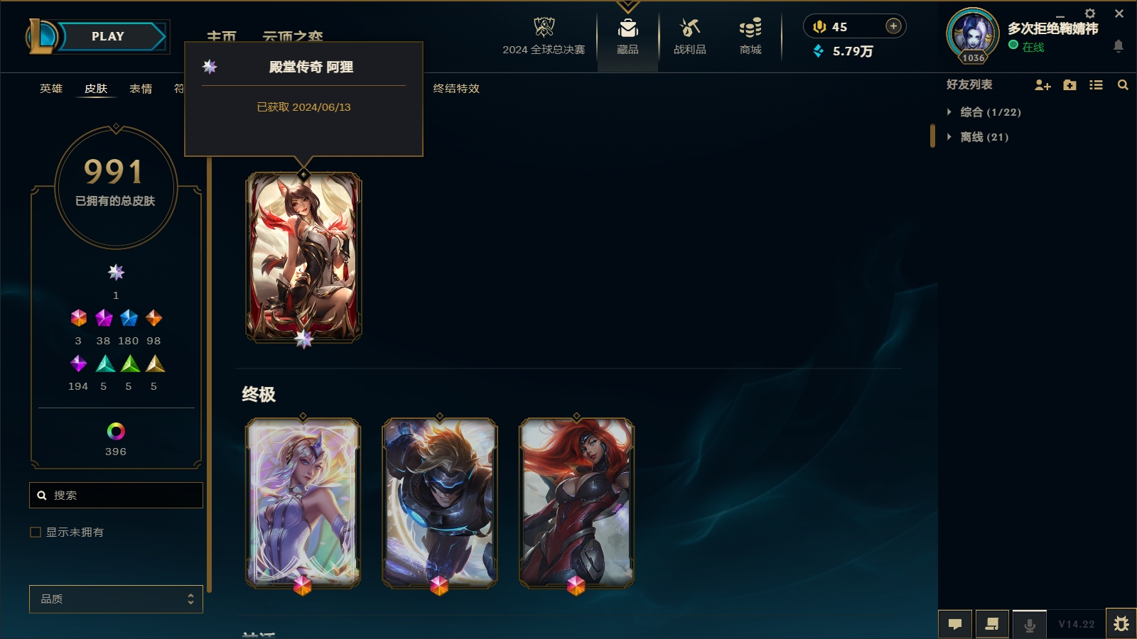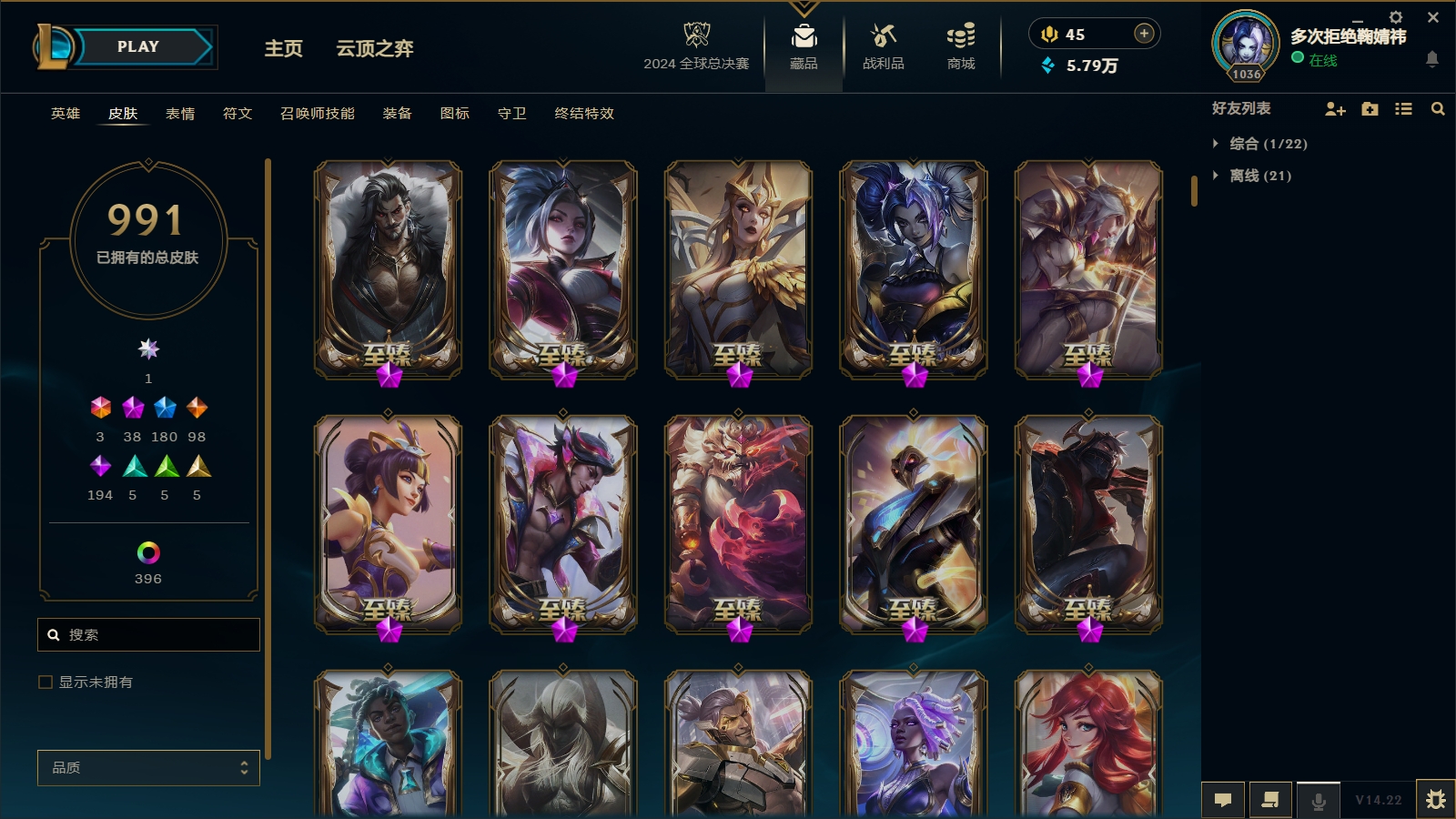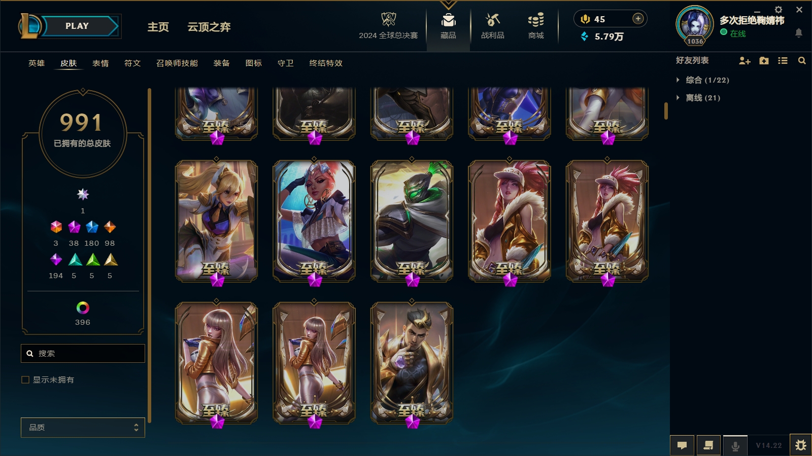 1600皮肤〓38至臻海克斯〓殿堂传奇阿狸〓穿星 摄魂龙瞎〓王国机神全套〓EDG全套〓神龙亚索天煞劫