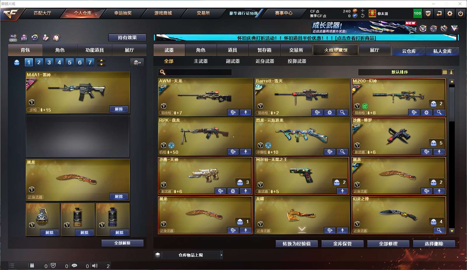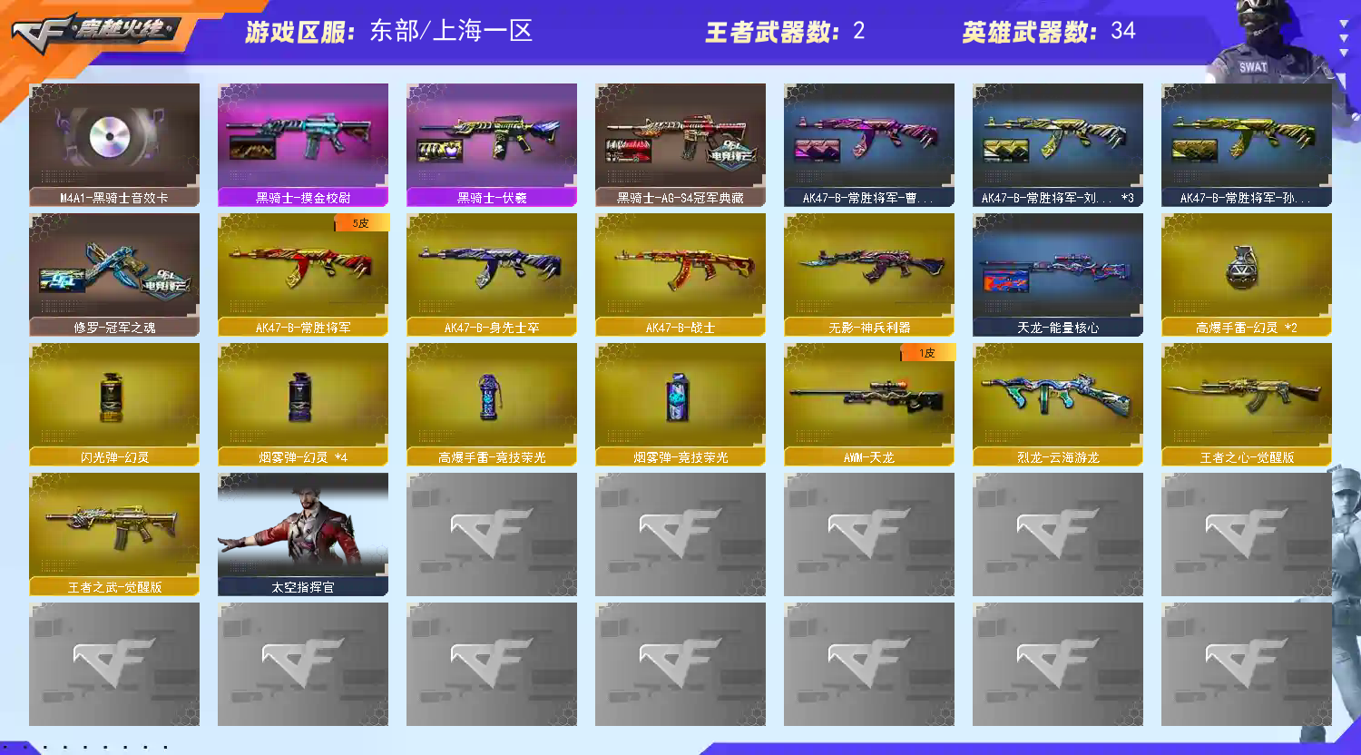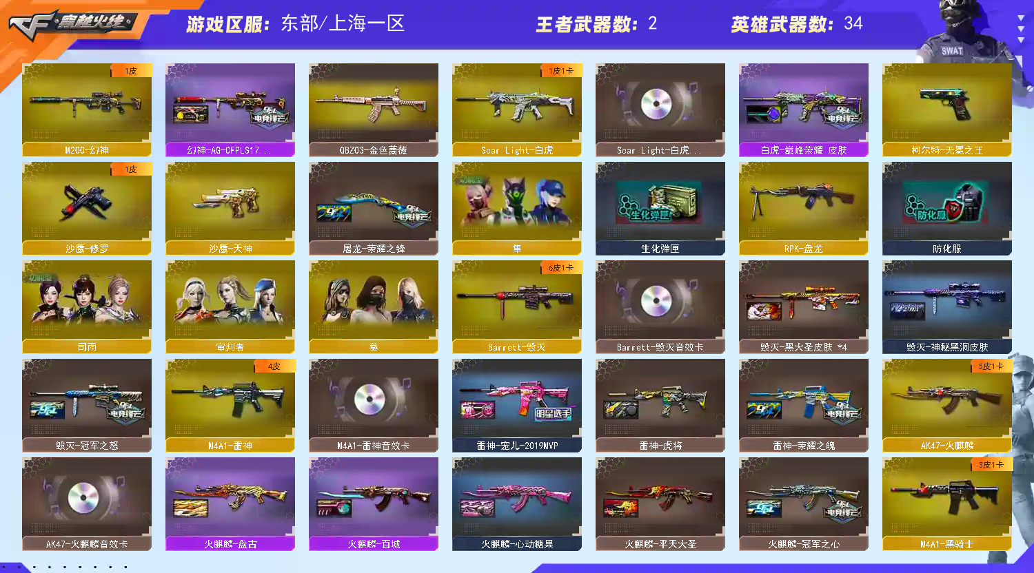 【白虎三件套!!!】【m200幻神+agcfpls17冠军皮肤+无冕之王】 【白虎+白虎音效卡+巅峰荣耀皮肤】 【qbz03金色蔷薇】 【王者之心 王者之武】【火麒麟+火麒麟音效卡+冠军之心皮肤】【雷神+雷神音效卡+宠儿皮肤+荣耀之魄皮肤】【黑骑士+黑骑士音效卡+s4典藏皮肤】【毁灭+毁灭音效卡+冠军之怒皮肤 】 【无影神兵利器 源雷神iii 战士 身先士卒 常胜将军 天龙 盘龙 烈龙】——【沙鹰修罗 沙鹰天神 柯尔特无冕之王】——【屠龙 龙啸 幻灵之锋 擎天竞技荣光 擎天云海游龙 龙啸】——【幻灵投掷武器套装*2 竞技荣光投掷武器套装】——【角色】【葵 审判者 司雨 隼 云海玲珑】