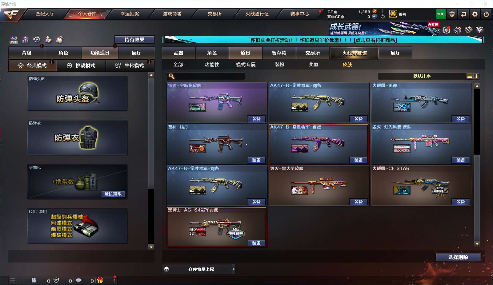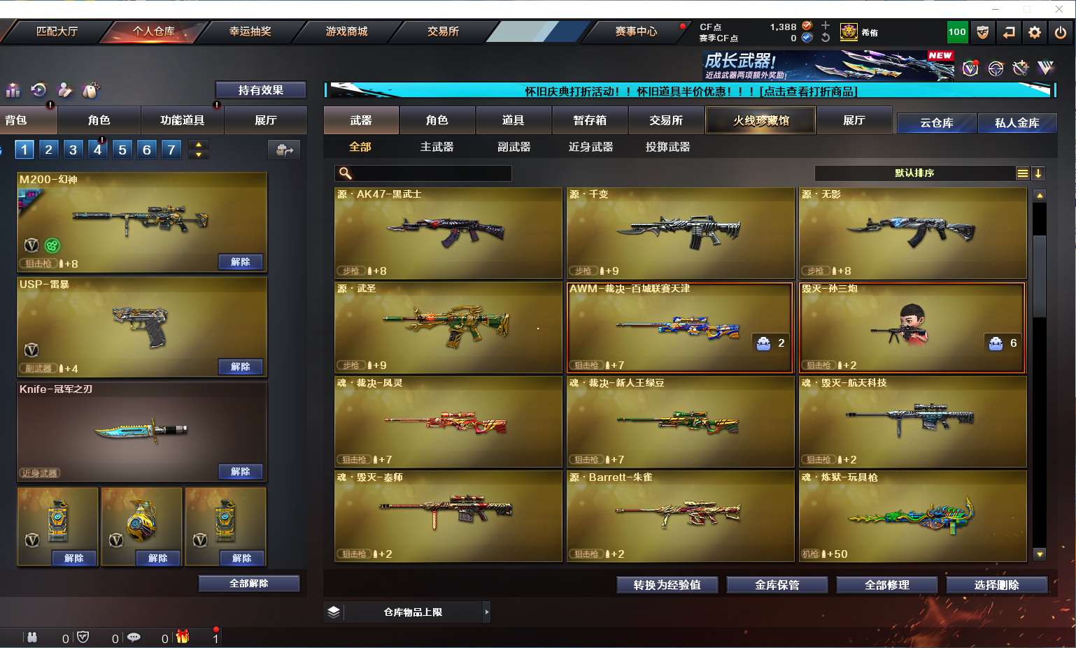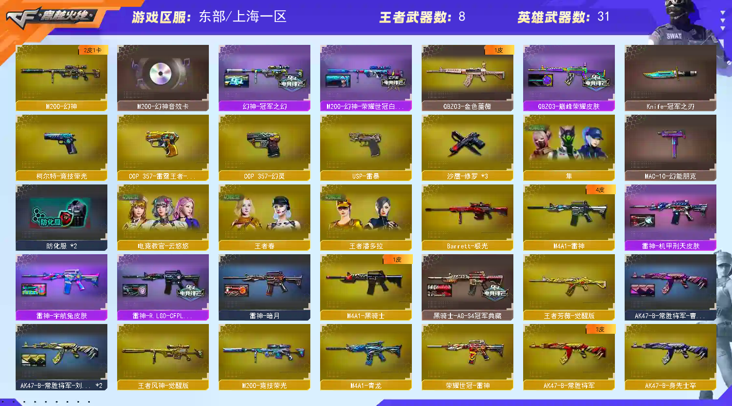 【幻神双皮三件套!!!】 【m200幻神+幻神音效卡+冠军之幻皮肤+荣耀世冠白鲨皮肤+usp雷暴+冠军之刃+4防云悠悠】【竞技荣光套装】 【王者风神】【qbz金色蔷薇+巅峰荣耀皮肤】 【王者芳薇】 【荣耀世冠雷神】 【雷神+cfpls18冠军皮肤】 【黑骑士+s4典藏皮肤】 【超新星 青龙 战士 战神 身先士卒 常胜将军 极光】——【usp雷暴 cop357幻灵 柯尔特竞技荣光 沙鹰修罗】——【屠龙 擎天竞技荣光 雷霆王者之锋 龙啸烈火龙威】——【幻灵投掷武器套装 竞技荣光投掷武器套装 雷霆王者投掷武器套装】——【热门武器/小人呛】【毁灭孙三炮 awm灵狐15周年嘉年华】——【角色】【4防(云悠悠 隼 王者春 王者潘多拉)】