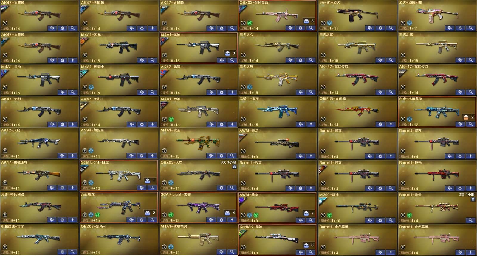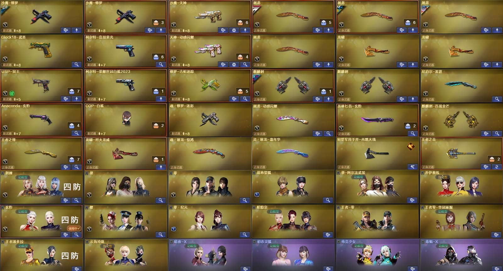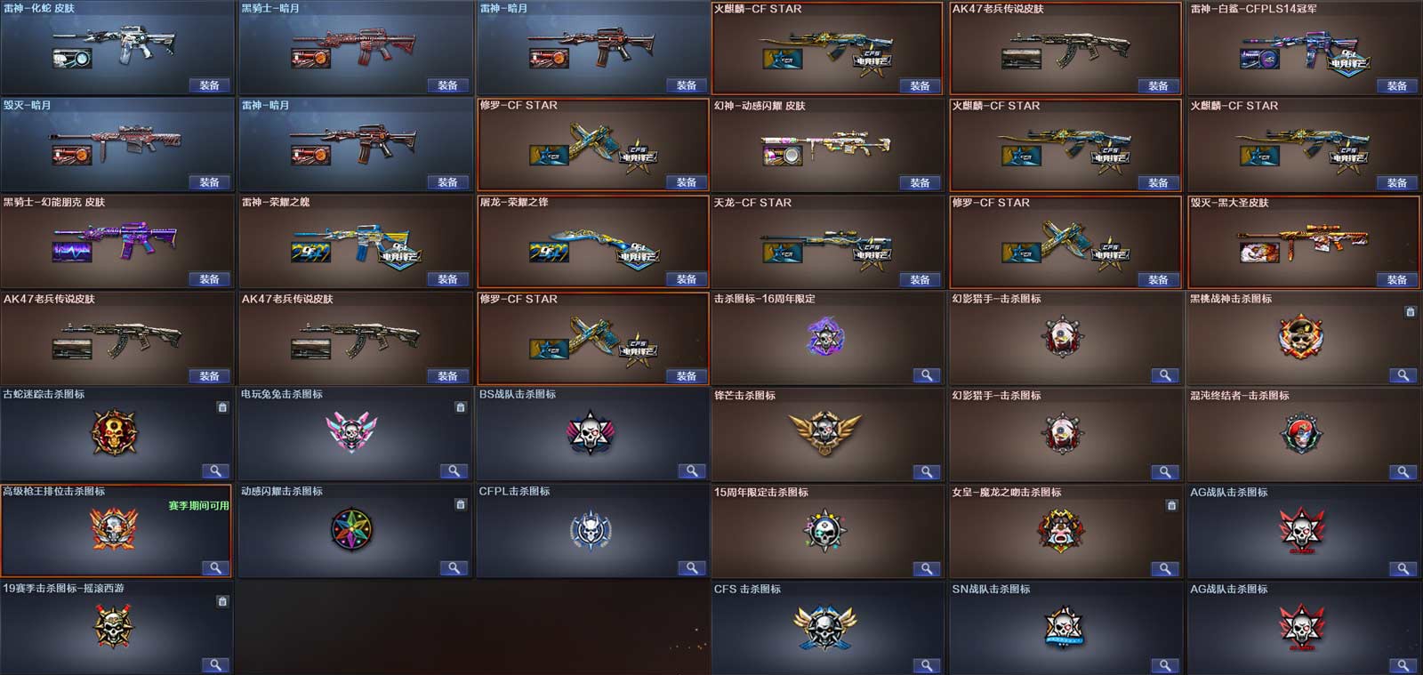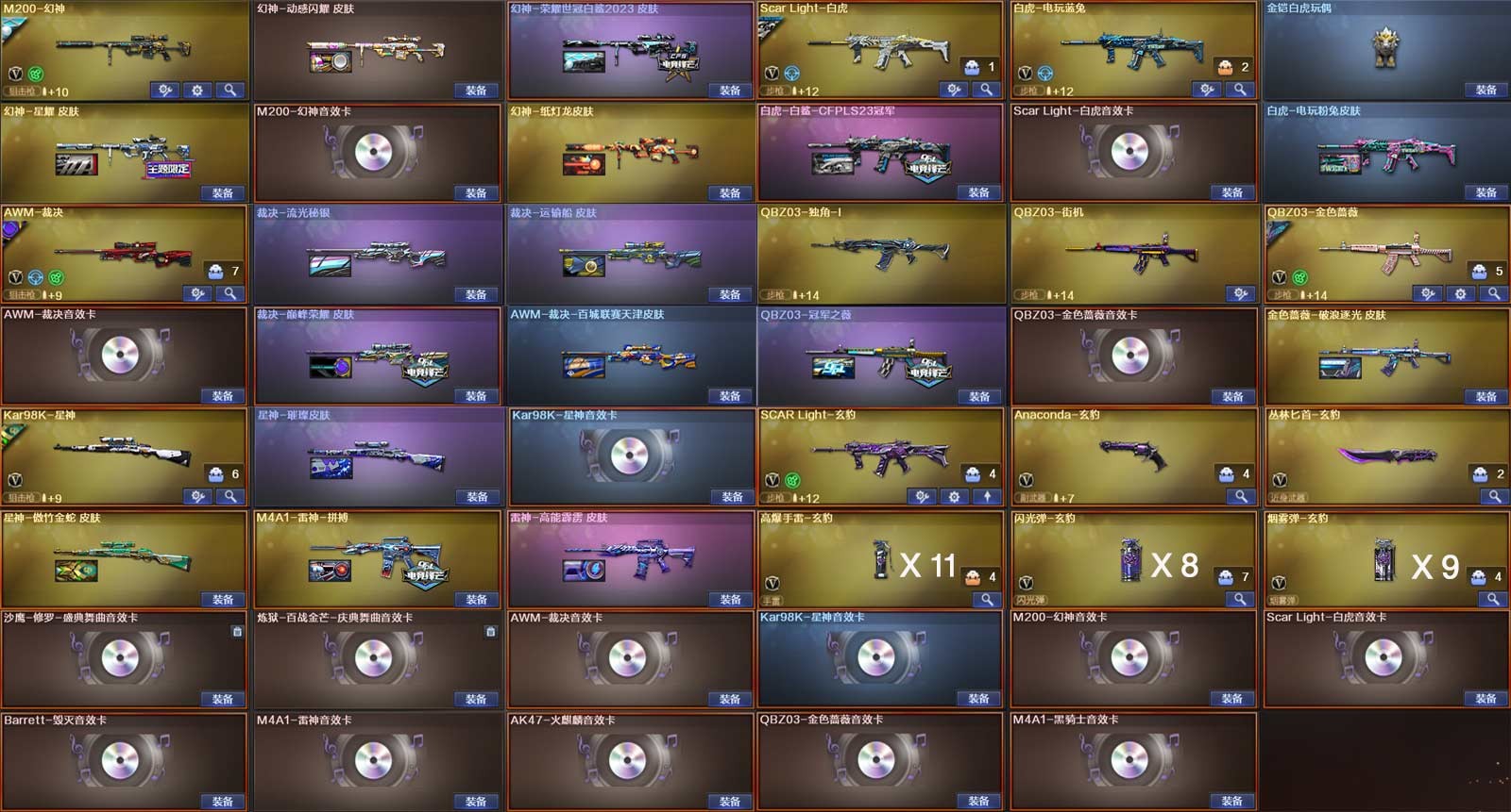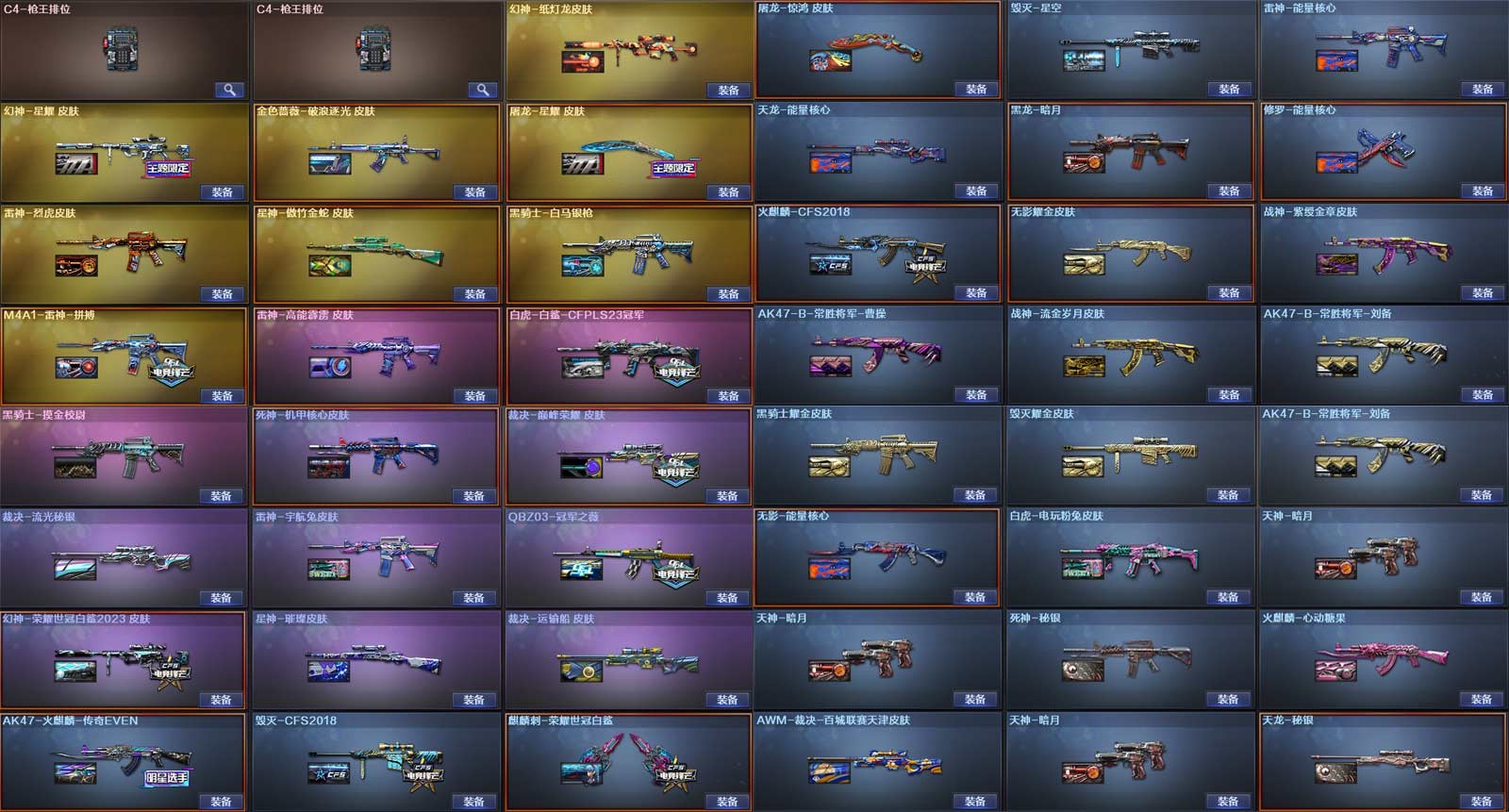 多四防角色,各种皮肤武器光效玩偶道具,欢迎来体验!武器太多,截不了那么多图!【此号全部装备太多截不了太多图,还有很多神器未截图,普通CF点武器也是一百多个就不截图了(满背包满道具爆破、生化、挑战武器应有尽有多个玩偶主流武器多光效),主流枪械都有皮肤】