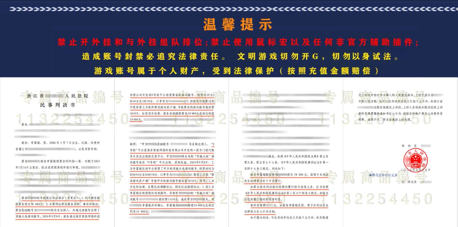 游戏账号属于个人财产,受到法律保护(如有封禁按照充值金额赔偿)