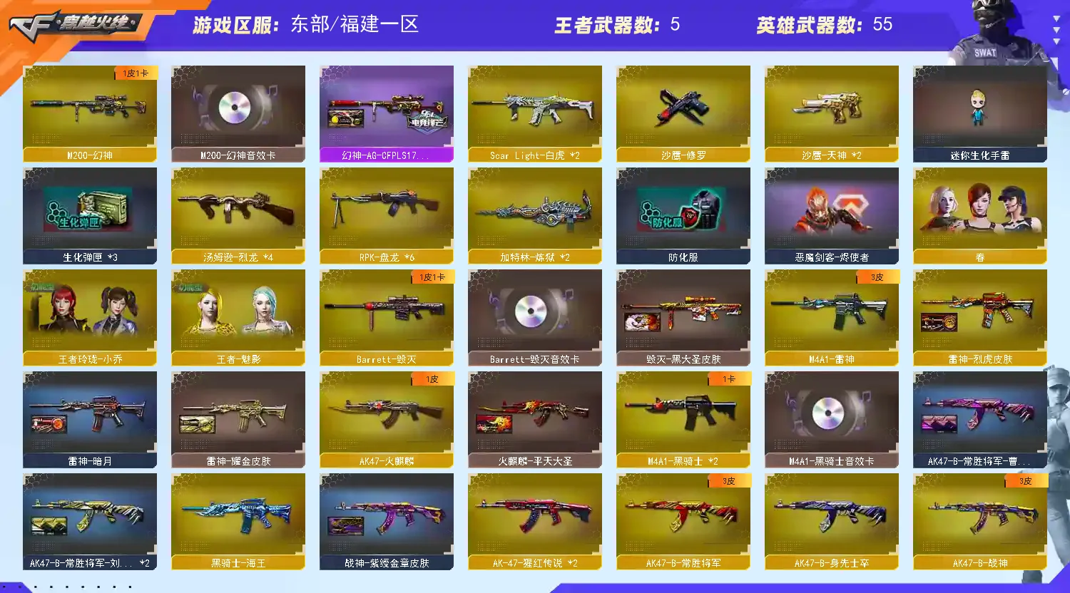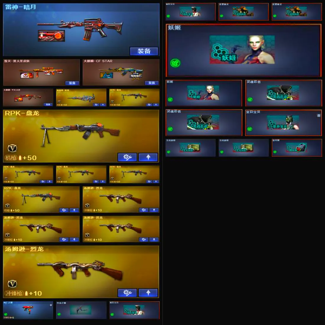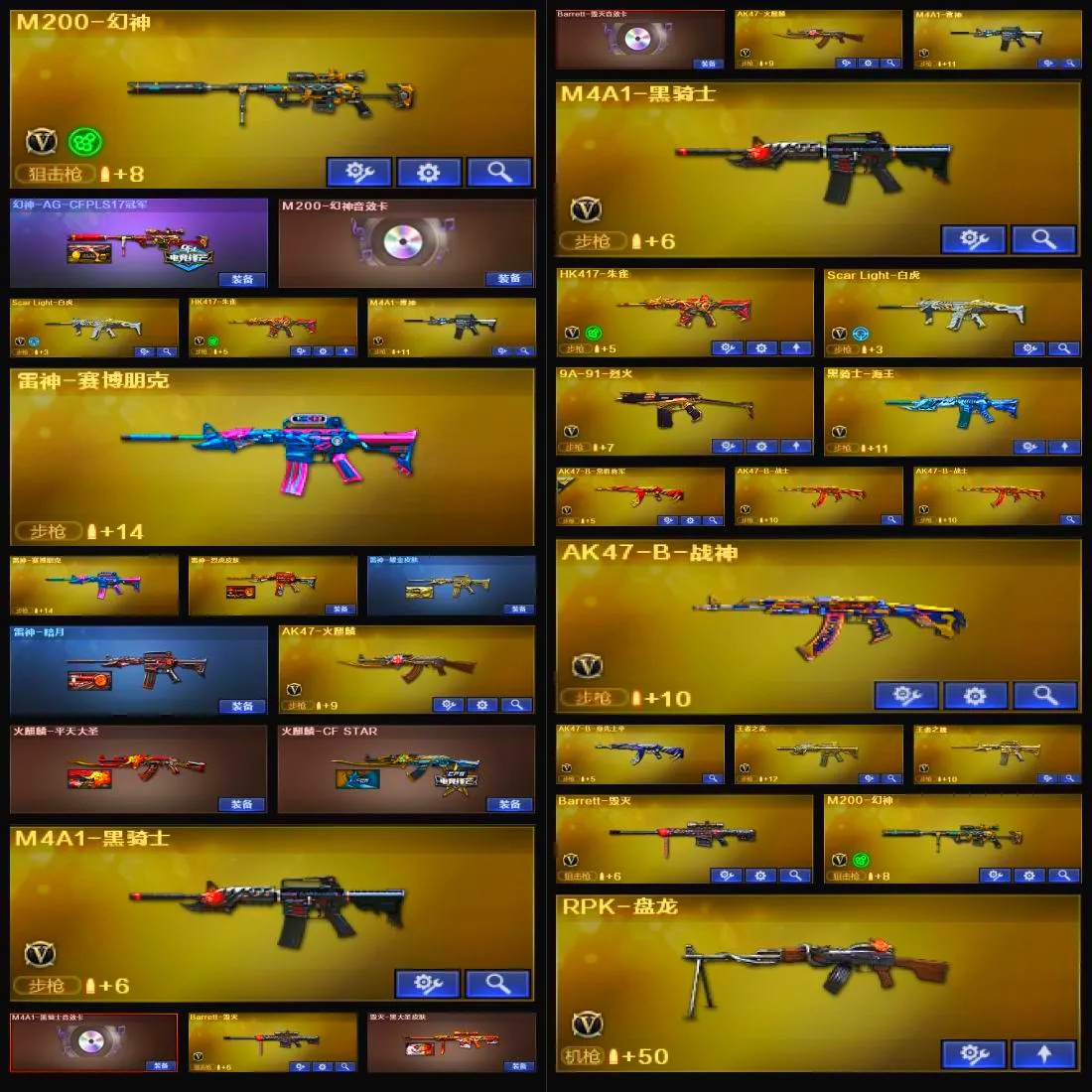 【幻神三件套】【幻神1皮】【死亡之眼】【6盘龙】【幻灵套装X7套】【夜魔套装X1套】【M200-幻神】【幻神-AG-CFPLS17冠军】【M200-幻神音效卡】【Scar Light-白虎】【HK417-朱雀】【加特林-炼狱】【RPK-盘龙】【汤姆逊-烈龙】【死亡之眼】【春】【王者-魅影】【王者玲珑-小乔】【M4A1-雷神】【雷神-赛博朋克】【雷神-烈虎皮肤】【雷神-耀金皮肤】【雷神-暗月】【AK47-火麒麟】【火麒麟-平天大圣】【火麒麟-CFSTAR】【火麒麟-雷神】【M4A1-黑骑士】【黑骑士-摸金校尉】【M4A1-黑骑士音效卡】【Barrett-毁灭】【毁灭-黑大圣皮肤】【Barrett-毁灭音效卡】