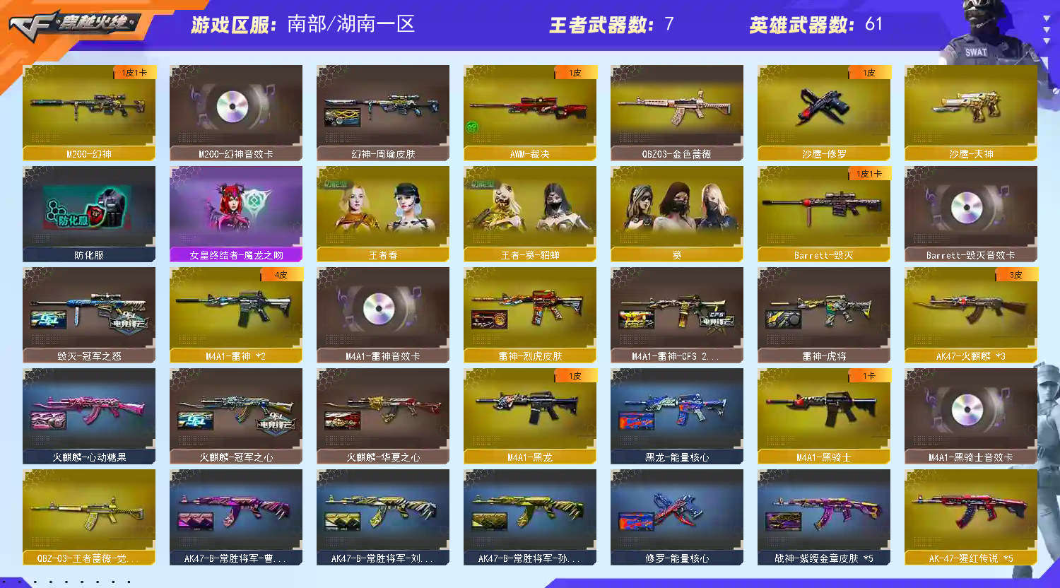 幻神三件套 幻神+周瑜+音效卡 QBZ王者蔷薇觉醒版 王者之魄觉醒版 王者之怒 王者春 王者葵貂蝉 王者零传说之路 毁灭+冠军之怒+音效卡 雷神+CFS 2019+音效卡 黑骑士+音效卡 火麒麟+冠军之心 QBZ金色蔷薇 炼狱悦蓝 炫金毁灭