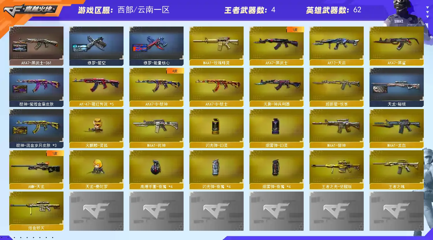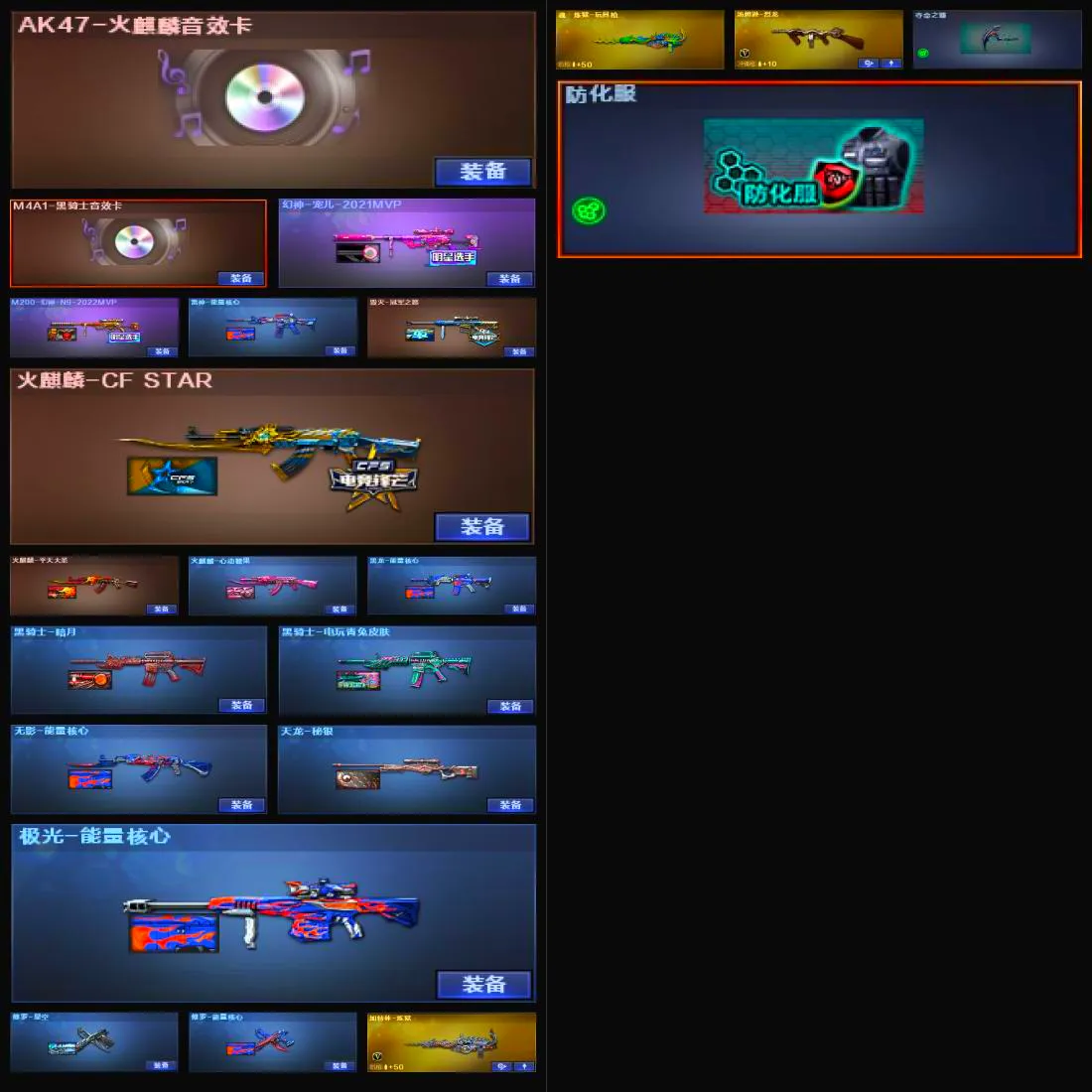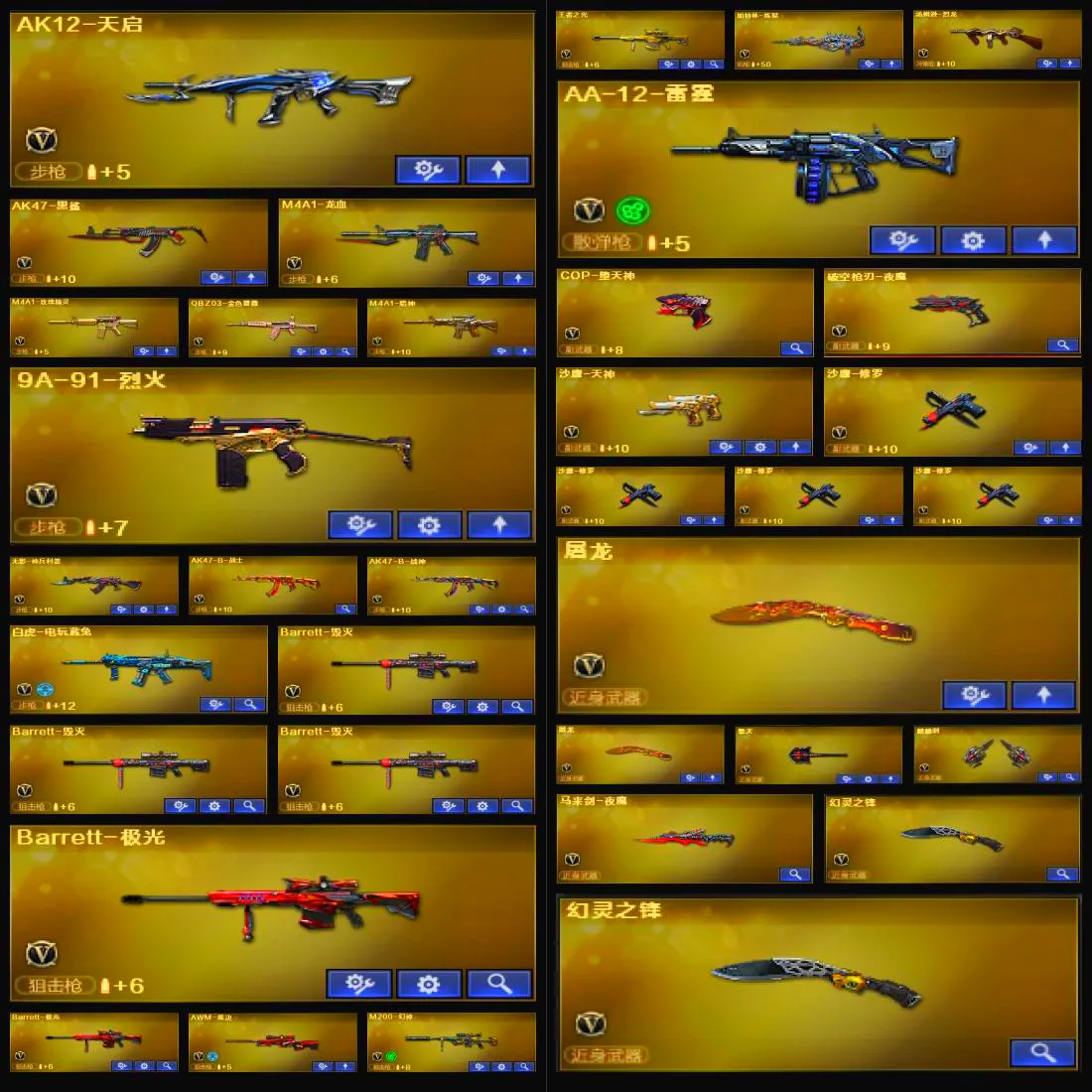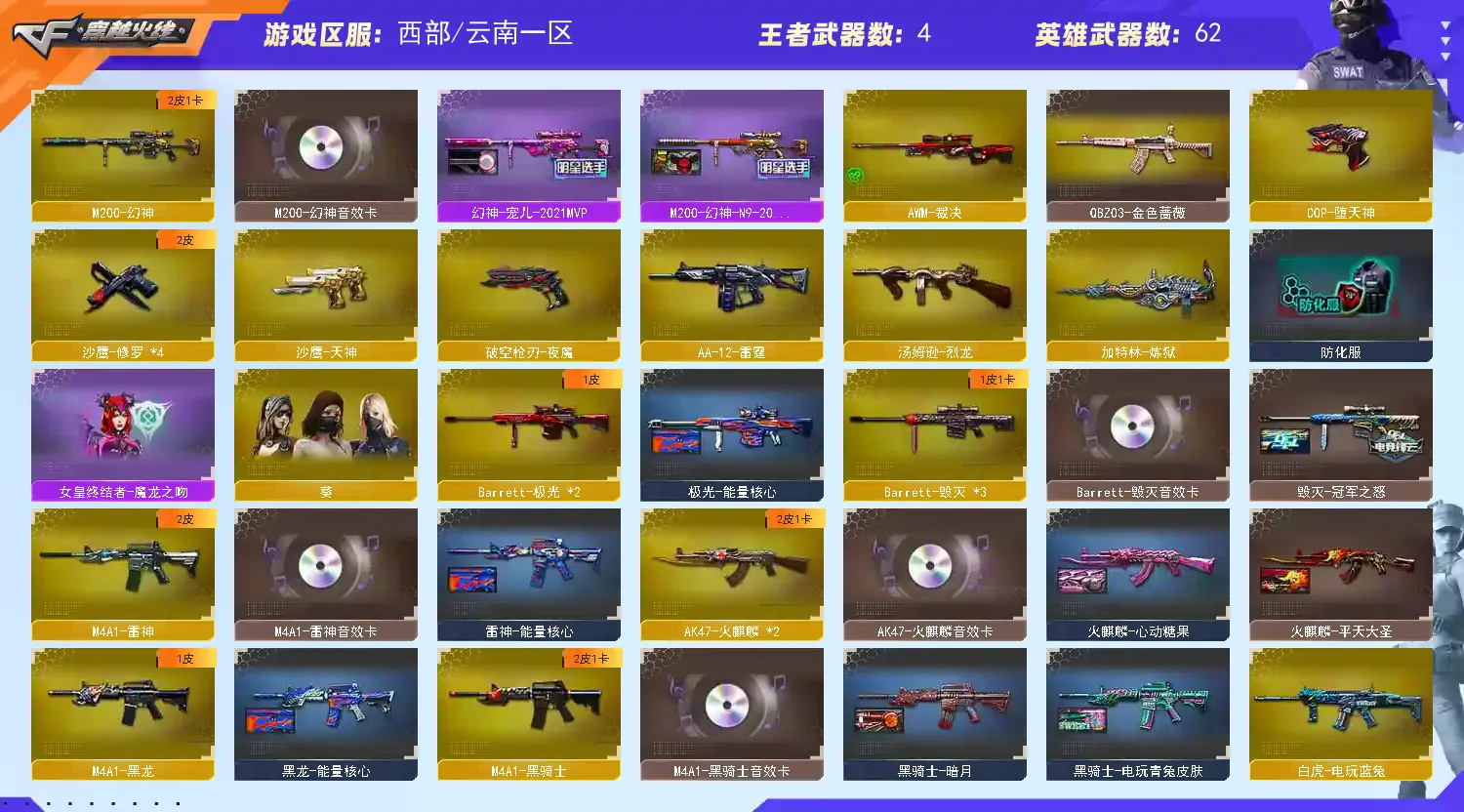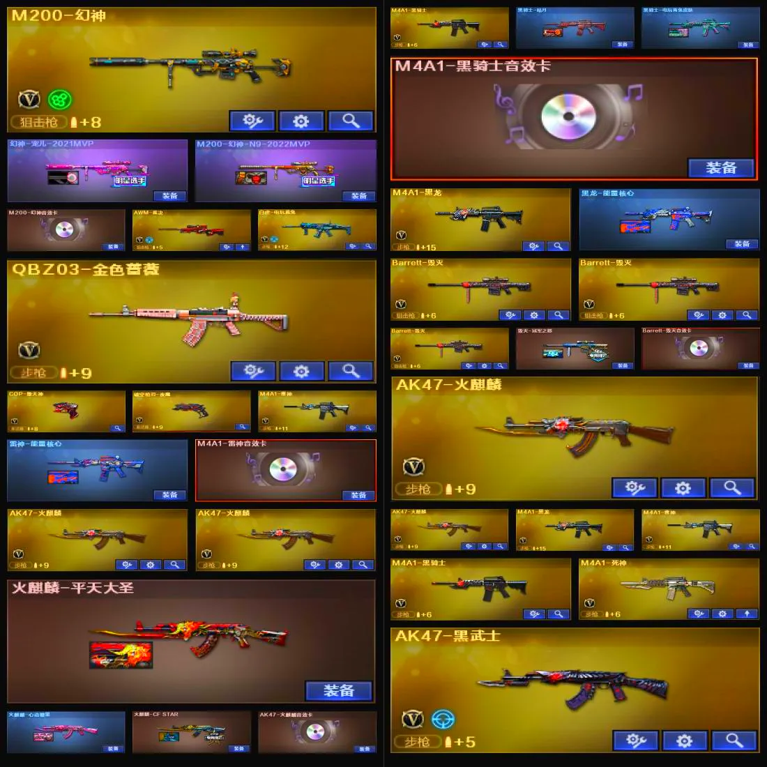 【幻神三件套】【幻神2皮】【夜魔套装X4套】【M200-幻神】【幻神-宠儿-2021MVP】【M200-幻神-N9-2022MVP】【M200-幻神音效卡】【AWM-裁决】【白虎-电玩蓝兔】【QBZ03-金色蔷薇】【COP-堕天神】【破空枪刃-夜魔】【加特林-炼狱】【魂·炼狱-玩具枪】【汤姆逊-烈龙】【葵】【M4A1-雷神】【雷神-能量核心】【M4A1-雷神音效卡】【AK47-火麒麟】【火麒麟-平天大圣】【火麒麟-心动糖果】【火麒麟-CFSTAR】【火麒麟-雷神】【AK47-火麒麟音效卡】【M4A1-黑骑士】【黑骑士-暗月】【黑骑士-电玩青兔皮肤】【M4A1-黑骑士音效卡】【M4A1-黑龙】【黑龙-能量核心】【Barrett-毁灭】【毁灭-冠军之怒】【Barrett-毁灭音效卡】