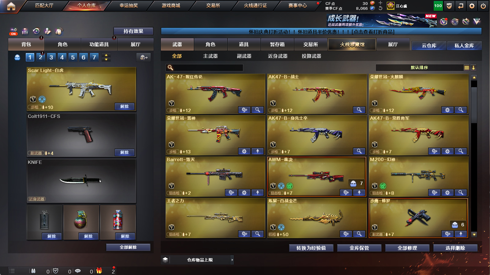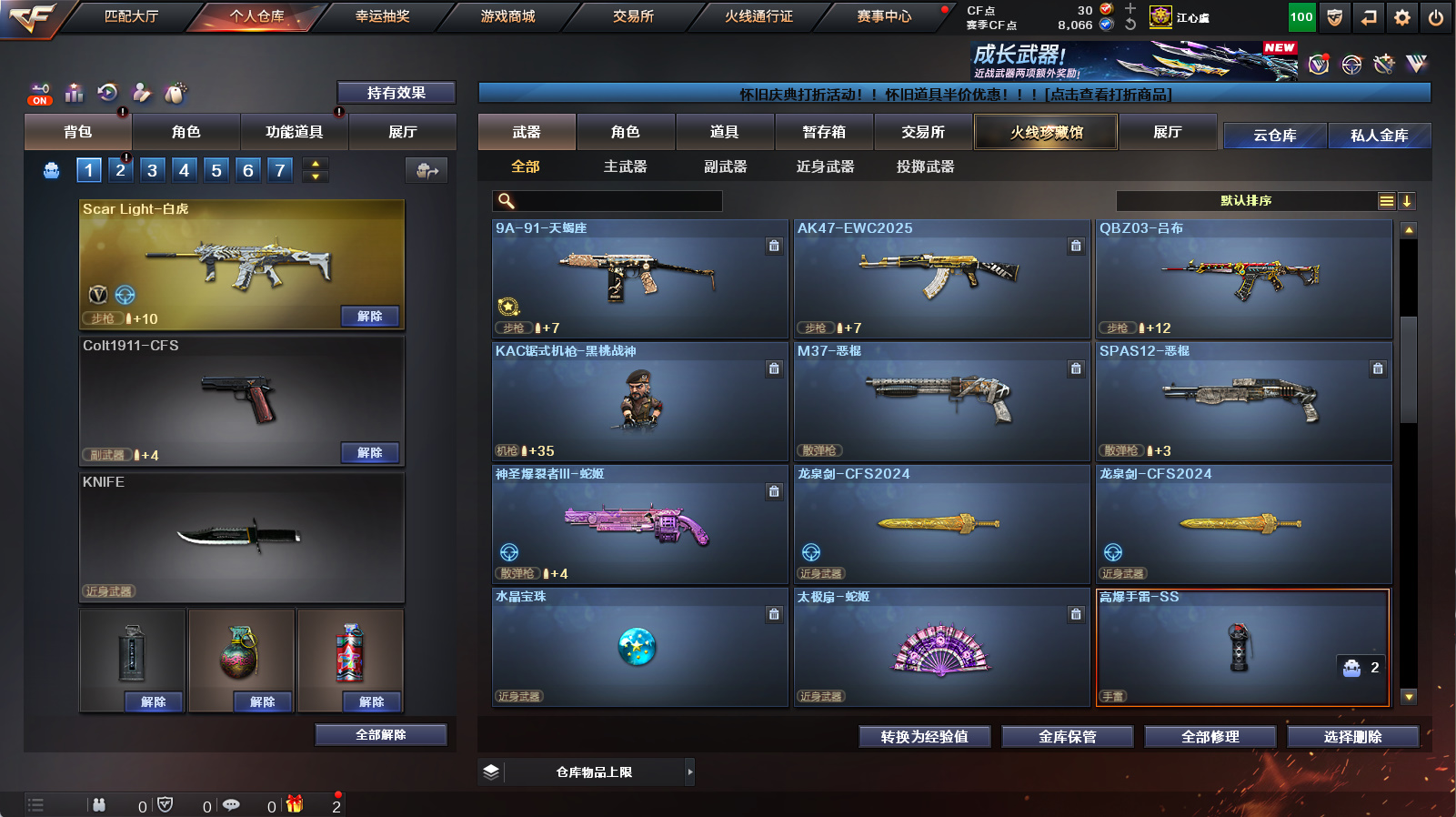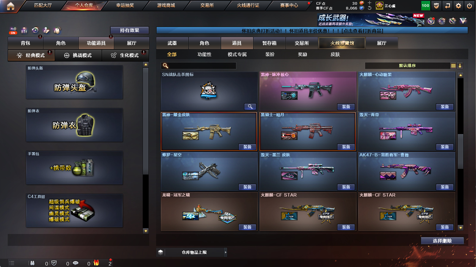 【传说星骇】【m200幻神】【usp冥王】【裁决+裁决音效卡】【白虎+朱雀】【王者凌虎】【金色蔷薇】【毁灭青帝】【黑骑士音效卡+炼狱百战金芒庆典舞曲音效卡】【四防王者瞳闭月羞花+满配阿尔法武装+满配蛇隐宗+女战神】【火麒麟+雷神+黑骑士+毁灭】【朱雀蛇隐宗+cop旗袍】【1911大黄蜂】【猫猫手套】【闪光护目镜+超级背包+炫彩背包】【工具钳+手雷包】