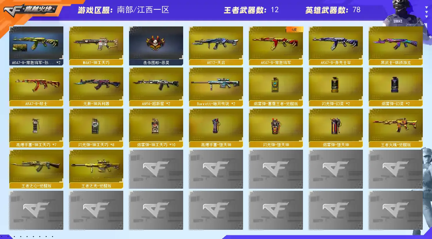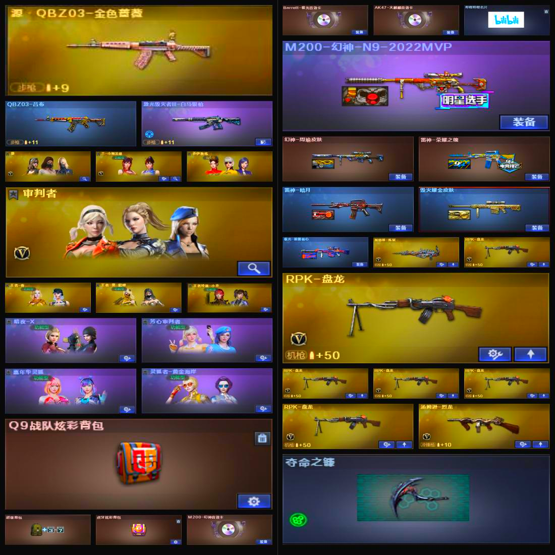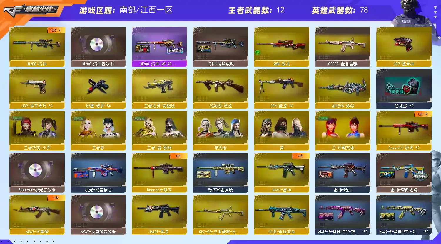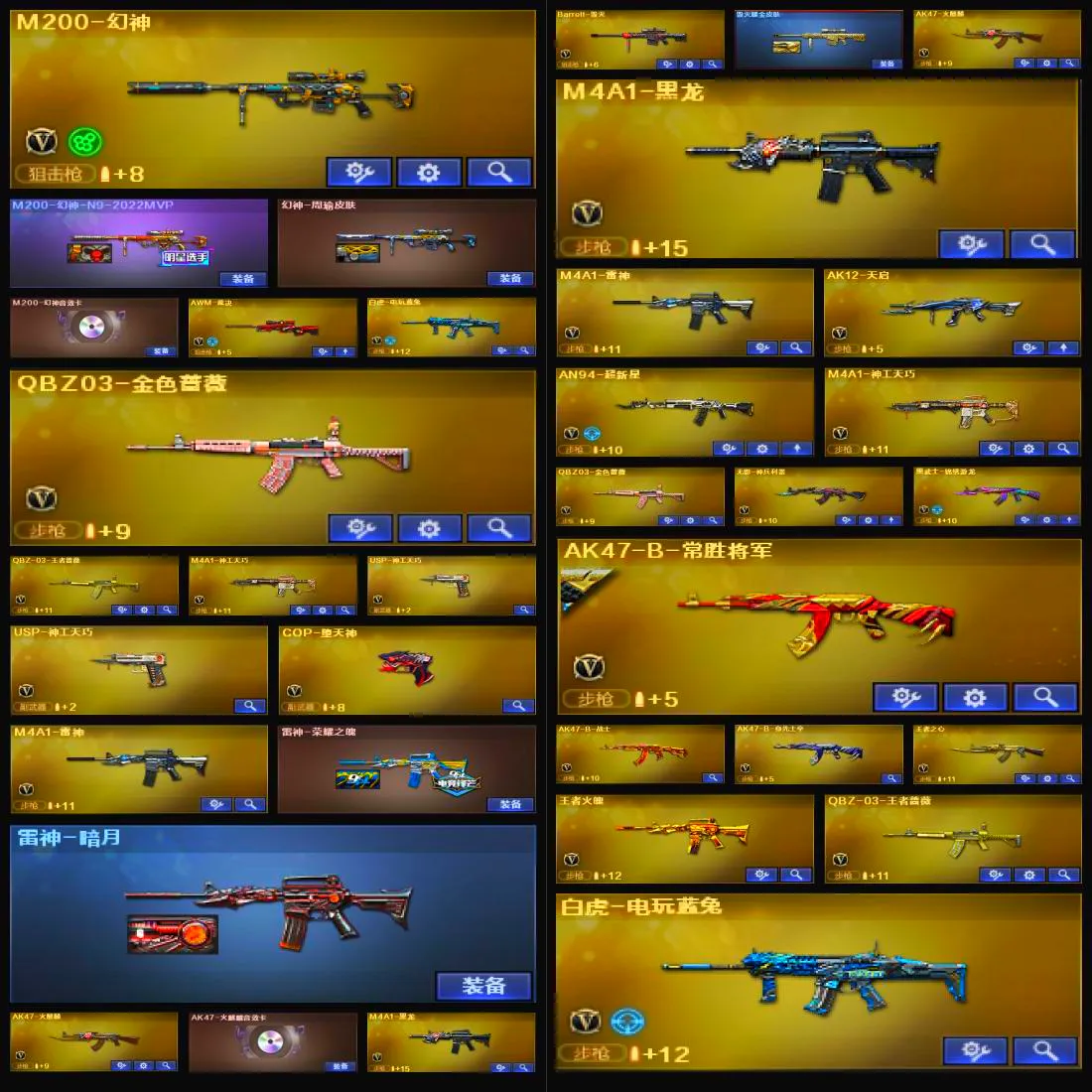 【幻神三件套】【幻神2皮】【6盘龙】【神工天巧套装X7套】【堕天神套装X1套】【堕天神套装X1套】【M200-幻神】【M200-幻神-N9-2022MVP】【幻神-周瑜皮肤】【M200-幻神音效卡】【AWM-裁决】【白虎-电玩蓝兔】【QBZ03-金色蔷薇】【QBZ-03-王者蔷薇-觉醒版】【M4A1-神工天巧】【USP-神工天巧】【COP-堕天神】【加特林-炼狱】【RPK-盘龙】【汤姆逊-烈龙】【葵】【兰-巾帼英雄】【乔伊教练】【审判者】【王者春】【王者-葵-貂蝉】【王者玲珑-小乔】【M4A1-雷神】【雷神-荣耀之魄】【雷神-暗月】【AK47-火麒麟】【AK47-火麒麟音效卡】【M4A1-黑龙】【Barrett-毁灭】【毁灭耀金皮肤】