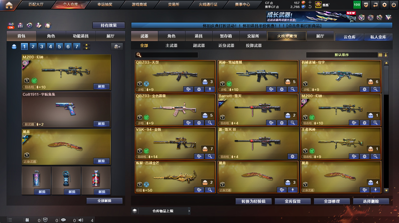 【m200幻神+幻神宠儿+幻神n9】【觉醒王者风神】【隼+太极扇火凤】【金蚀】【天罚+天罚音效卡】【金色蔷薇+金色蔷薇音效卡】【雷神宠儿+毁灭ag冠军+屠龙荣耀之锋】【碧霄极光音效卡+炼狱百战金芒庆典舞曲音效卡+死神雪域霜狐怀旧音效卡】【机械姬+隐+满配阿尔法武装+四防王者潘多拉+四防灵狐者职业经理】【毁灭】【火麒麟零纪元】【1911大黄蜂】【闪光护目镜+炫彩背包】【a背包扩展卷】【工具钳+手雷包】