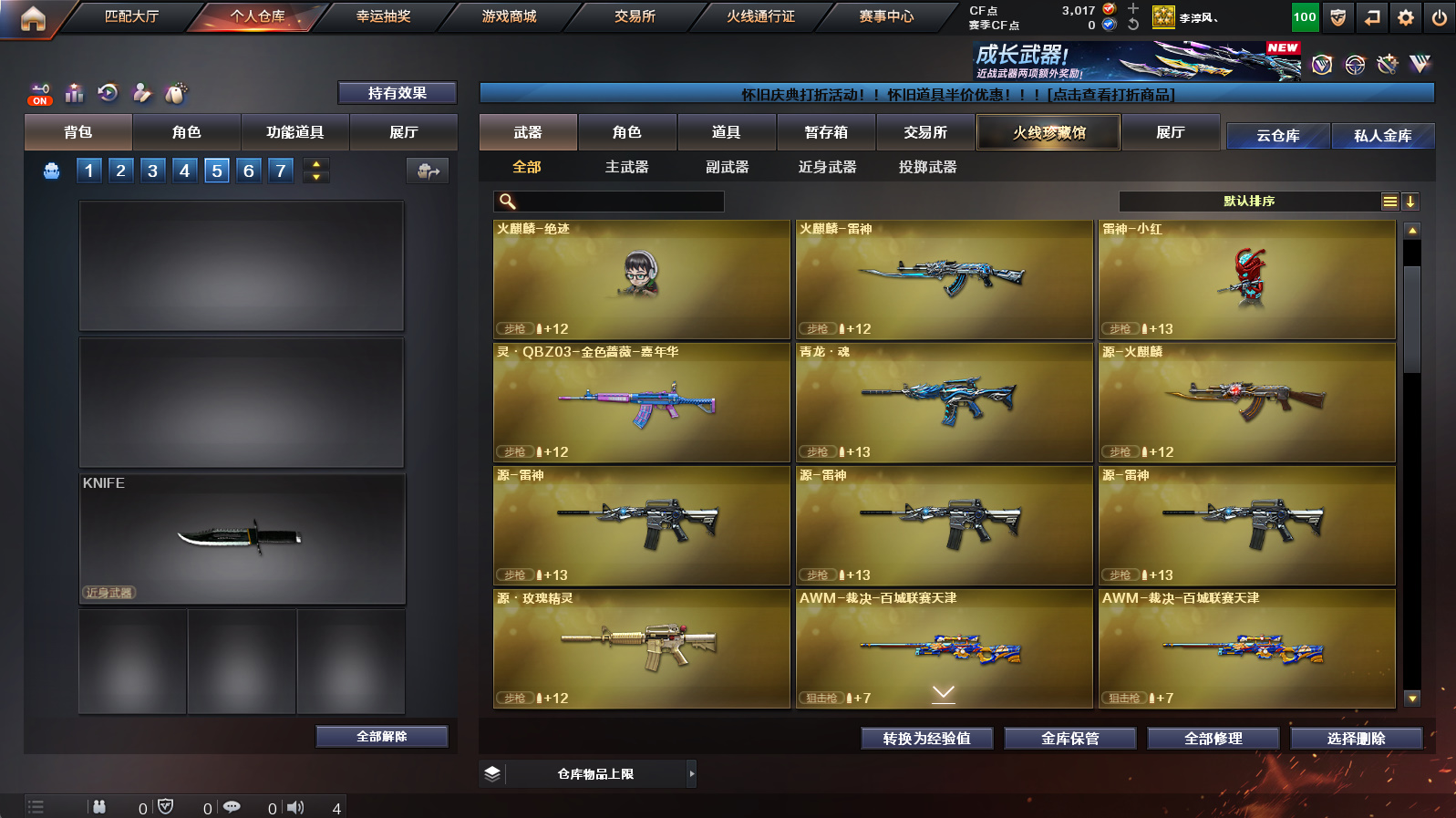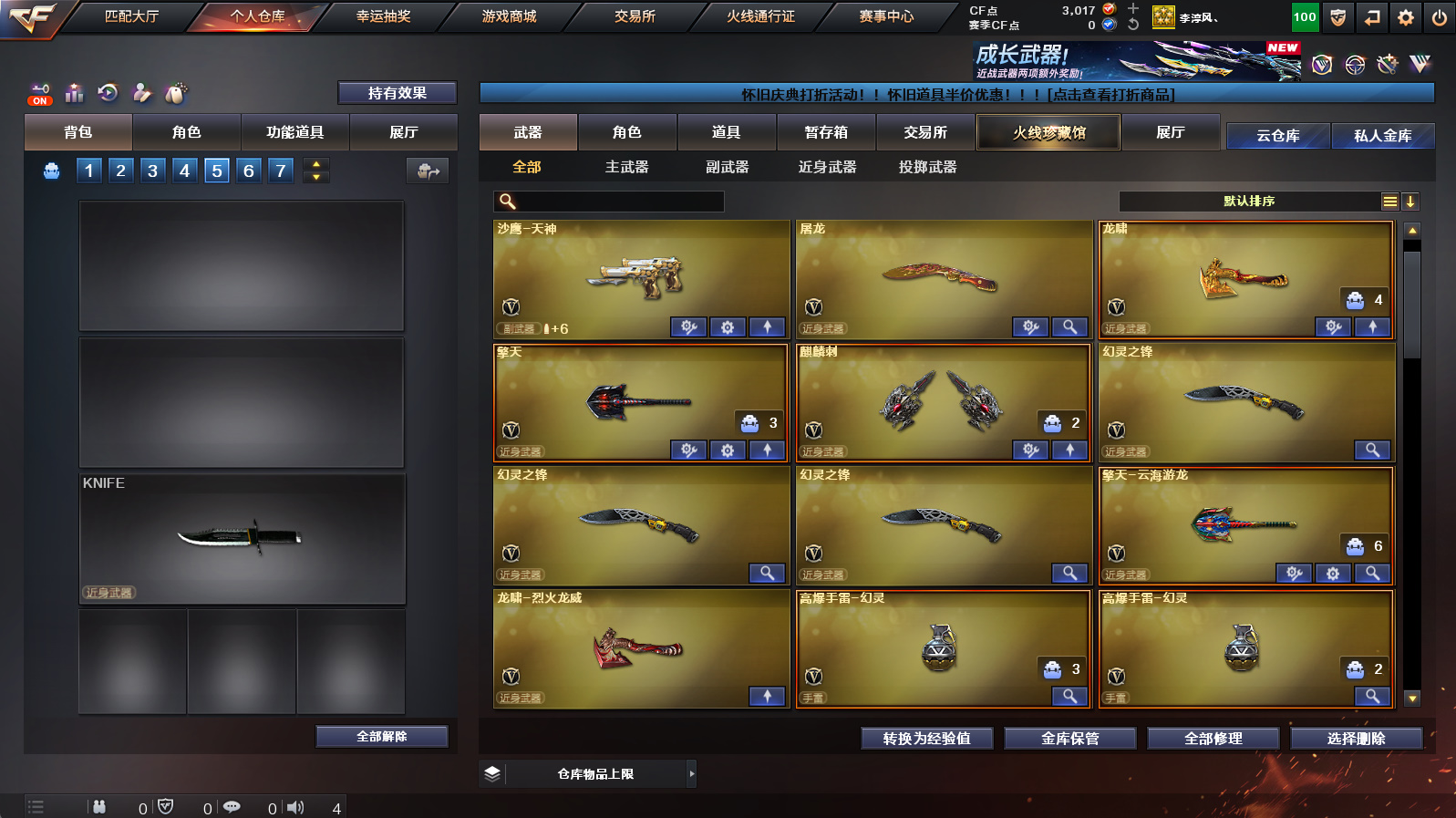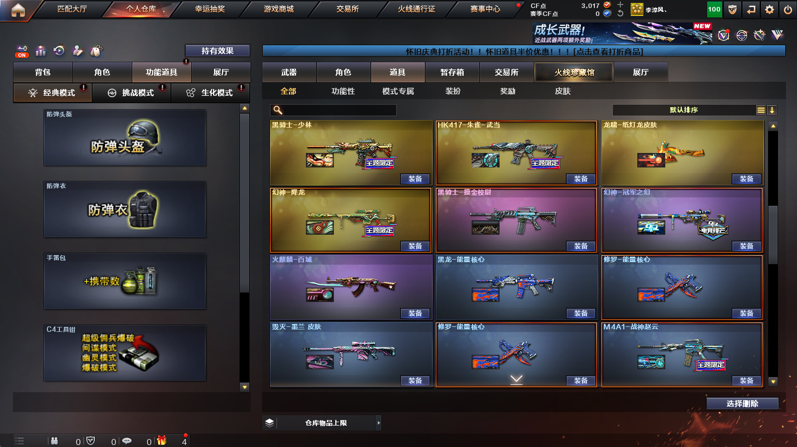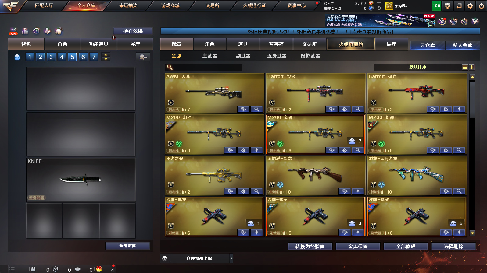 【3m200幻神+幻神冠军之幻+幻神降龙+幻神黄忠】【朱雀+朱雀武当】【隼+2烈龙】【金色蔷薇】【火麒麟华夏之心+火麒麟轻羽】【毁灭云海游龙音效卡+黑骑士音效卡】【满配云海玲珑】【火麒麟+雷神+黑骑士+毁灭】【火麒麟绝迹+雷神小红+毁灭孙三炮】【1911大黄蜂】【闪光护目镜】【工具钳+手雷包】