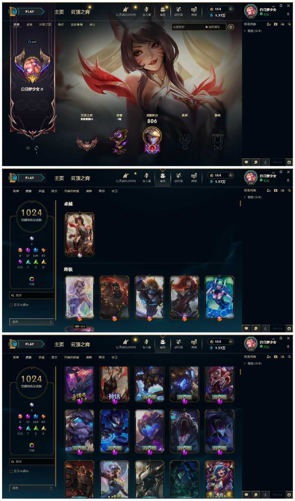 1200P♥️妹子号90至臻30臻彩名人堂faker殿堂传奇心之钢❤️斗魂觉醒墨之影至高天星守幻灵