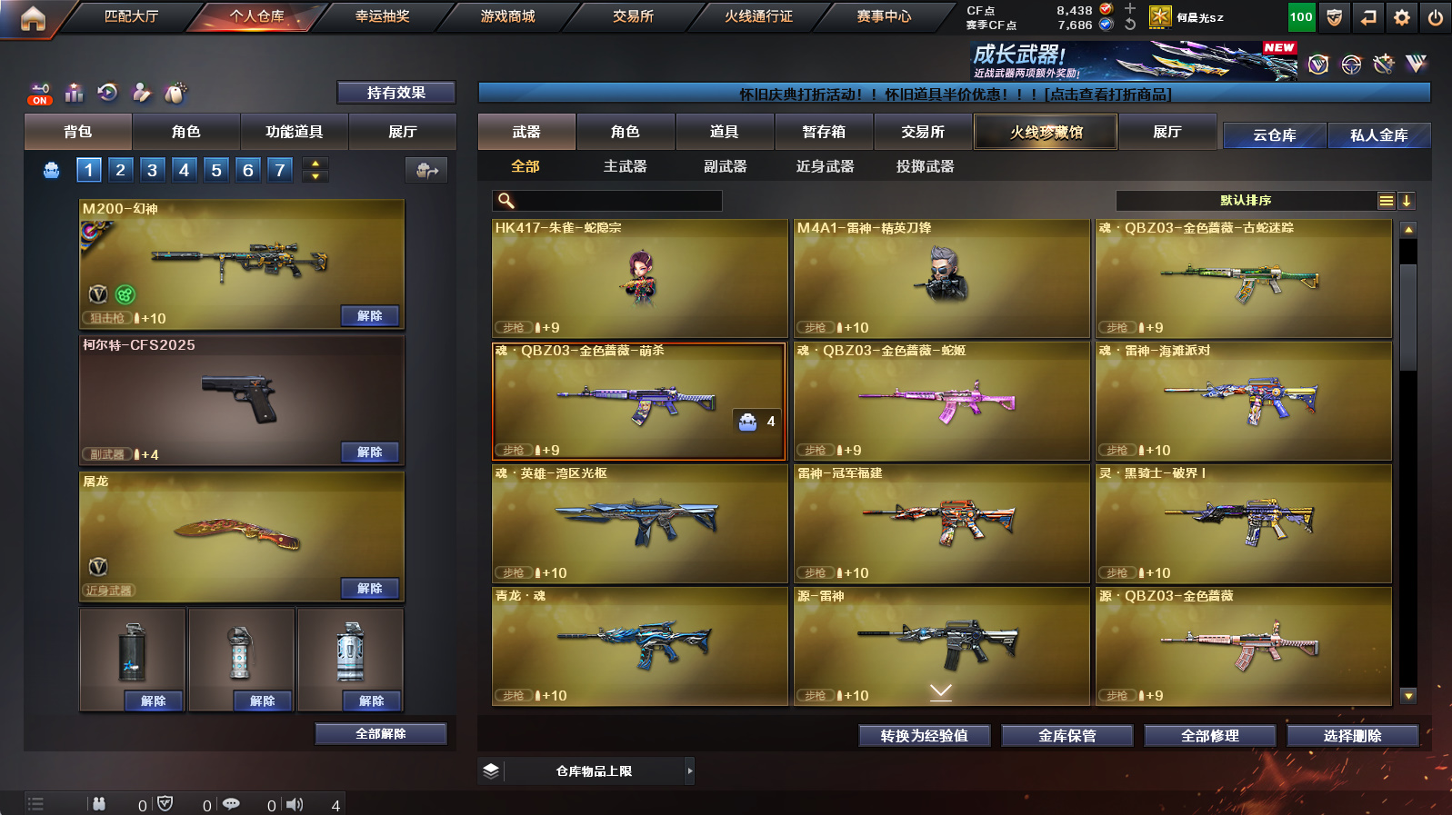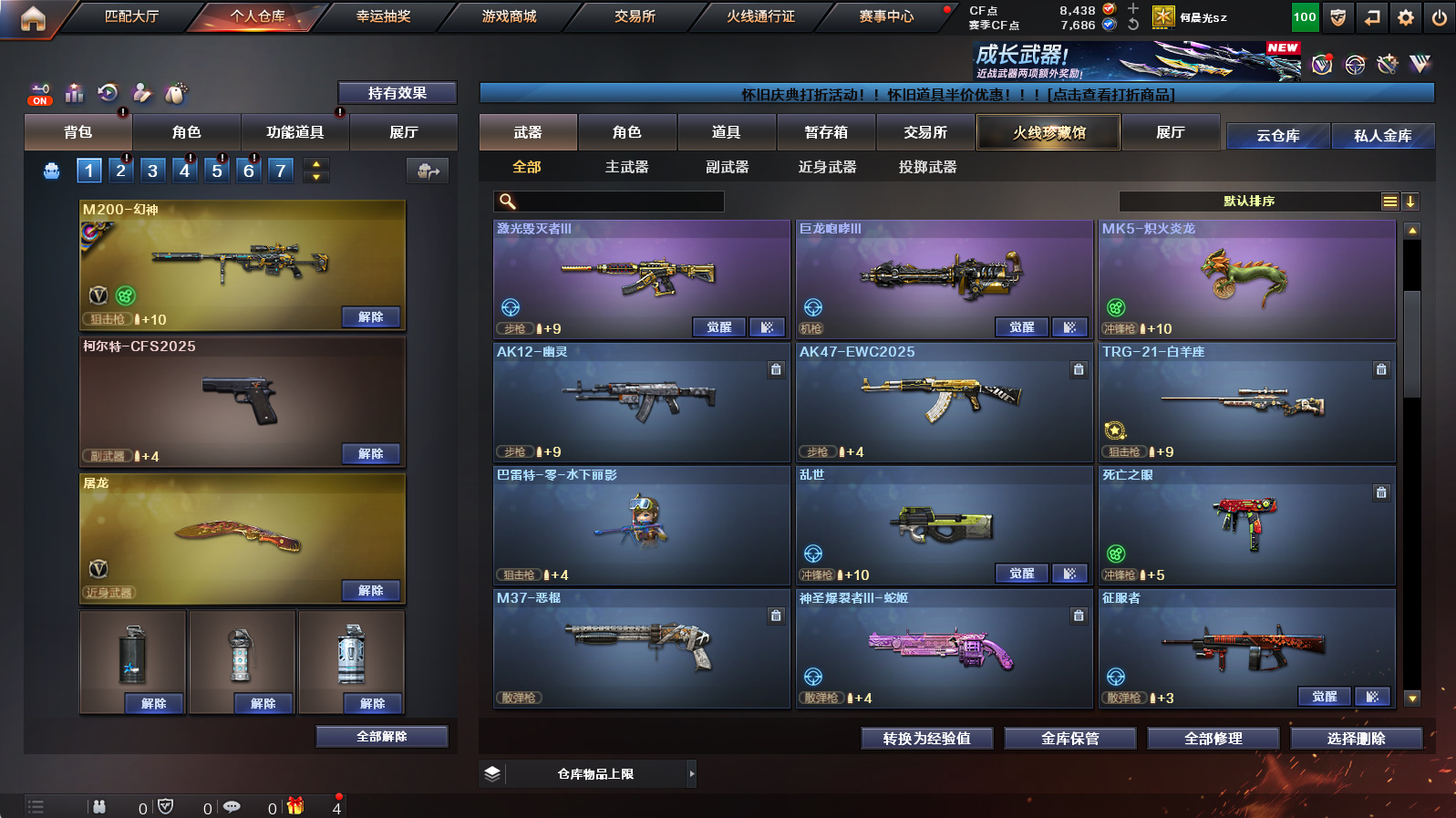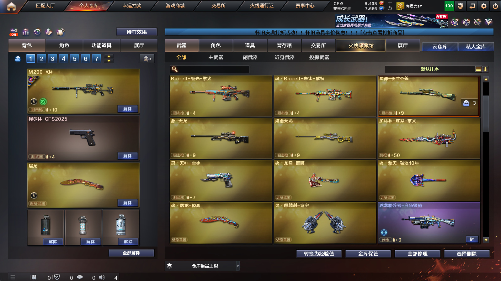 【m200幻神+幻神女团皮+幻神电流骇客】【星神长生圣莲】【裁决+裁决运输船皮肤】【传说幽冥】【屠龙惊鸿皮肤】【满配蛇隐宗】【黑骑士+炼狱】【盘龙+芭蕾特零水下丽影+死亡之眼】【朱雀蛇隐宗+雷神精英刀锋】【魂金色蔷薇萌杀】【手斧镜】【超级背包+炫彩背包】【工具钳+手雷包】