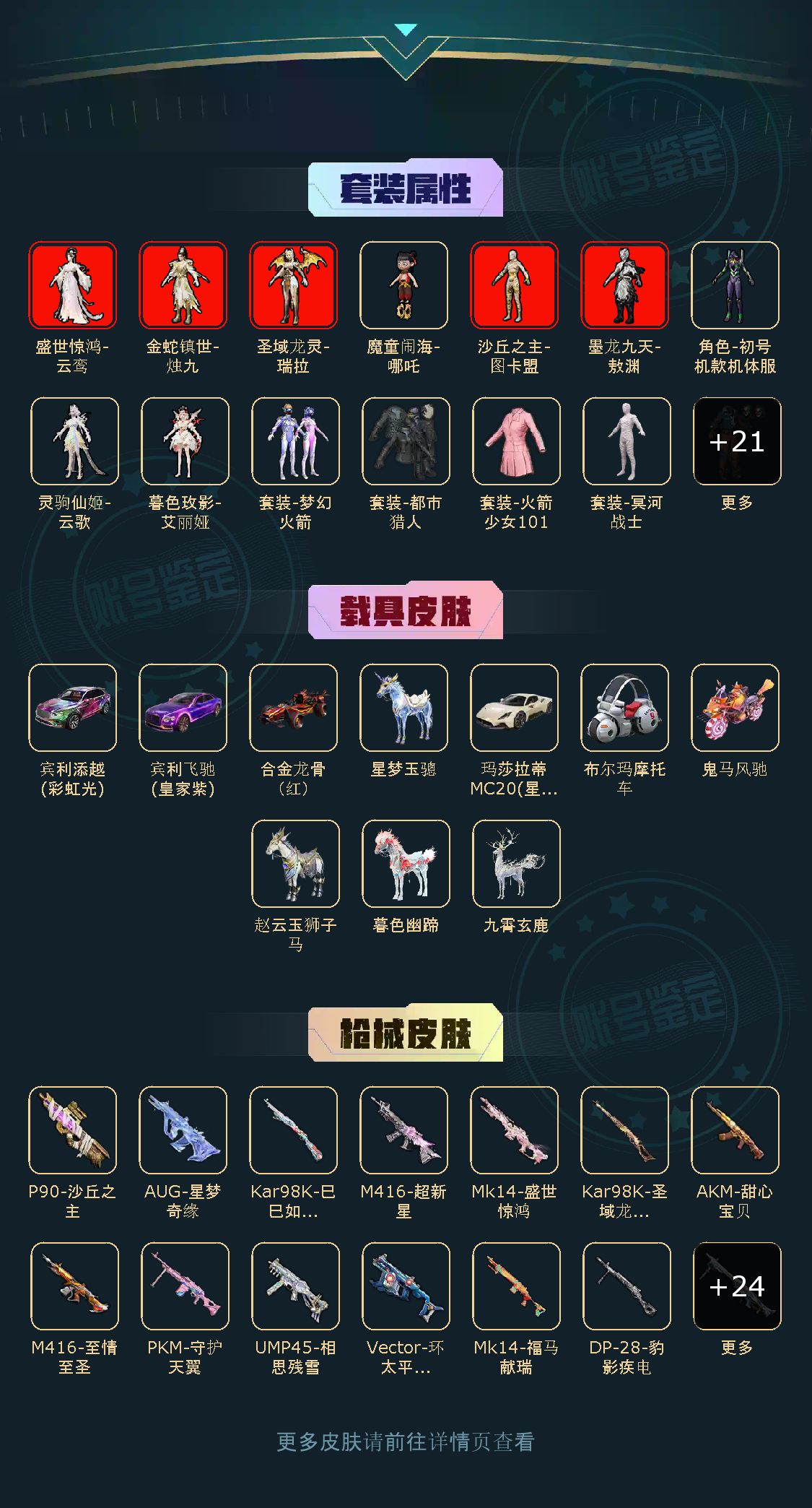 30粉,9载具,279套装,25王牌印记,无敌战神历史最高段,206184热力值 平底锅-林间仙鹿/AKM-甜心宝贝/SCAR-L-童趣迷兔/AUG-星梦奇缘/AUG-星之彼岸/GROZA-香水柠檬/M416-五爪金龙/AKM-魔法神域/M416-墨龙九天/M416-至情至圣/AUG-妙趣可丽/SCAR-L-机甲封神/M416-超新星/蜜獾-辉耀战甲/AKM-梦之光华/SCAR-L-魔童闹海 哪吒/Mk14-盛世惊鸿/Mk14-闲梦青缨/DP-28-暗夜鎏金/M249-彩虹甜喵/PKM-守护天翼/DP-28-圣堂之誓/MG3-洛神天依/DP-28-豹影疾电/UZI-绮梦青鸾/汤姆逊-怪笑疯兔/P90-甜蜜草莓/Vector-环太平洋/UMP45-相思残雪/P90-沙丘之主/烟雾弹-猫咪绅士/破片手榴弹-粉粉猫爪/Kar98K-圣域龙灵/AWM-花间之火/Kar98K-巳巳如意/宾利飞驰(皇家紫)/宾利添越(彩虹光)/鬼马风驰/合金龙骨(红)/玛莎拉蒂MC20(星石白)/暮色幽蹄/星梦玉骢/赵云玉狮子马/照夜玉狮子/布尔玛摩托车/