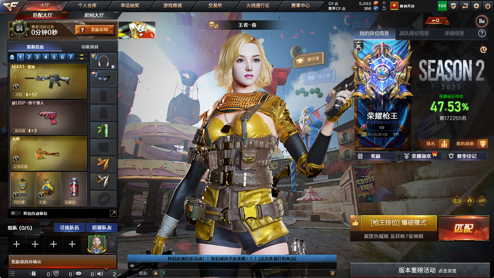 - 段位: 荣耀枪王