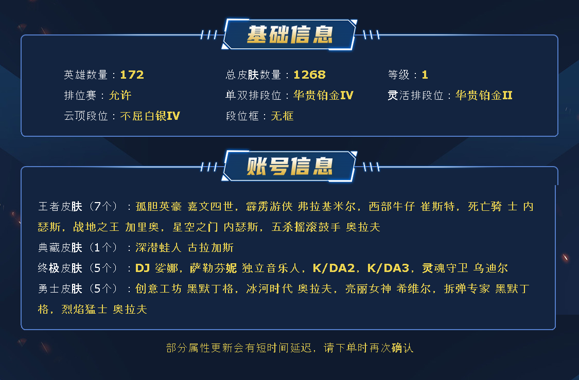 ~~喜欢记得收藏~~可排位~~1145皮全英雄~~租之前尽量查一下游戏ID,确保段位是您需要的,避免浪费您的时间~~请勿挂机逃跑故意送人头,谢谢合作,谢谢~~
