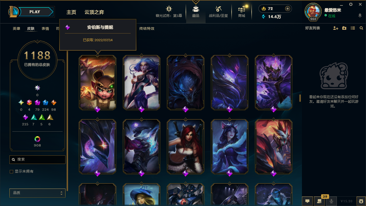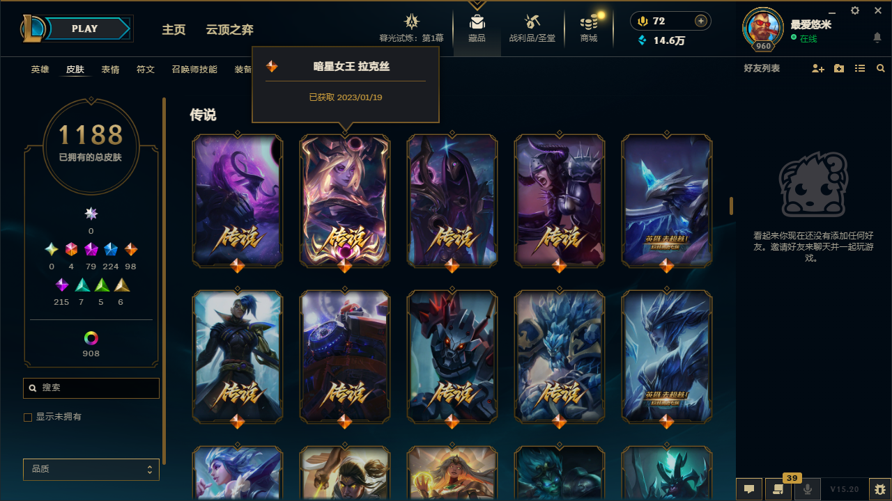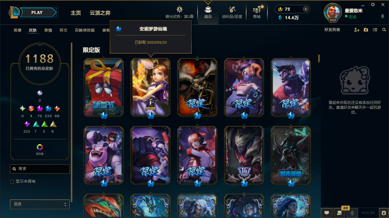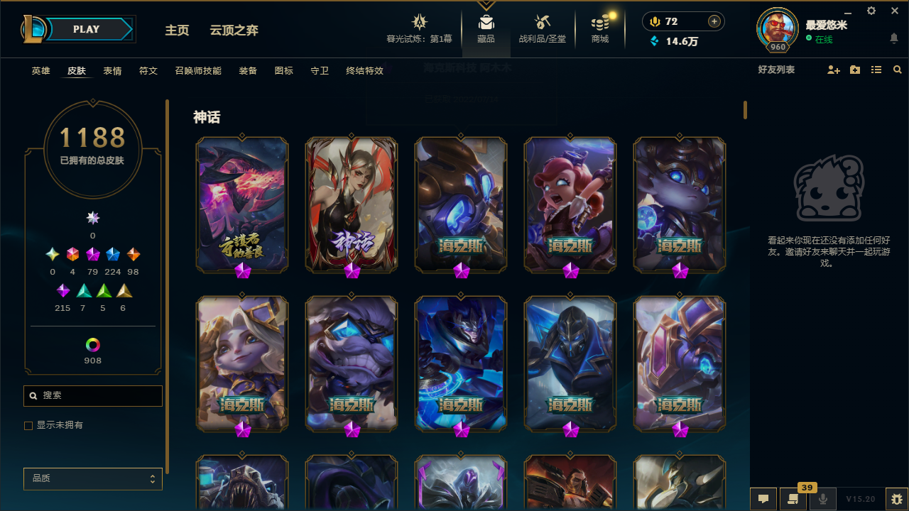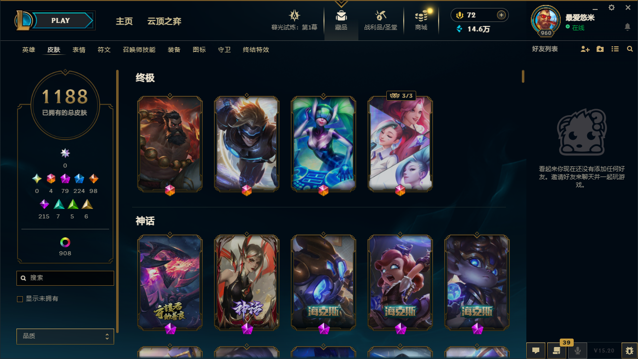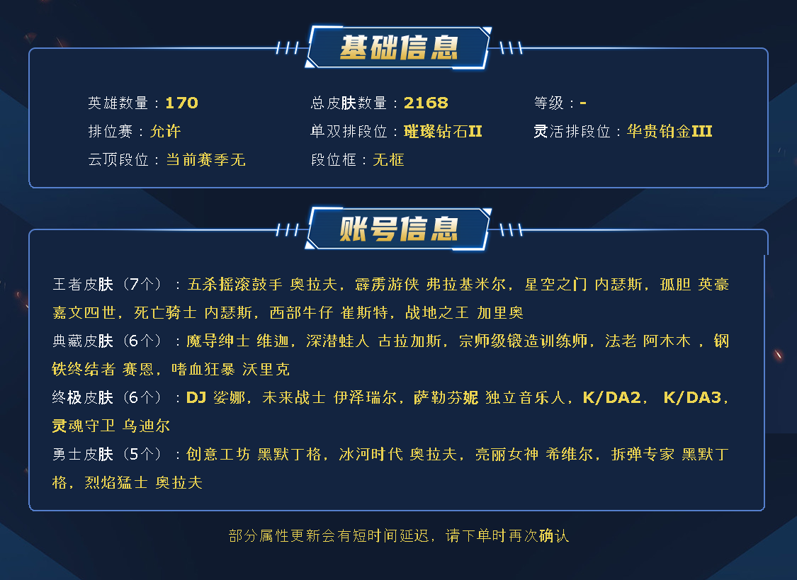 2168皮肤|满英雄|可排位|终极6|神话79|限定224|传说98|史诗215|