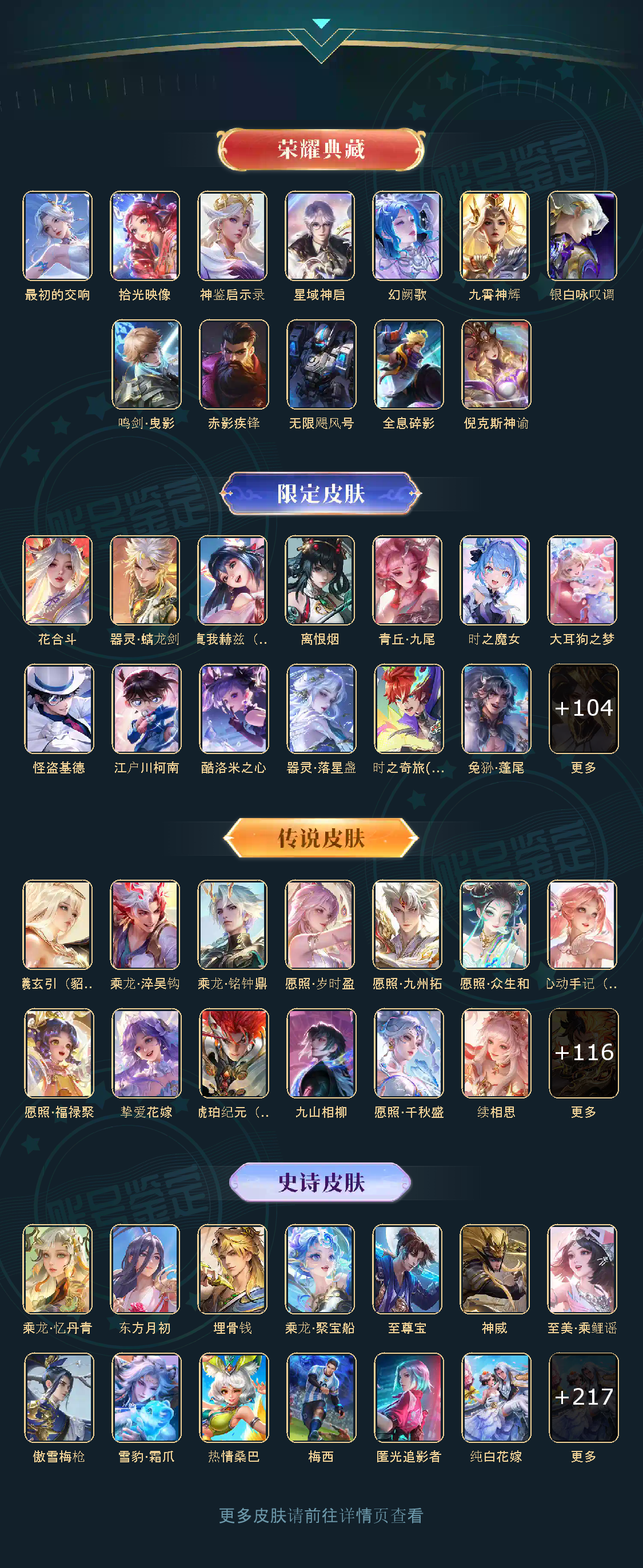 贵族等级V10,英雄数量128,典藏皮肤数12,皮肤数量703,纯白花嫁/天魔缭乱/至尊宝/真爱至上/热情桑巴/梅西/白虎志/久胜战神/飞衡/器灵·螭龙剑/愿照·九州拓/愿照·众生和/匿光追影者/天机白泽/冥王哈迪斯/神器·明辉仪/鸣剑·曳影/乘龙·问璇玑/群星魔术团(韩信)/神鉴启示录/心动手记(朵莉亚)/时之奇旅(大乔)/赤影疾锋/真我赫兹(瑶)/落雪白狼/愿照·福禄聚/无双飞将/至美·化雀舞/时之祈愿瑶/遇见神鼓/挚爱花嫁/星域神启/李逍遥/花合斗/涂山红红/霜北刀/逐花归海/器灵·落星盏/琥珀纪元(马超)/幻阙歌/九山相柳/至美·乘鲤谣/鹤羽星尊/时之奇旅(孙策)/曦玄引(貂蝉)/离恨烟/愿照·千秋盛/霜月吟/雪境奇遇(甄姬)/乘龙·淬吴钩/东方月初/拾光映像/乘龙·铭钟鼎/妄想实况/大耳狗之梦/埋骨钱/深海之息/最初的交响/黄金天蝎座/夜礼服假面/兔狲·蓬尾/玉兔公主/补天/怪盗基德/愿照·岁时盈/乘龙·聚宝船/惊梅引/续相思/异界灵契/神威/祥瑞亨通/黑崎一护/炽阳神光/启示之音/乘龙·忆丹青/影龙天霄/心动手记(海诺)/九霄神辉/朽木白哉/青丘·九尾/江户川柯南/云诺千山/鹤归松栖(云缨)/银白咏叹调/愿照·山河定/酷洛米之心/时之魔女/傲雪梅枪/雪豹·霜爪/馥梦繁花/纯白花嫁/天魔缭乱/至尊宝/真爱至上/热情桑巴/梅西/白虎志/久胜战神/飞衡/器灵·螭龙剑/愿照·九州拓/愿照·众生和/匿光追影者/天机白泽/冥王哈迪斯/神器·明辉仪/鸣剑·曳影/乘龙·问璇玑/群星魔术团(韩信)/神鉴启示录/心动手记(朵莉亚)/时之奇旅(大乔)/赤影疾锋/真我赫兹(瑶)/落雪白狼/愿照·福禄聚/无双飞将/至美·化雀舞/时之祈愿瑶/遇见神鼓/挚爱花嫁/星域神启/李逍遥/花合斗/涂山红红/霜北刀/逐花归海/器灵·落星盏/琥珀纪元(马超)/幻阙歌/九山相柳/至美·乘鲤谣/鹤羽星尊/时之奇旅(孙策)/曦玄引(貂蝉)/离恨烟/愿照·千秋盛/霜月吟/雪境奇遇(甄姬)/乘龙·淬吴钩/东方月初/拾光映像/乘龙·铭钟鼎/妄想实况/大耳狗之梦/埋骨钱/深海之息/最初的交响/黄金天蝎座/夜礼服假面/兔狲·蓬尾/玉兔公主/补天/怪盗基德/愿照·岁时盈/乘龙·聚宝船/惊梅引/续相思/异界灵契/神威/祥瑞亨通/黑崎一护/炽阳神光/启示之音/乘龙·忆丹青/影龙天霄/心动手记(海诺)/九霄神辉/朽木白哉/青丘·九尾/江户川柯南/云诺千山/鹤归松栖(云缨)/银白咏叹调/愿照·山河定/酷洛米之心/时之魔女/傲雪梅枪/雪豹·霜爪/馥梦繁花