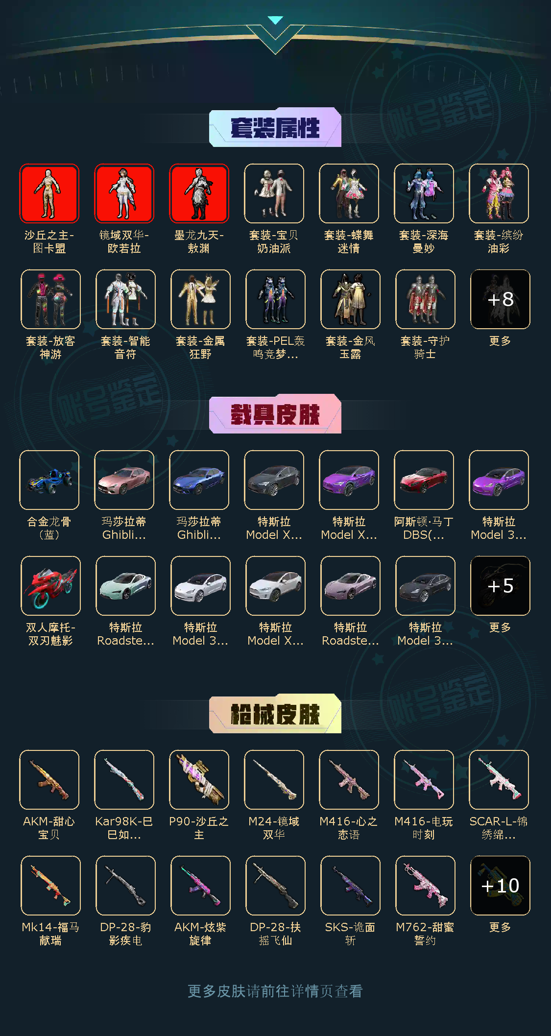 【套装数量】231 【枪械数量】267 【粉枪械数量】22 【粉套装数量】17 【载具数量】18 【飞行器数量】11 【稀有资产】墨龙九天-敖渊[1级]/镜域双华-欧若拉[1级]/沙丘之主-图卡盟[3级]/套装-奇异狩猎者/套装-浪漫天命/套装-潮萌小黄鸭/套装-雪山精英/套装-龟仙人/套装-浪漫波比/角色-都市丽猫/套装-缤纷假日/套装-奇迹天团 【粉色套装】套装-宝贝奶油派/套装-守护骑士/套装-金风玉露/套装-蝶舞迷情/套装-PEL轰鸣竞梦者/套装-深海曼妙/套装-金属狂野/套装-静灵氛围/套装-智能音符/套装-缤纷油彩/套装-放客神游/套装-冰霜白皇/套装-苍蓝魅影/套装-翡翠骑士/套装-绚金战神/套装-香水柠檬/角色-圣堂之誓 【粉色枪皮】M416-五爪金龙[4级]/M416-心之恋语[6级]/M762-甜蜜誓约[4级]/AKM-甜心宝贝[6级]/AKM-炫紫旋律[5级]/M762-激战未来[2级]/GROZA-香水柠檬[4级]/Kar98K-暗翼战神[1级]/SKS-诡面斩[4级]/SCAR-L-梦幻火箭[1级]/SCAR-L-童趣迷兔[4级]/SCAR-L-锦绣绵绵[5级]/M416-电玩时刻[5级]/M416-墨龙九天[3级]/Kar98K-巳巳如意[5级]/Kar98K-伏魔团[2级]/M24-镜域双华[1级]/AWM-花间之火[3级]/Mini14-荧光虫舞[3级]/P90-沙丘之主[2级]/DP-28-豹影疾电[5级]/DP-28-扶摇飞仙[4级] 【载具】鬼马风驰/特斯拉Cybertruck(荒芜蓝)/特斯拉Cybertruck(极昼黑)/阿斯顿·马丁DBS(红)/特斯拉Roadster(沁心粉)/玛莎拉蒂Ghibli(粉)/玛莎拉蒂Ghibli(蓝)/特斯拉Model 3(珍珠白)/特斯拉Roadster(水滴蓝)/特斯拉Model 3(冷光银)/特斯拉Model 3(奇幻紫)/快艇-塞莎KL27(深潜蓝)[1级]/双人摩托-双刃魅影(红)/疾风龙骑/特斯拉Model X(冷光银)/特斯拉Model X(奇幻紫)/特斯拉Model X(珍珠白)/合金龙骨(蓝) 【僚机】空客H135-蔚蓝之翼 【飞行器】至尊龙雀飞行服/梦幻火箭飞行器/春暖花开飞行器/炫紫旋律飞行器/深海曼妙飞行器/PEL轰鸣竞梦者飞行器/甜蜜誓约飞行器/激战未来飞行器/镜域双华-灵镜之阶/沙丘之主天马[1级]/龙翔九天飞行器[1级]
