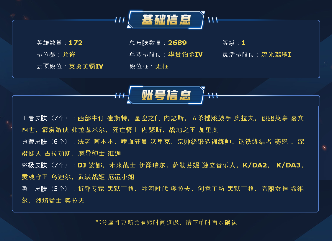 ~~喜欢记得收藏~~可排位~~2637皮全英雄~~租之前尽量查一下游戏ID,确保段位是您需要的,避免浪费您的时间~~请勿挂机逃跑故意送人头,谢谢合作,谢谢~~