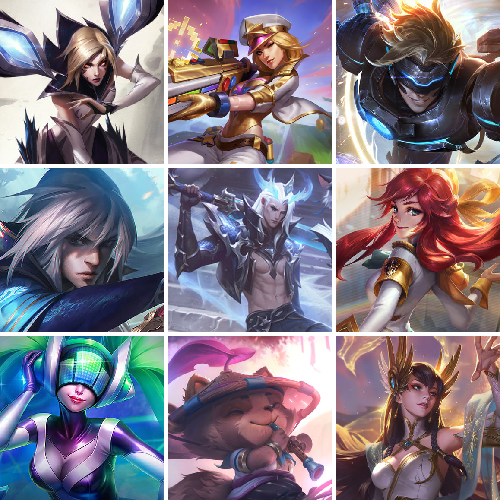 【传说皮肤】心之钢凯隐 星之守护者阿卡丽 鬼魂新娘莫甘娜 暗星尊烬 神龙尊者夜月幻龙亚索 日蚀骑士希维尔 死亡骑士盖伦 源计划毁灭派克 灵魂莲华瑟提 上古战魂魔腾 魔幻卡牌崔斯特 星之守护者卡莎 源计划超体莫德凯撒 源计划泯灭雷克顿 幻灵战斗队长厄运小姐 钢铁军团盖伦 约德尔国队长提莫 战场女武神凯尔 女主播迦娜 大天使长米迦勒凯尔 源计划林易 第三类接触黑默丁格 冰川巨兽墨菲特 青花瓷伊泽瑞尔 欧米伽小队幽灵特工 战地巨兽科加斯 邪鸦魅影乐芙兰 太空律动猫猫布里和里茨 战斗学院伊泽瑞尔 律政大亨蒙多 战地机甲厄加特 黎明使者永恩 女皇艾希 星之守护者金克丝 魔女伊芙琳 光明哨兵格雷福斯 耀星女神拉克丝 星之守护者拉克丝 暗星女王拉克丝 月蚀骑士蕾欧娜 神王盖伦 黎明使者锐雯 腥红之月鬼武姬阿卡丽 血石领主弗拉基米尔 屠龙勇士潘森 丧尸布兰德 神龙尊者圣龙李青 炼狱魔犬内瑟斯 光明哨兵薇恩 银河魔装机神兰博 源计划净化薇恩 地狱行者孙悟空 神拳李青 女帝卡特琳娜 女警狙击凯特琳 未来战士凯特琳 陆地王者4WD布里茨 苹果机器人布里茨 星之守护者霞 战斗学院凯特琳 红色男爵库奇 暗星锤石 星之守护者洛 最终BOSS维迦 灵魂莲华锤石 双重冰晶艾尼维亚 冰霜之刃艾瑞莉娅 黯晶凤凰艾尼维亚 地狱之门卫士加里奥 电玩女神娑娜 绅士科加斯 灵能特工娑娜 至尊魔女莫甘娜 真实伤害艾克 天煞劫 西部魔影卢锡安 西部天使赛娜 恶魔之刃泰达米尔 合金巨兽努努和威朗普 源计划联合艾希 西部天使艾希 驯龙炮手崔丝塔娜 烈焰雄心崔丝塔娜 提莫约德尔人的一大步 铁哥们儿奥拉夫 黑夜使者索拉卡 奥德赛凯隐 黎明使者索拉卡 黑夜使者亚索 灌篮高手德莱厄斯 霸天零式赛恩 金牌主播德莱文 恶魔男爵瑞兹 神王德莱厄斯 蔷薇绅士杰斯 霸天异形卡兹克 宇航员诺提勒斯 女校长菲奥娜 苍穹之光韦鲁斯 泳池派对吉格斯 符文战熊沃利贝尔 灵魂莲华阿狸 焰尾妖狐阿狸 冰霜亚龙希瓦娜 枯萎之壤泽拉斯 钢铁之翼凯尔 星之守护者阿狸 黯黑魔龙希瓦娜 偶像歌手阿狸
