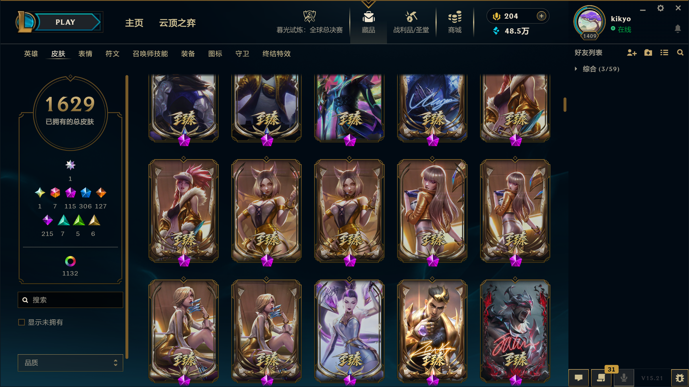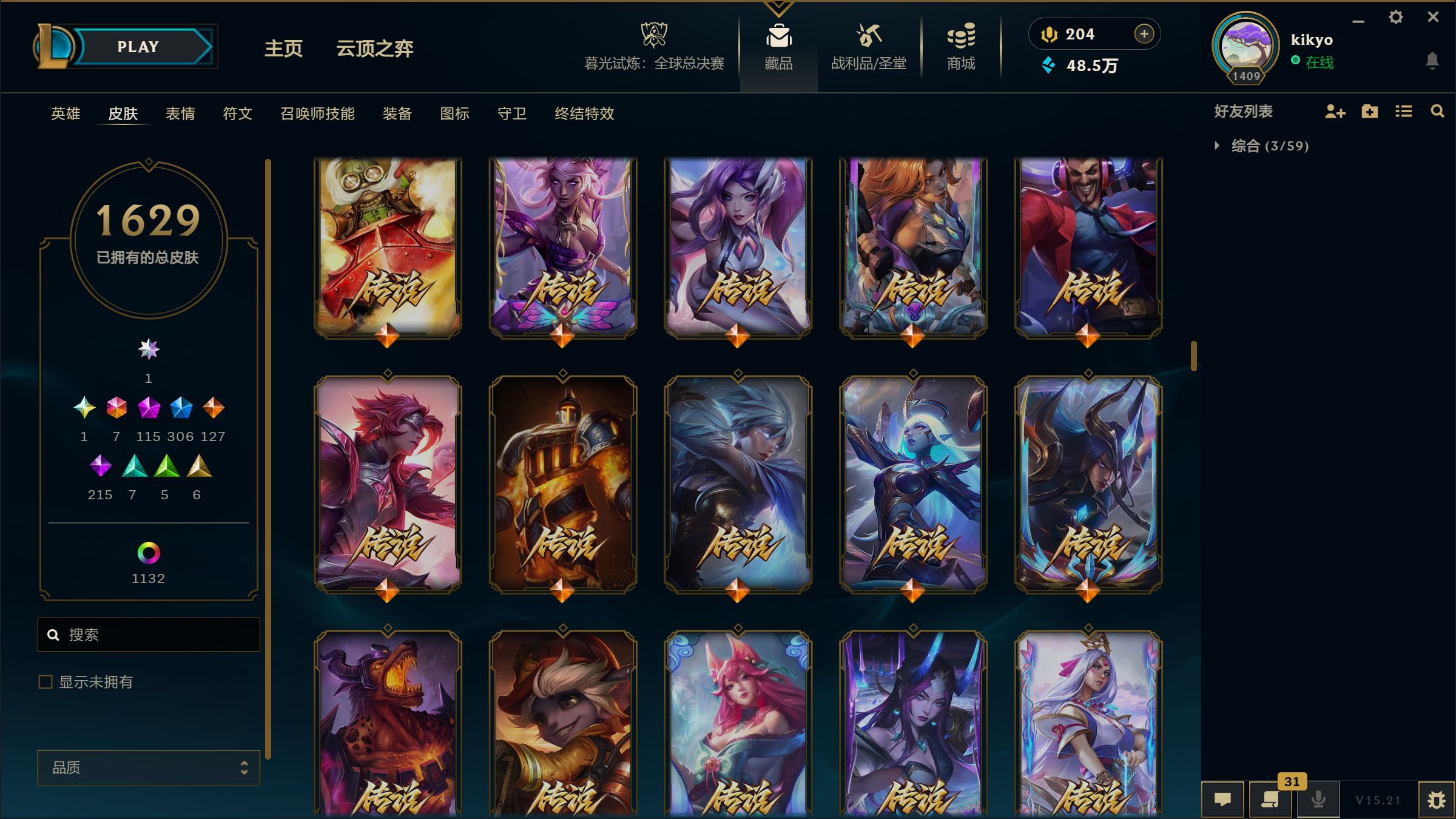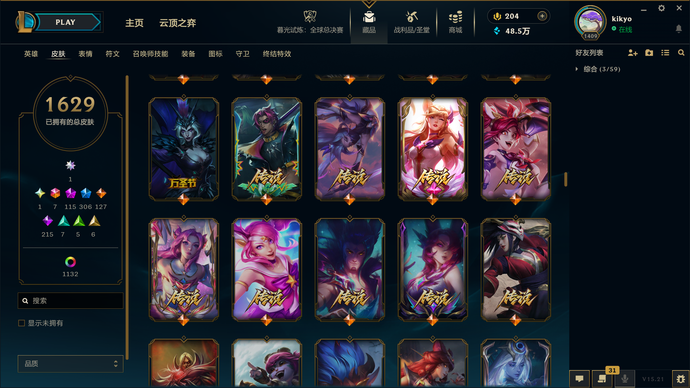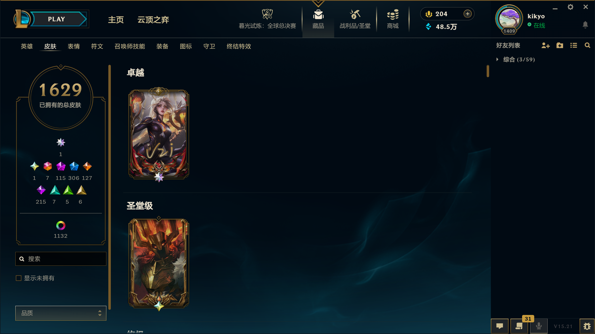 1629原皮丨联盟不朽卡莎签名版丨圣堂铁男丨创世亚索丨炽天使永恩丨神话幻想阿狸丨等大量精品皮肤