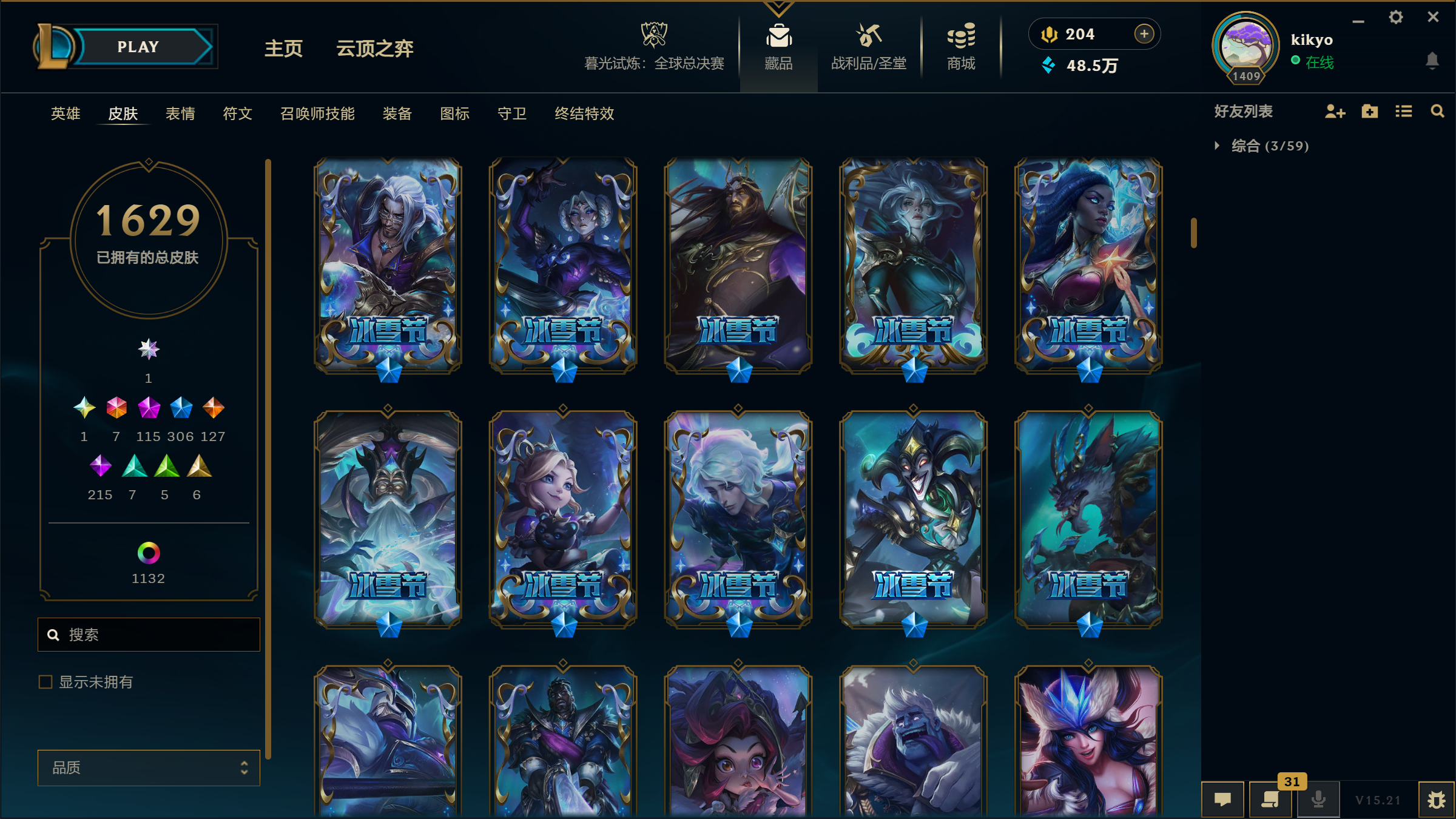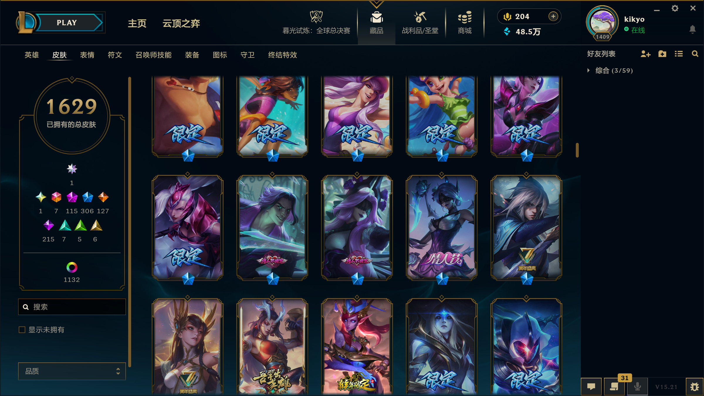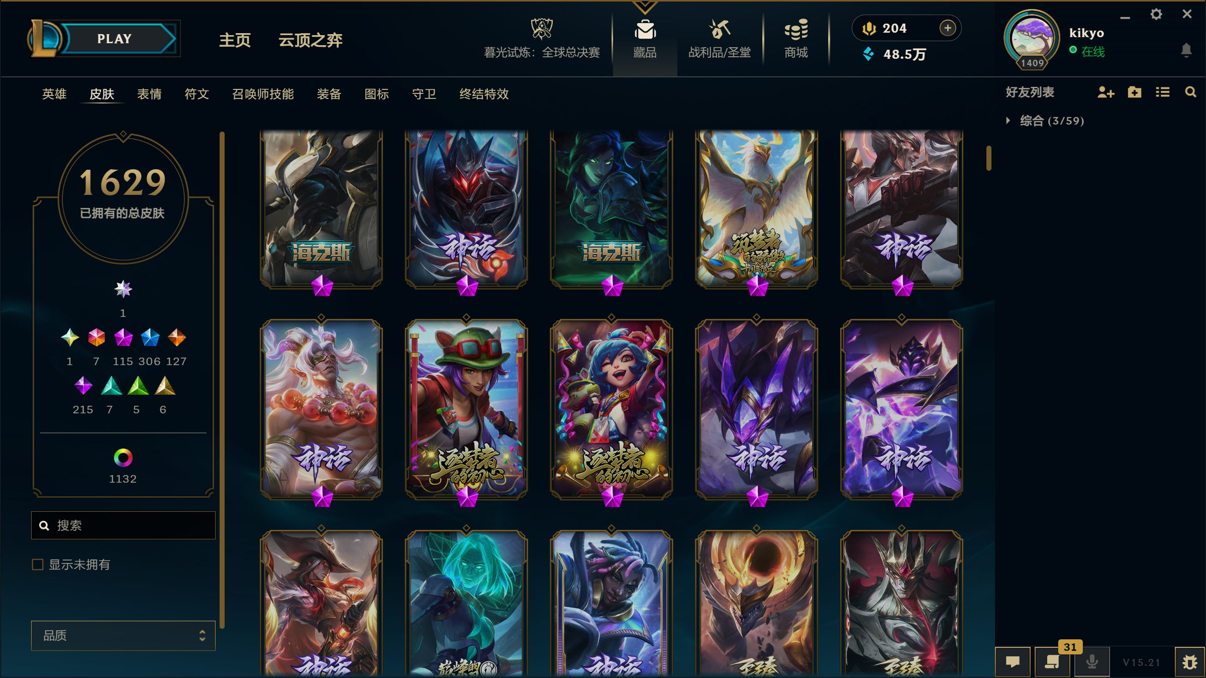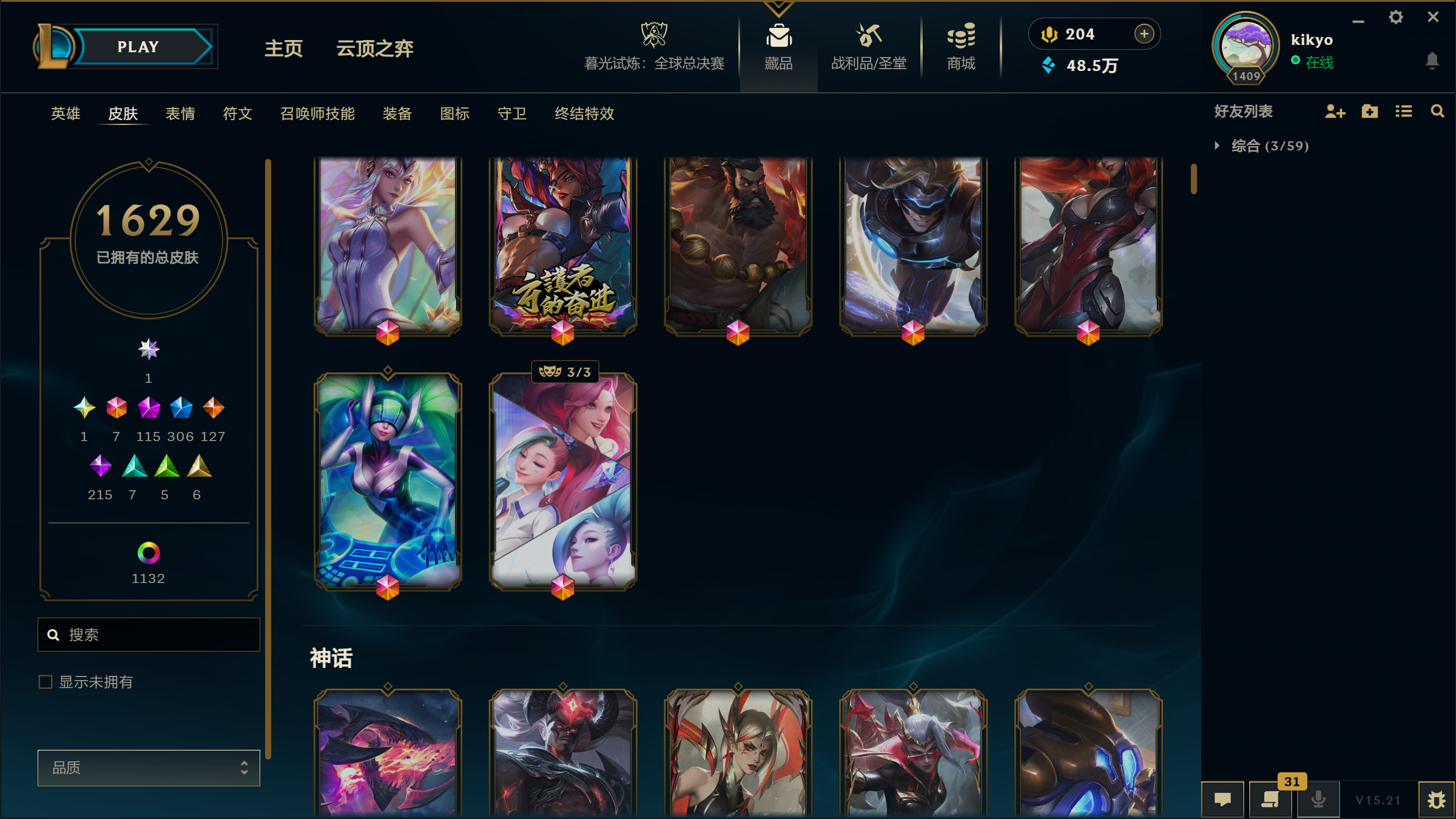 1629原皮丨联盟不朽卡莎签名版丨圣堂铁男丨创世亚索丨炽天使永恩丨神话幻想阿狸丨等大量精品皮肤