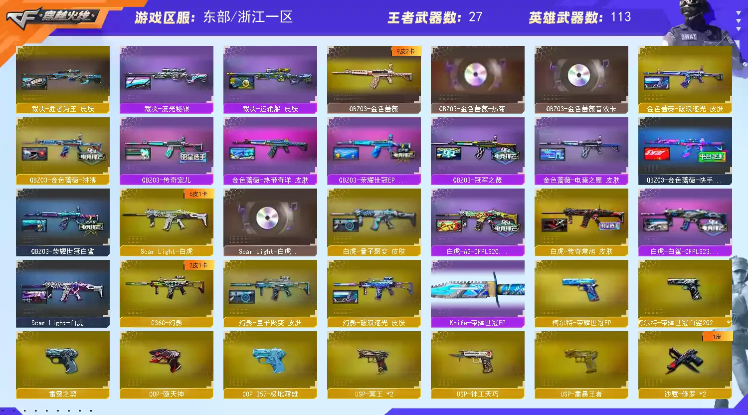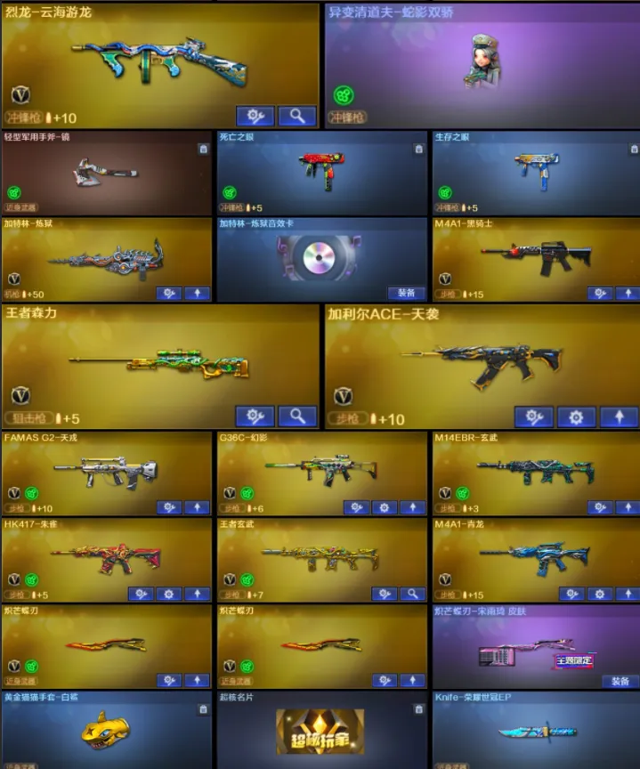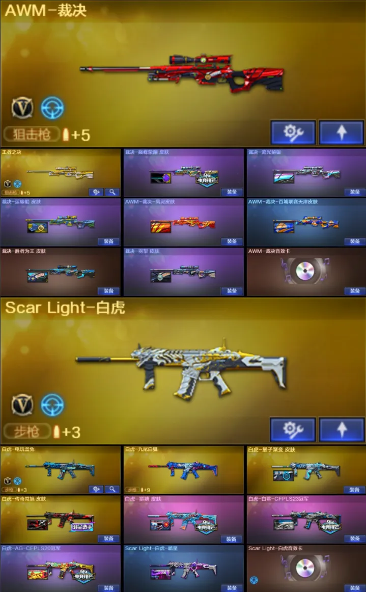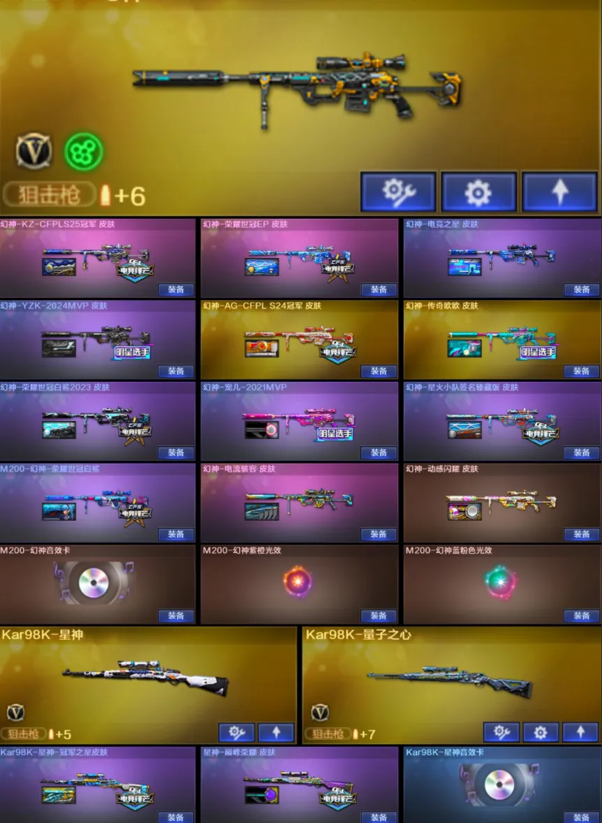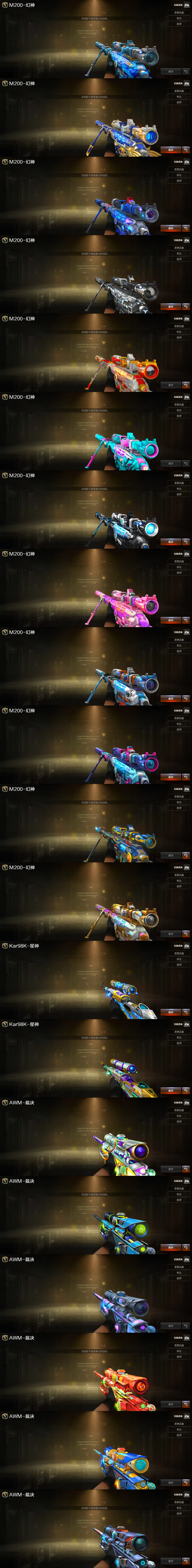 【稀有武器】:传说辉光/传说夜影/M200-幻神/Kar98K-星神/G36C-幻影/ScarLight-白虎/M4A1-青龙/HK417-朱雀/QBZ03-天罚/COP-堕天神/USP-神工天巧/天神-动感闪耀/修罗-云海游龙/柯尔特-荣耀世冠白鲨2023(2)/修罗-古蛇迷踪/金色蔷薇-古蛇迷踪/QBZ03-金色蔷薇/AK47-火麒麟/M4A1-黑龙/M4A1-雷神(2)/M4A1-黑骑士/白虎-电玩蓝兔/Barrett-毁灭(2)/AWM-裁决/加特林-炼狱/炽芒蝶刃(2)