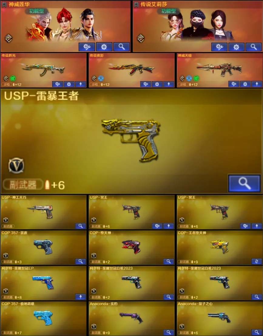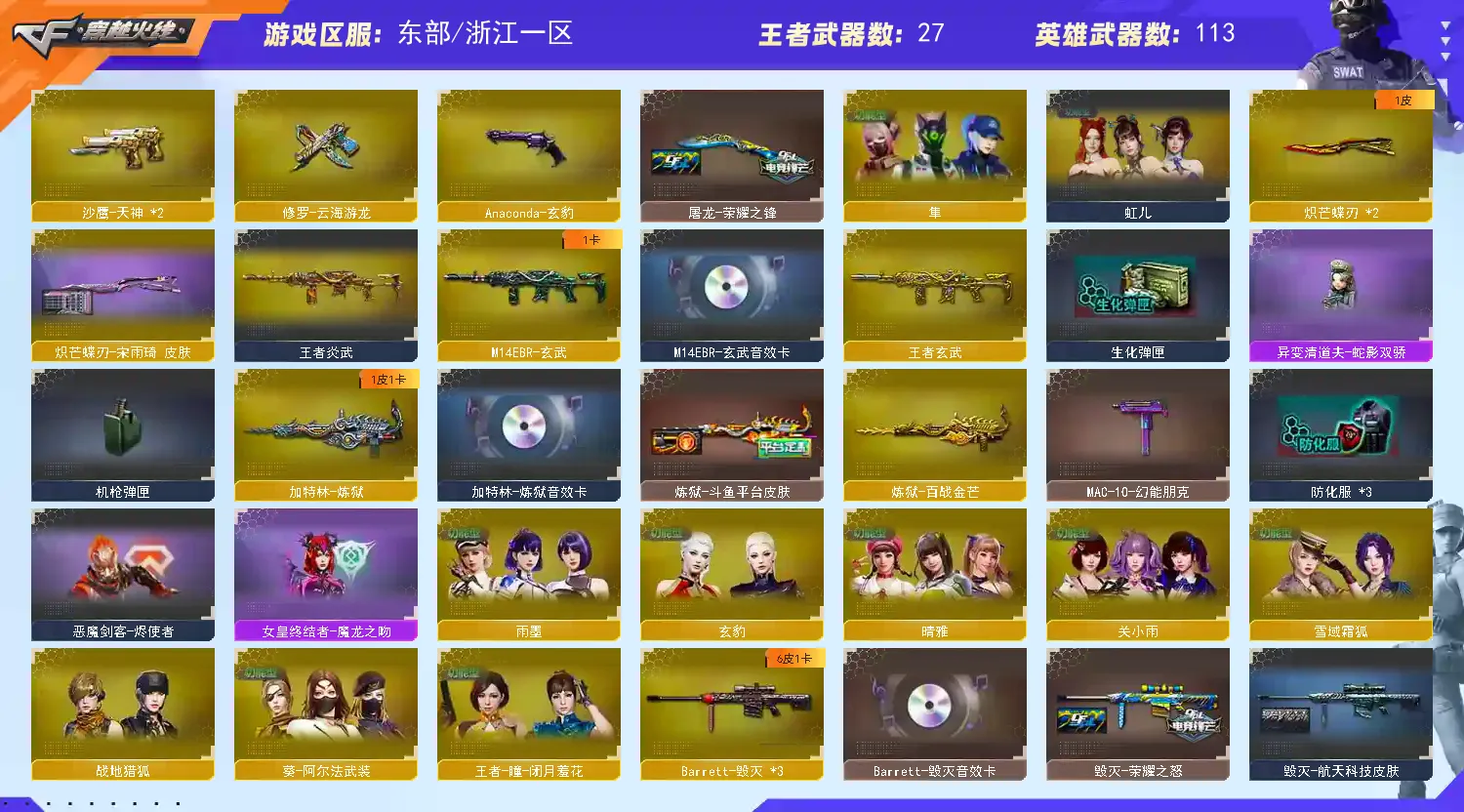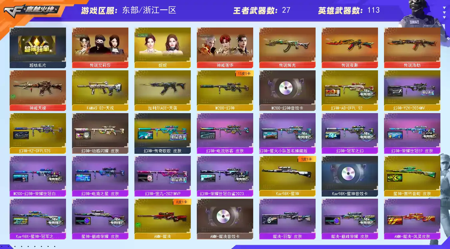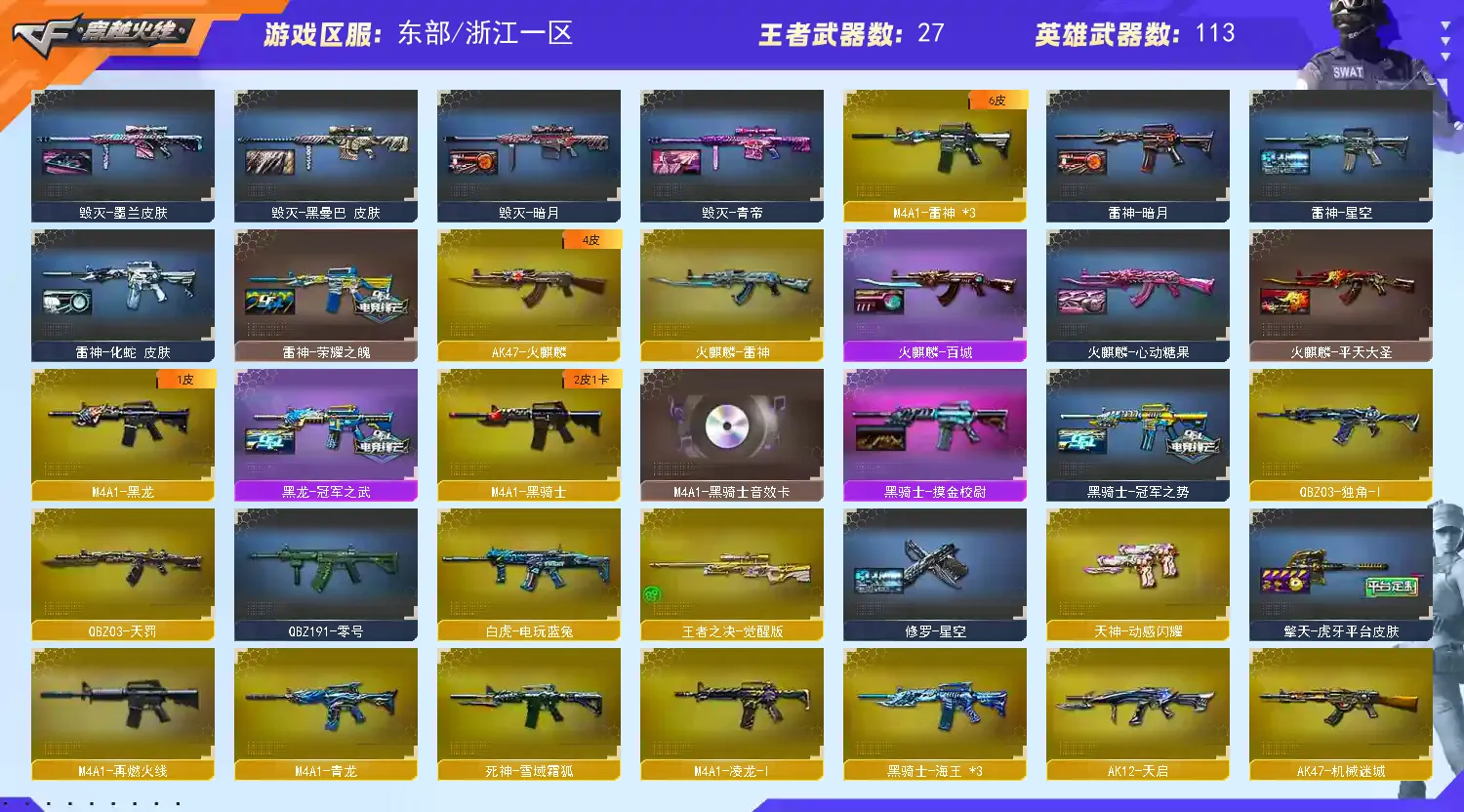 【稀有武器】:传说辉光/传说夜影/M200-幻神/Kar98K-星神/G36C-幻影/ScarLight-白虎/M4A1-青龙/HK417-朱雀/QBZ03-天罚/COP-堕天神/USP-神工天巧/天神-动感闪耀/修罗-云海游龙/柯尔特-荣耀世冠白鲨2023(2)/修罗-古蛇迷踪/金色蔷薇-古蛇迷踪/QBZ03-金色蔷薇/AK47-火麒麟/M4A1-黑龙/M4A1-雷神(2)/M4A1-黑骑士/白虎-电玩蓝兔/Barrett-毁灭(2)/AWM-裁决/加特林-炼狱/炽芒蝶刃(2)