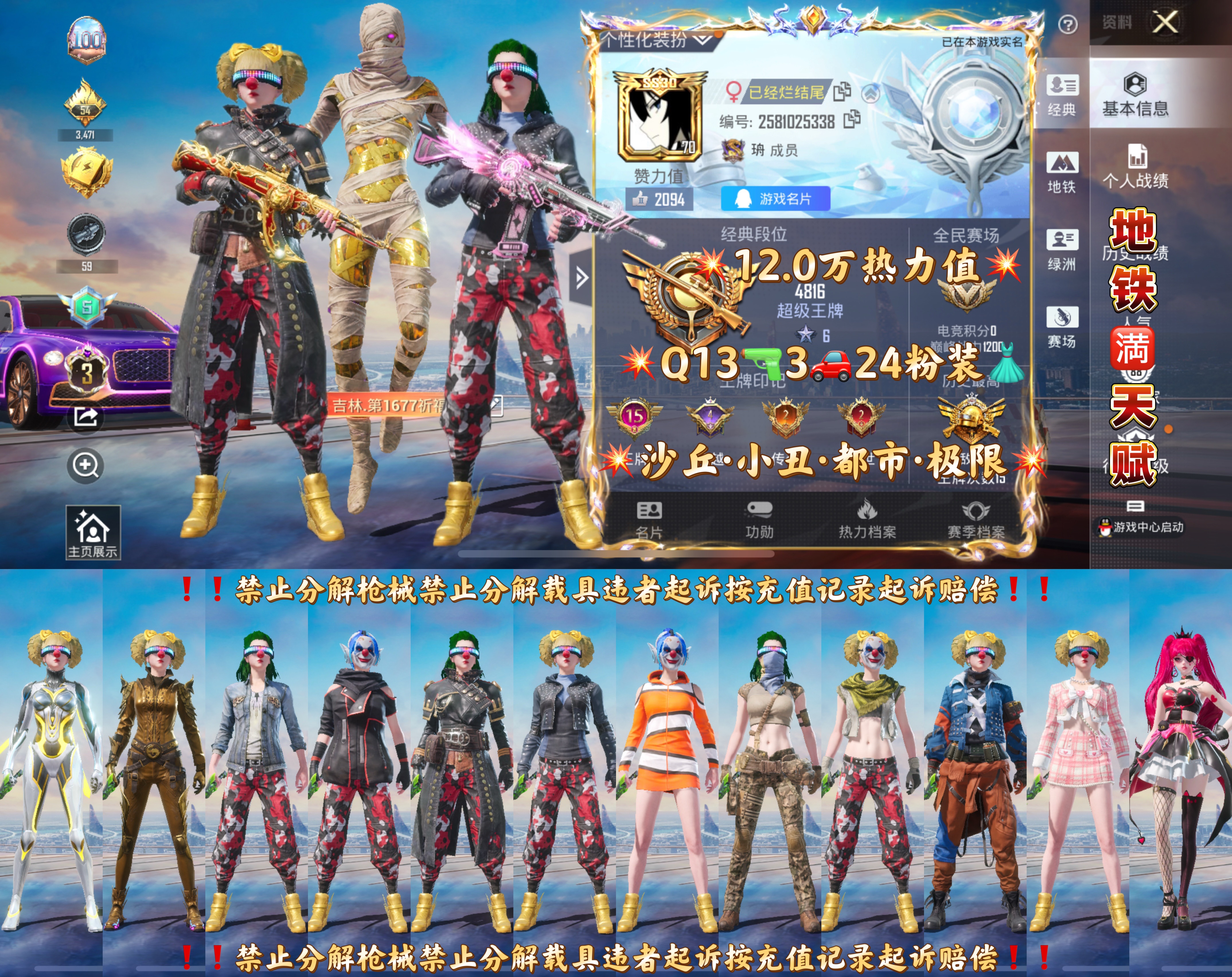 恶意撤单一律拉黑 可直接上号 租客须知◆ 本账号已在公安局备案,请勿对账号做出非法操作 如:开挂,坐挂车,使用第三方工具等,请您和谐游戏,如有损害财务的情形必追究到底 登录游戏:登录请打开和平精英并勾选上同意协议,再点击开始登录即可,如跳转停留主页面无反应,!!!重新打开和平精英!!!!即可正常进入游戏 **:如账号触发账号系统,会为您补上时间,到时不会下线,直到下一位租客租赁账号为止 请尽量不要以**进行维权 恶意维权,恶意维权者进行拉黑处理,永不放出 关于登号器,登录请打开和平经营并勾选上同意协议,再点击开始登录即可,如跳转停留主页面无反应,重新打开和平精英即可正常进入游戏 如果您喜欢本账号,可以点个收藏 【该账号库存价值较大已在派出所进行虚拟财产备案处理发现封禁将依法追究责任 禁止毁号开第三方软件发现账号被封禁联系平台获取联系方式进行法院起诉故意损害他人财物处理】请勿以身试法。开G封号一律报警并法院起诉,追究到底! 别以为虚拟ip,虚拟卡就可以为所欲为,平台注册手机验证,身份证号或者ZF宝付款记录等太明显了,网络不是法外之地, 想想那些在网上违法诈骗的怎么被抓的? 做一件事的时候要考虑后果是不是你能承担的,想开G自己注册个新Q玩就行了, 租别人的号开G吃亏的还是自己,切勿抱有侥幸心理, 到时候被网监局刑事部门找上门,罚钱坐牢留下案底,亲人两行泪!恶意撤单一律拉黑
