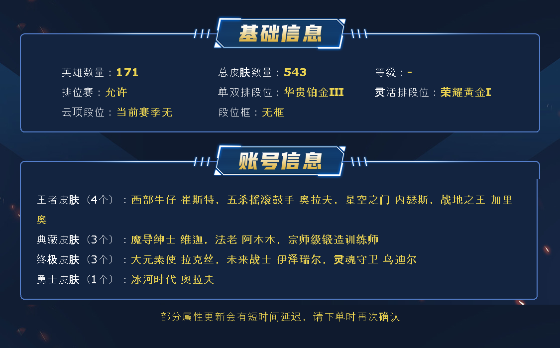 满英雄|544皮肤|可排位|终极3|限定111|传说43|史诗107| 禁止挂机送人头骂人 违者移交平台处理