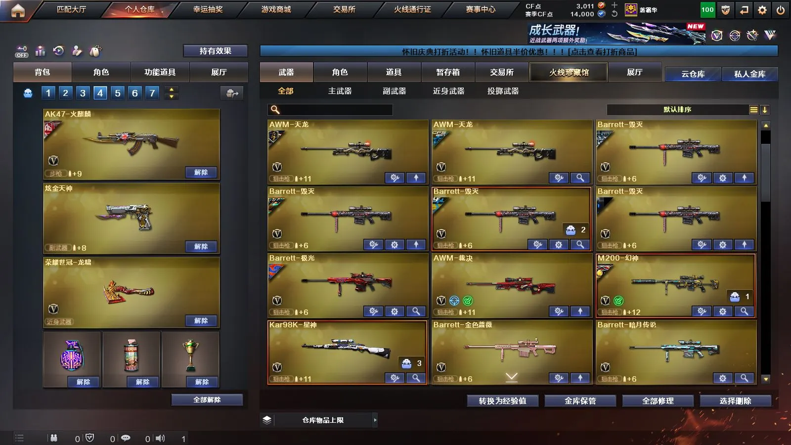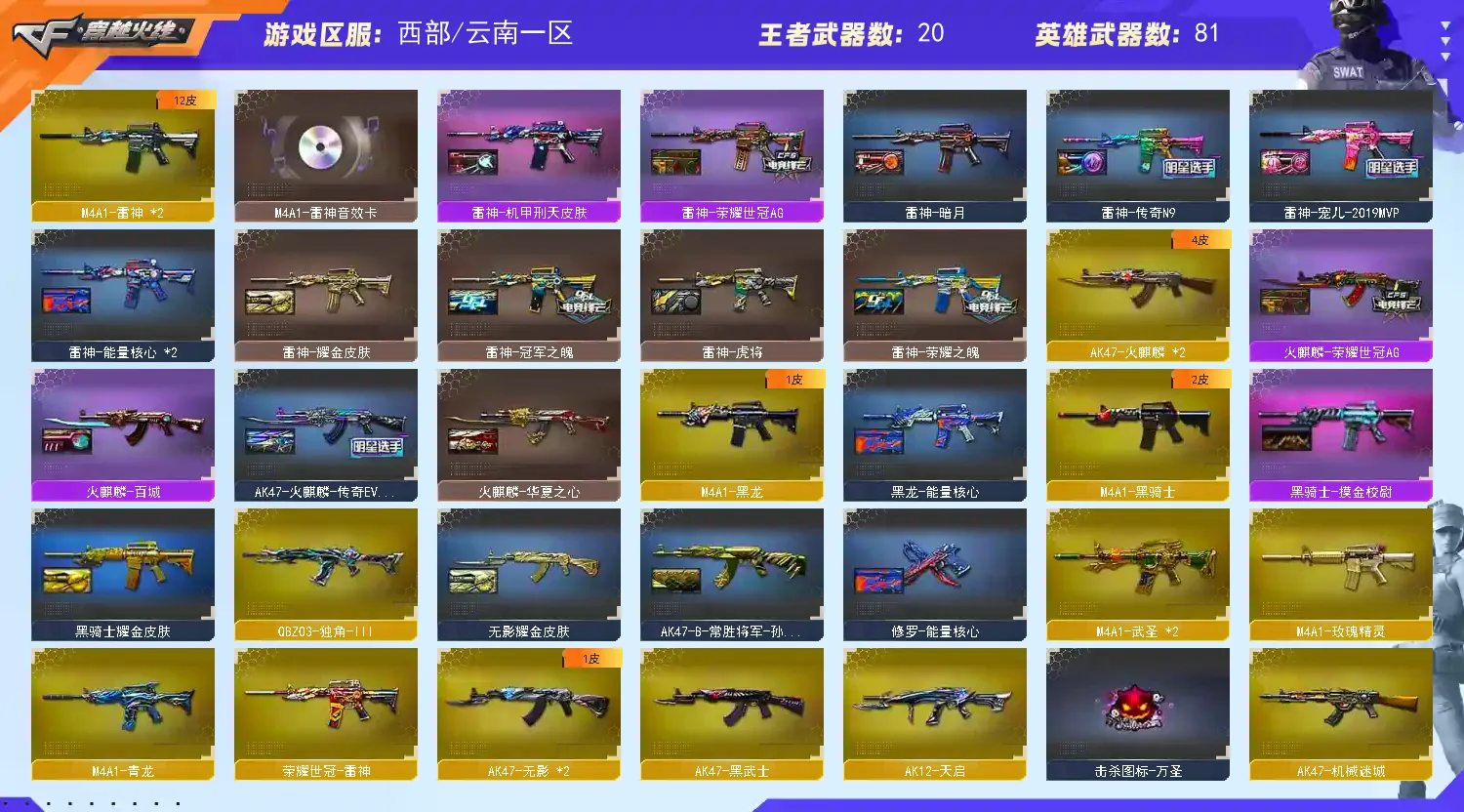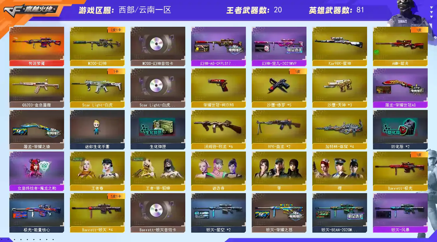 【幻神三件套!!!】 【M200幻神+幻神音效卡+宠儿皮肤+AG皮肤】【98k星神】【传说梦魇】【6烈龙+4炼狱+2盘龙】 【白虎+白虎音效卡】 【qbz03金色蔷薇】 【荣耀世冠套装】 【王者炎性 王者之心 王者之翼 王者冰魄 王者之魄 王者之武 王者之力 王者之怒】【雷神+雷神音效卡+荣耀之魄皮肤+传奇N9皮肤+宠儿皮肤+冠军之魄皮肤+荣耀之冠AG皮肤】 【火麒麟+传奇EVEN皮肤+荣耀世冠AG皮肤】【毁灭+毁灭音效卡+荣耀之怒皮肤+2020MVP皮肤】 【黑龙 黑骑士 无影 死神 天启 武圣 机械迷城 青龙 朱雀 qbz03独角III 玫瑰精灵 猎神 9A91烈火 超新星悦享 猩红传说 战士 战神 身先士卒 常胜将军 极光 裁决 巴雷特金色蔷薇 巴雷特暗月传说】——【沙鹰修罗 沙鹰天神 荣耀世冠柯尔特】——【屠龙 龙啸 擎天麒麟刺 战神刀雷暴 王者之锋 王者之啸 王者之击 荣耀世冠龙啸】——【雷暴投掷武器套装 雷霆王者投掷武器套装】——【热门武器/小人枪】【苍鸣雷神 青龙掌上穿越火线 火麒麟灵狐 炫金黑龙 炫金雷神 炫金骑士】——【角色】【4防(王者春 王者葵貂蝉)】