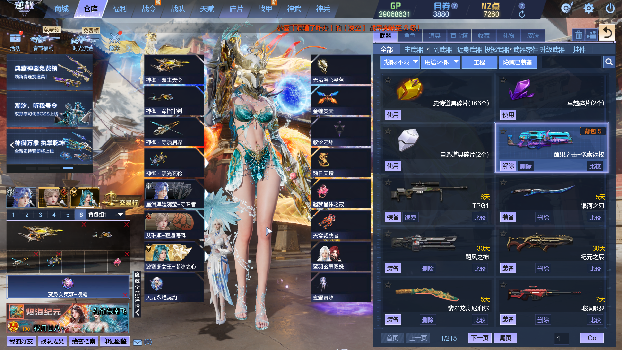 2025.3.1新增:臂铠龙宫秘境,英雄海龙王,英雄龙太子,英雄画灵➕皮肤,英雄碧湖,S战甲白纱飞羽+双再生,