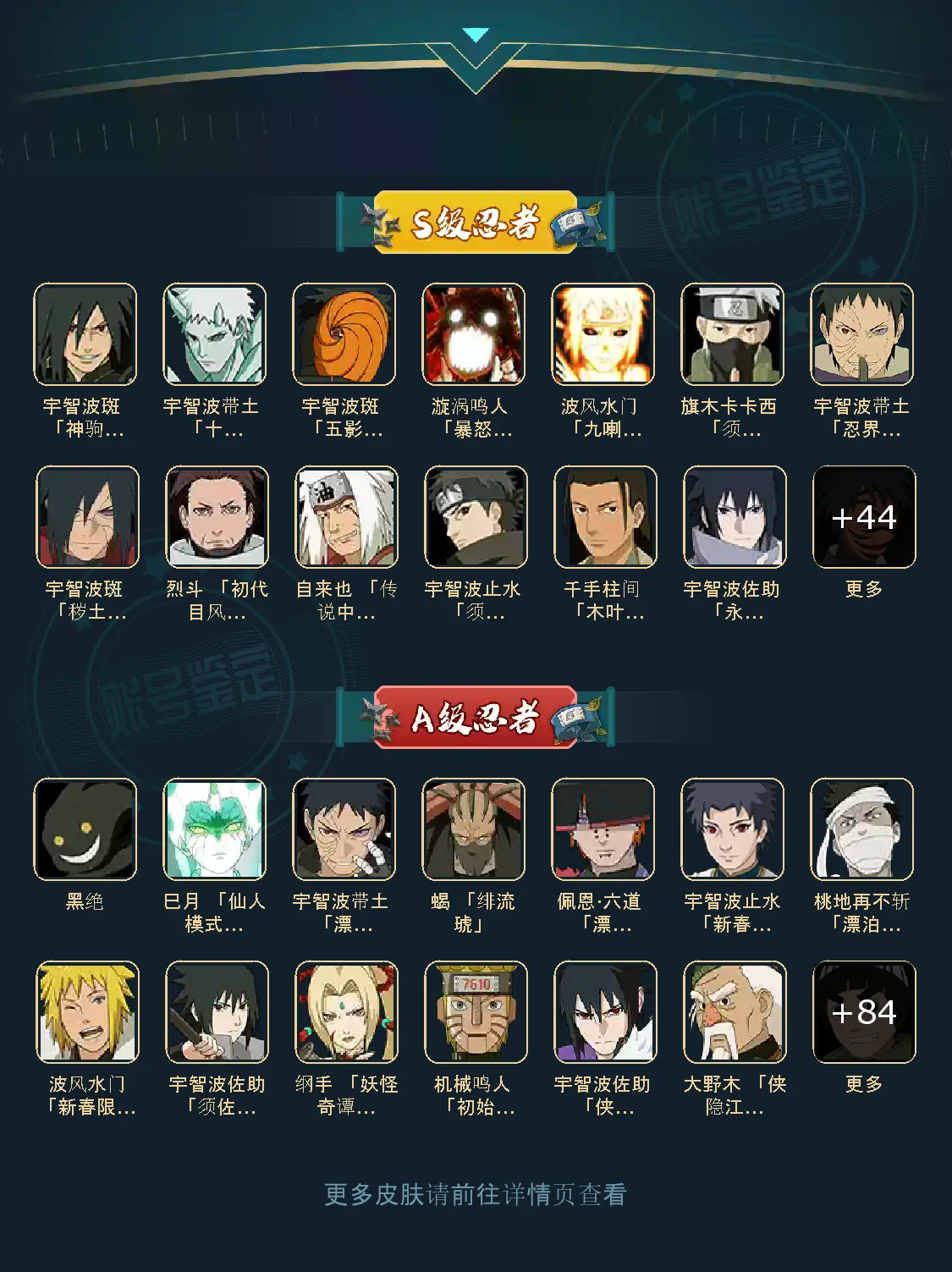 仙人自来也 纲手 波风水门 百战水门 猿飞日斩 千手柱间 宇智波斑 宇智波鼬 舞之自来也 大蛇丸 百战大蛇 秽土四代 秽土三代 秽土长门 仙人兜 黄猿九喇嘛鸣人 紫狗永恒佐助 樱婊忍战樱 秽土鼬 普通自来也 百豪纲手 死门凯 二代扉间 秽土二代 秽土初代 秽土柱间 白面具 须佐卡卡西 小胡子鬼灯幻月 雷影 土影 无 佩恩 百战佩恩 青年柱间 创立初代 秽土斑 青年斑 解斑 须佐止水 虎皮 破面带土 红夜带土 罗砂 秽土三代风影 忍战雷影 三代雷影 金角银角 秽土半藏 忍战大野木 小土豆 天道超 大筒木桃式 大筒木金式 钢铁之躯凯 桀骜之刃阿斯玛 狂野之鲨鬼鲛 飞段 黑飞段 百豪樱 忍战李 大卡卡西 五代水影照美冥 宇智波鼬 仙鸣 九尾查克拉鸣人 鹰佐 奇拉比 青年艾 半蛇兜 晓蛇 新春鼬 面麻 须佐佐助 疾风咒印佐助 忍战宁次 忍战天天 最终章雏田 幻容卡卡西 神卡 忍战卡卡西 泳装卡卡西 忍战凯 青春哥 惊门凯 爱情哥 新春止水 新春水门 青年水门 青水 新春我爱罗 泳装照美冥 侠隐照美冥 侠隐纲手 侠隐兜 漂泊再不斩 漂泊佩恩 漂泊二代 漂泊小南 漂泊佩恩 三船 青年三船 青年长门 泳装南 新春南 黑绝 新春大蛇丸 晓创生角度 晓创生蝎 晓创生飞段 泳装鼬 鲛肌融合鬼鲛 新春迪达拉 秽土迪达拉 恶灵之影飞段 暴怒带土 忍战黄土 卑留呼 桃博 黑土