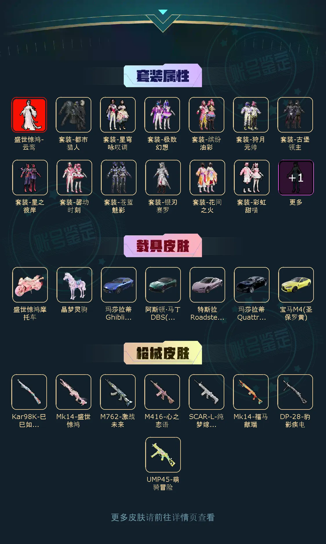 【稀有资产】盛世惊鸿-云鸾[2级]/套装-彩虹甜喵/套装-缤纷油彩/M416-心之恋语/Mk14-盛世惊鸿/套装-都市猎人/套装-雪山精英/套装-暗影哥特/套装-龟仙人/套装-晶辉守护/套装-动感兔斯基人偶服/套装-银月精灵/套装-绒绒粉兔/角色-灵公主/角色-时希公主/角色-乐音/角色-鲛海歌灵