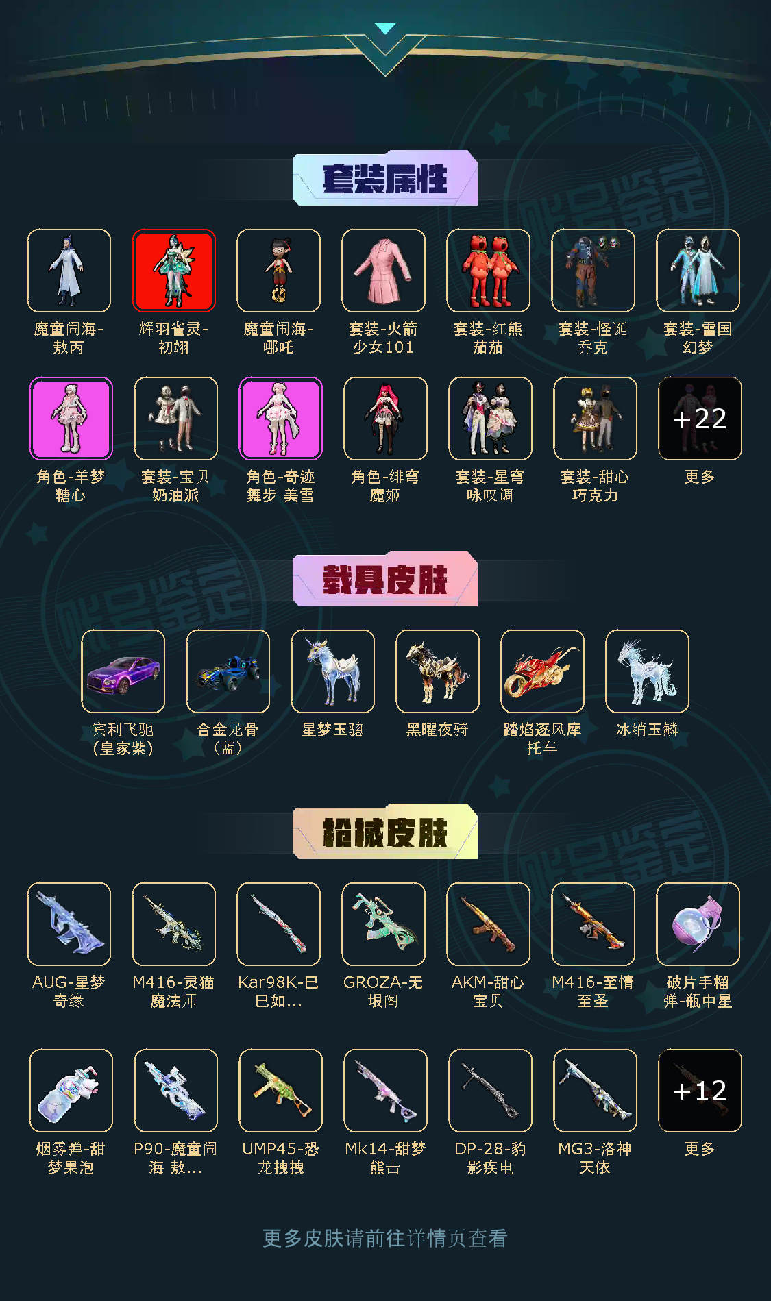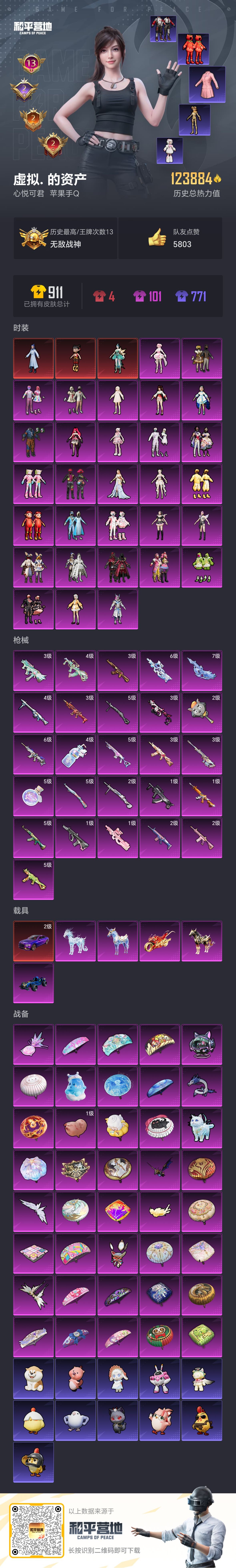 33粉,6载具,156套装,13王牌印记,无敌战神历史最高段,123884热力值 平底锅-喜羊羊与灰太狼/Vector-绯穹魔姬/M416-灵猫魔法师/AKM-甜心宝贝/SCAR-L-童趣迷兔/AUG-星梦奇缘/AKM-绿萝繁花/M416-心之恋语/GROZA-超新星/M416-至情至圣/AUG-超新星/SCAR-L-魔童闹海 哪吒/GROZA-无垠阁/Mk14-甜梦熊击/DP-28-圣堂之誓/MG3-洛神天依/DP-28-豹影疾电/P90-粉樱探戈/AKS-74U-星穹咏叹调/UMP45-恐龙拽拽/P90-魔童闹海 敖丙/JS9-奇迹舞步/破片手榴弹-瓶中星球/烟雾弹-甜梦果泡/Kar98K-巳巳如意/AMR-智耀战神/宾利飞驰(皇家紫)/合金龙骨(蓝)/冰绡玉鳞/星梦玉骢/黑曜夜骑/踏焰逐风摩托车/