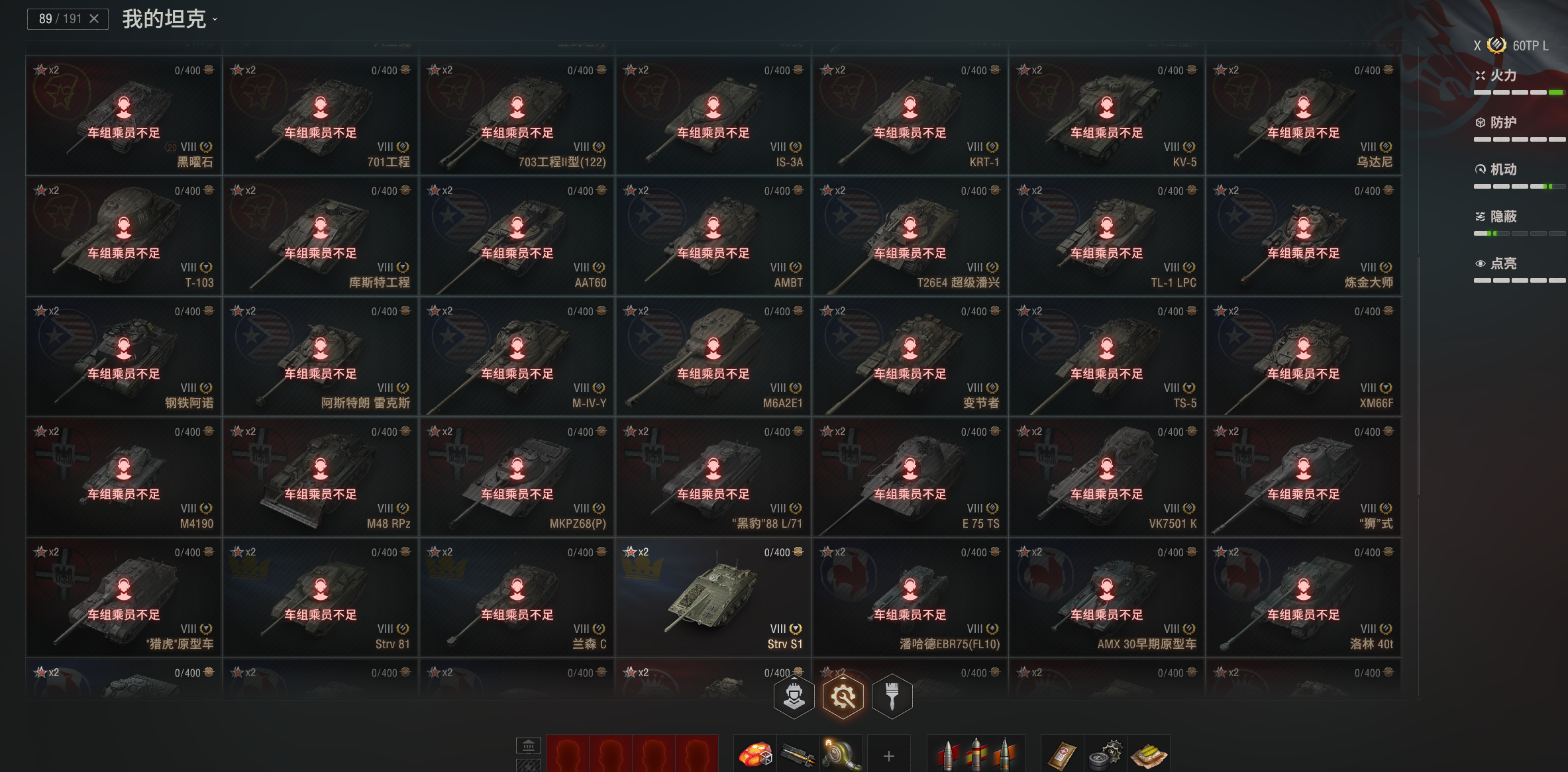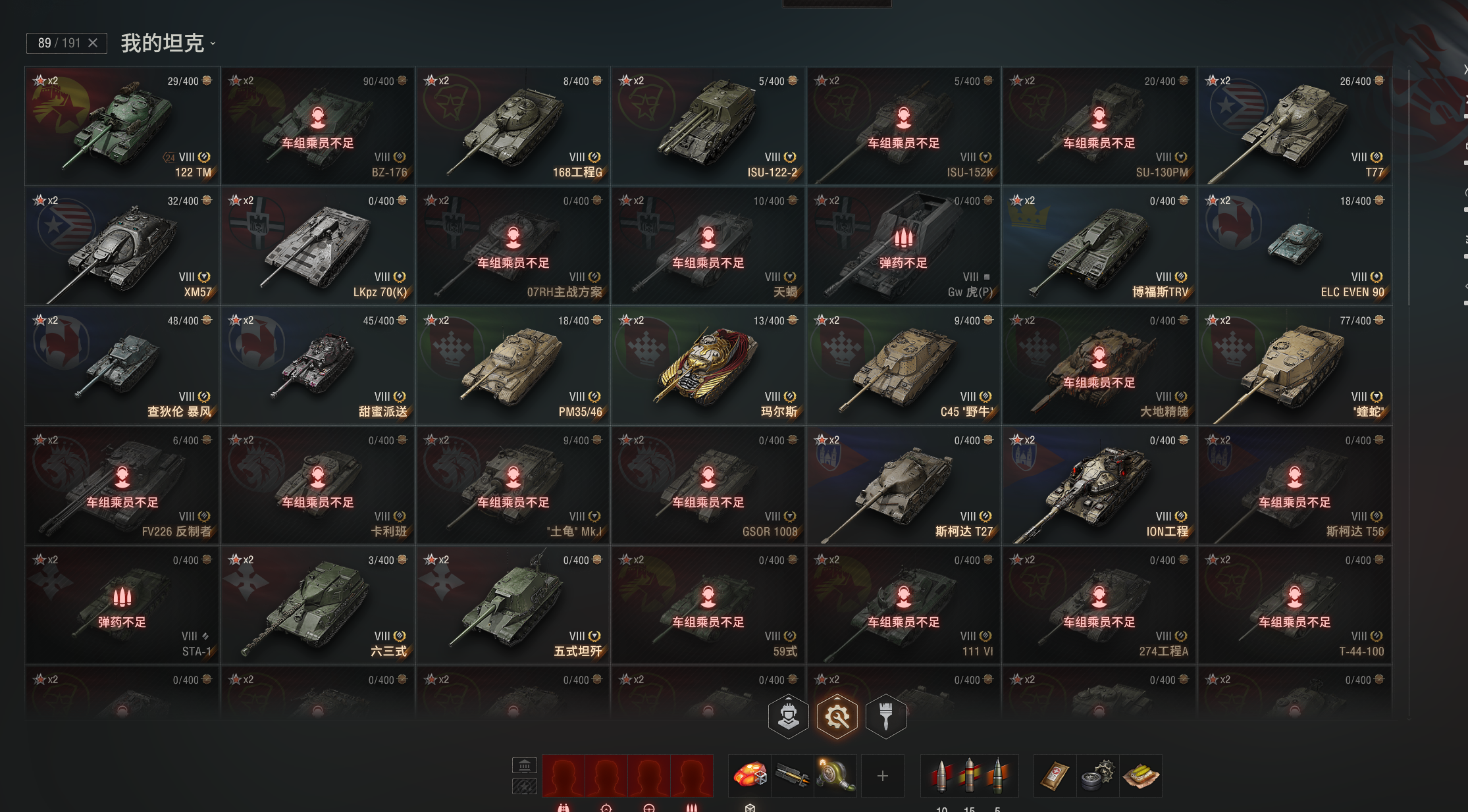 注意事项:1,进入游戏后,如果车辆情况不符。那是因为前面的玩家筛选了自己玩的坦克,其他的隐藏了。坦克显示栏,左下角小坦克标志,点进去把所有系别和级别选上,坦克就全部出来了。