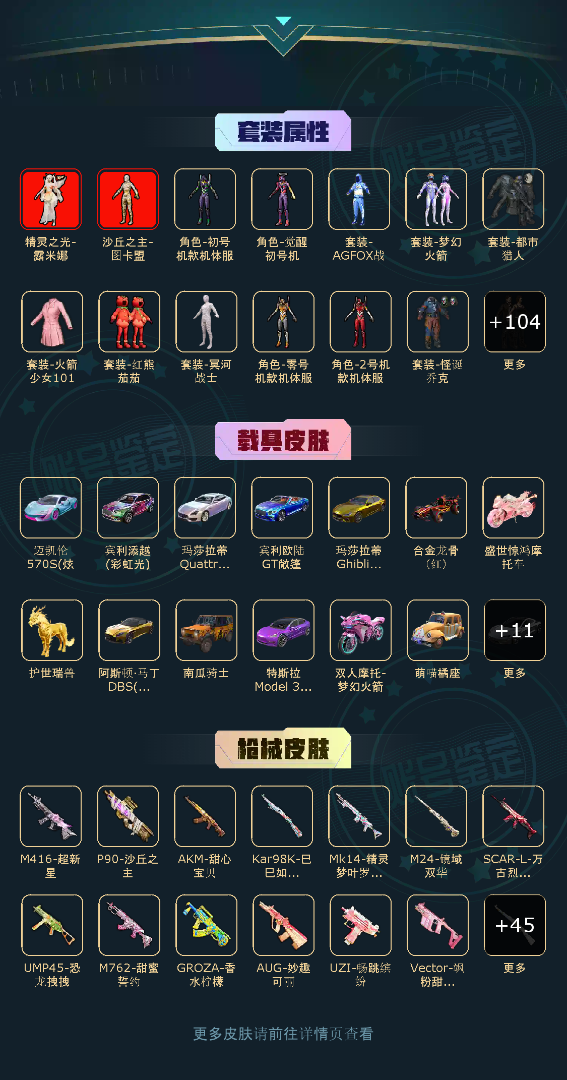 108粉,24载具,58特效枪,599套装,23王牌印记 AKM-甜心宝贝/SCAR-L-童趣迷兔/Kar98K-伏魔团/AUG-星之彼岸/AWM-花间之火/GROZA-香水柠檬/M416-心之恋语/平底锅-林间仙鹿/M16A4-葫芦兄弟/Mini14-荧光虫舞/DP-28-枪炮玫瑰/AKM-炫紫旋律/MG3-洛神天依/GROZA-焦糖拿铁/SLR-暗夜玫瑰/M762-甜蜜誓约/UMP45-相思残雪/UMP45-恐龙拽拽/M249-蓝莓炮弹/玛莎拉蒂Ghibli(金)/萌喵橘座/特斯拉Roadster(尊享铂)/双人摩托-梦幻火箭/特斯拉Cybertruck(极昼黑)/兰博基尼Estoque(炫光金)/快艇-塞莎KL27(霓虹粉)/特斯拉Model 3(奇幻紫)/阿斯顿·马丁DBS(金)/鬼马风驰/南瓜骑士/合金龙骨(红)/兰博基尼SVJ(尊享铂)