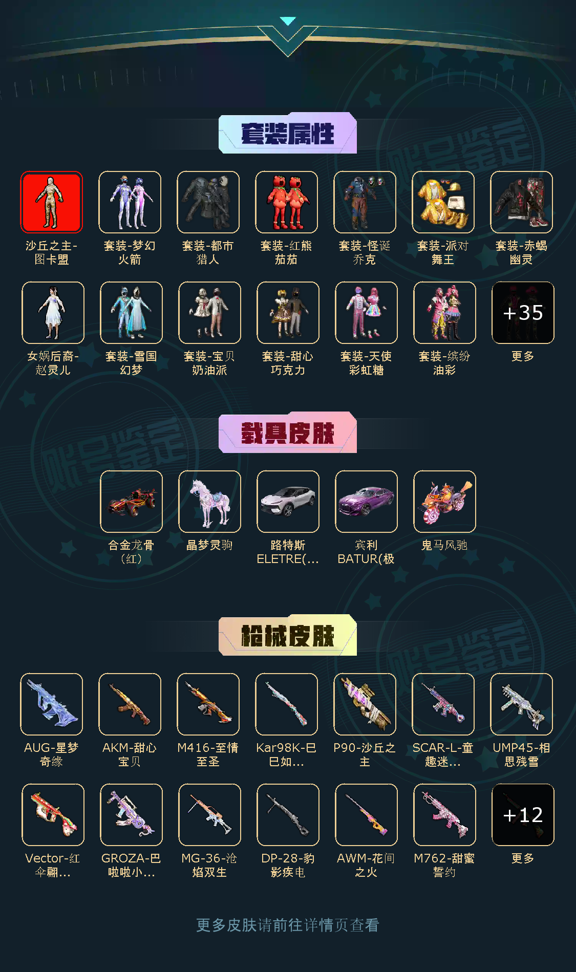 44粉,5载具,268套装,17王牌印记,无敌战神历史最高段,150384热力值 平底锅-喜羊羊与灰太狼/平底锅-仲夏莫吉托/AKM-甜心宝贝/SCAR-L-童趣迷兔/AUG-星梦奇缘/GROZA-巴啦啦小魔仙/M416-心之恋语/SCAR-L-纯梦嫁纱/M16A4-垂柳戏鸭/AKM-炫紫旋律/M416-至情至圣/M762-甜蜜誓约/SKS-碧影闪光/M249-彩虹甜喵/MG3-洛神天依/MG-36-沧焰双生/DP-28-豹影疾电/汤姆逊-怪笑疯兔/Vector-红伞翩翩/UMP45-相思残雪/P90-沙丘之主/破片手榴弹-热量炸弹/Kar98K-伏魔团/AWM-花间之火/Kar98K-巳巳如意/路特斯ELETRE(花绽灰)/鬼马风驰/合金龙骨(红)/宾利BATUR(极速紫)/晶梦灵驹/