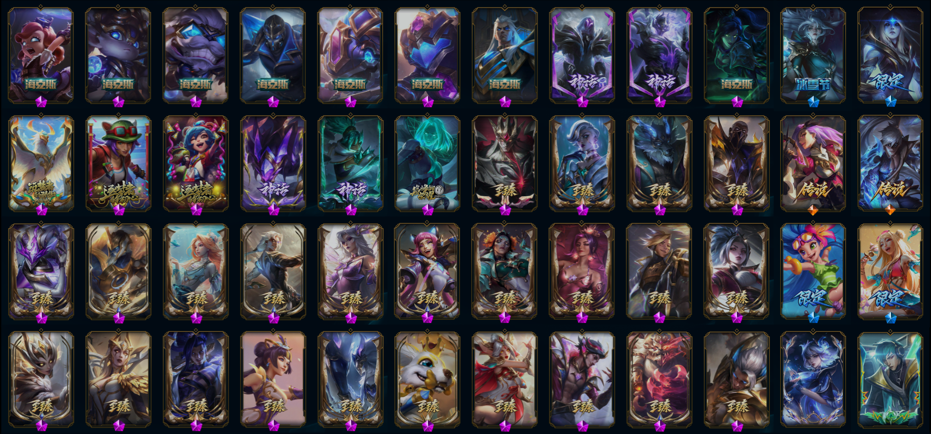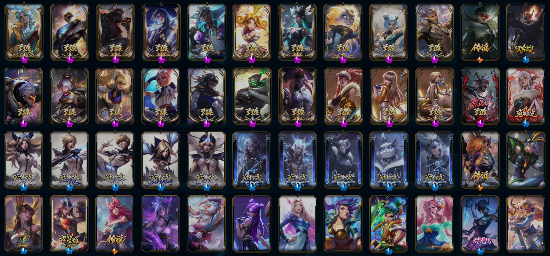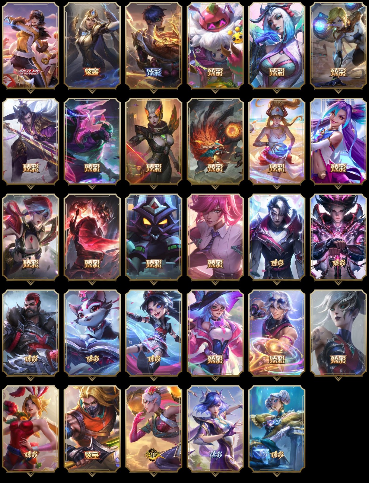【重要皮肤】永恒星灵佐伊至臻 T1塞拉斯至臻 暗裔英雄嘉文四世至臻 青花瓷千珏至臻 天龙之子伊泽瑞尔至臻 神龙尊者比翼之龙洛至臻 北极星钢影卡蜜尔至臻 心之钢永恩至臻 魔女阿卡丽至臻 魂蔷薇烈娜塔至臻 玉剑传说琴仙子至臻 斗魂觉醒萨科至臻 斗魂觉醒派克至臻 墨之影武者亚索至臻 花仙使者卡特琳娜至臻 剪纸仙灵希维尔至臻 北极星使者沃里克至臻 至高天奎桑提至臻 星之守护者辛德拉至臻 星之守护者艾克至臻 海之歌萨勒芬妮至臻 西部魔影猎天使恶魔泰隆至臻 幻灵战斗猫金克丝至臻 青花瓷拉克丝至臻 神凰行者烈羽焰凰霞至臻 战斗学院蕾欧娜至臻 魔女婕拉至臻 魔女乐芙兰至臻 真实伤害赛娜至臻 灵能特工伊泽瑞尔至臻 源计划逆流塞拉斯至臻 源计划阴劫至臻 神龙尊者炎龙瑟提至臻 黑夜使者凯隐至臻 神龙尊者均衡之龙沃利贝尔至臻 征服者贾克斯至臻 飞升战神潘森至臻 KDA一代卡莎至臻 KDA伊芙琳至臻 KDA阿卡丽至臻 星之守护者妮蔻至臻 源计划正义艾瑞莉娅至臻 真实伤害奇亚娜至臻 绒毛菲兹至臻 未来战士锤石至臻 灰烬守护者慎 灰烬骑士派克 海克斯科技安妮 海克斯科技克格莫 海克斯科技斯维因 海克斯科技吉格斯 海克斯科技波比 海克斯科技拉莫斯 水晶掠夺者卡兹克 水晶圣骑塔莉垭 摄魂使者薇恩 胜利剑圣易 胜利女神娑娜 胜利之王泰达米尔 胜利巨口克格莫 荣誉使者玛尔扎哈 养蜂人辛吉德 电玩勇者锐雯 玉剑传说舞剑仙 玉剑传说神机花火 玉剑传说无劫 玉剑传说舞龙卫 点心宝贝阿木木 天龙之子斯莫德 剪纸仙灵艾瑞莉娅 你看见过我的熊猫吗安妮 美猴王孙悟空 虎痴之拳蔚 烈焰美人薇恩 醒狮克格莫 胜利女神瑟庄妮 胜利机器人布里茨 幽梦玫瑰伊莉丝 北极星神黛安娜 圣诞老人德莱文 冰雪女神辛德拉 魄罗骑士瑟庄妮 南瓜头王子阿木木 海之歌艾希 海之歌奈德丽 海之歌萨勒芬妮 海之歌永恩 泳池派对佐伊 泳池派对厄运小姐 泳池派对菲奥娜 泳池派对雷克顿 御星魔矢艾希 克格汪 EDG厄斐琉斯 EDG佛耶戈 EDG格雷福斯 EDG悠米 EDG佐伊 iG卡蜜尔 iG洛 iG卡莎 iG艾瑞莉娅 iG乐芙兰 iG菲奥娜 SSG塔莉垭 SKTT1扎克 SKTT1艾克 SKTT1雷克顿 SSW泰隆 SSW图奇 SSW辛吉德 SKTT1贾克斯 SKTT1婕拉 暗杀星奥莉安娜 暗杀星蒙多 Fnatic迦娜 Fnatic库奇 Fnatic古拉加斯 Fnatic嘉文四世 冰雪节玛尔扎哈 冰雪节辛吉德 防暴士兵辛吉德 防暴天使凯尔 冠军之隐劫 鬼影森森茂凯 鬼影重重魔腾 惊悚派对阿木木 警用试作体K9内瑟斯 南瓜头费德提克 圣诞精灵崔丝塔娜 圣诞狂欢基兰 圣诞狂欢努努和威朗普 圣诞老人古拉加斯 圣诞玩偶波比 圣诞驯鹿克格莫 外星装甲库奇 邪恶圣诞老人维迦 雪默丁格 野兽猎人瑟庄妮 勇者阿狸 勇者奈德丽 暗影沃里克 阿木木主人不要我了 都铎王朝图奇 十五周年纪念希维尔 十周年纪念安妮 源代码乐芙兰 神凰行者瑞羽圣凰艾尼维亚 胜利凤凰艾尼维亚 机神青龙德莱文 暗裔英雄盖伦 绝息圣堂洛