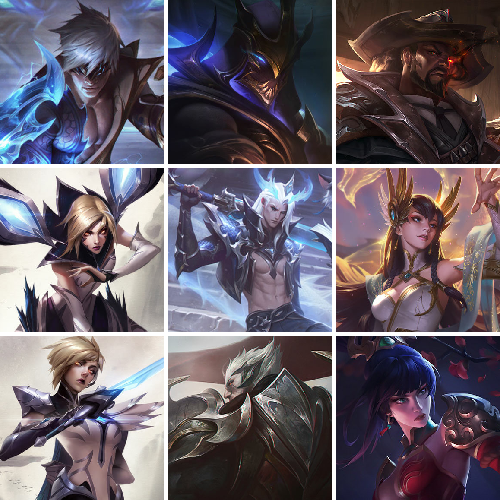 【传说皮肤】恶魔之刃泰达米尔 幻灵战斗队长厄运小姐 战地巨兽科加斯 西部天使赛娜 花仙女王卡尔玛 焰尾妖狐阿狸 金牌主播德莱文 星之守护者霞 未来战士凯特琳 银河魔装机神兰博 太空律动猫猫布里和里茨 日蚀骑士希维尔 星之守护者阿卡丽 战地机甲厄加特 源计划毁灭派克 魔幻卡牌崔斯特 陆地王者4WD布里茨 源计划泯灭雷克顿 血石领主弗拉基米尔 提莫约德尔人的一大步 日蚀骑士蕾欧娜 源计划净化薇恩 奥德赛凯隐 西部魔影大小姐蕾欧娜 西部魔影卢锡安 战斗学院凯特琳 大天使长米迦勒凯尔 苹果机器人布里茨 光明哨兵薇恩 神王盖伦 神拳李青 灵能特工娑娜 炼狱魔犬内瑟斯 苍穹之光韦鲁斯 黑夜使者索拉卡 上古战魂魔腾 枯萎之壤泽拉斯 神龙尊者圣龙李青 天煞劫 死亡骑士盖伦 第三类接触黑默丁格 神王德莱厄斯 灵魂莲华阿狸 恶魔男爵瑞兹 星之守护者金克丝 女主播迦娜 冰霜亚龙希瓦娜 钢铁之翼凯尔 约德尔国队长提莫 合金巨兽努努和威朗普 鬼魂新娘莫甘娜 地狱之门卫士加里奥 烈焰雄心崔丝塔娜 女皇艾希 女校长菲奥娜 女帝卡特琳娜 邪鸦魅影乐芙兰 腥红之月鬼武姬阿卡丽 女警狙击凯特琳 红色男爵库奇 电玩女神娑娜 宇航员诺提勒斯 冰霜之刃艾瑞莉娅 律政大亨蒙多 铁哥们儿奥拉夫 灌篮高手德莱厄斯 至尊魔女莫甘娜 最终BOSS维迦 战场女武神凯尔 泳池派对吉格斯 黯晶凤凰艾尼维亚