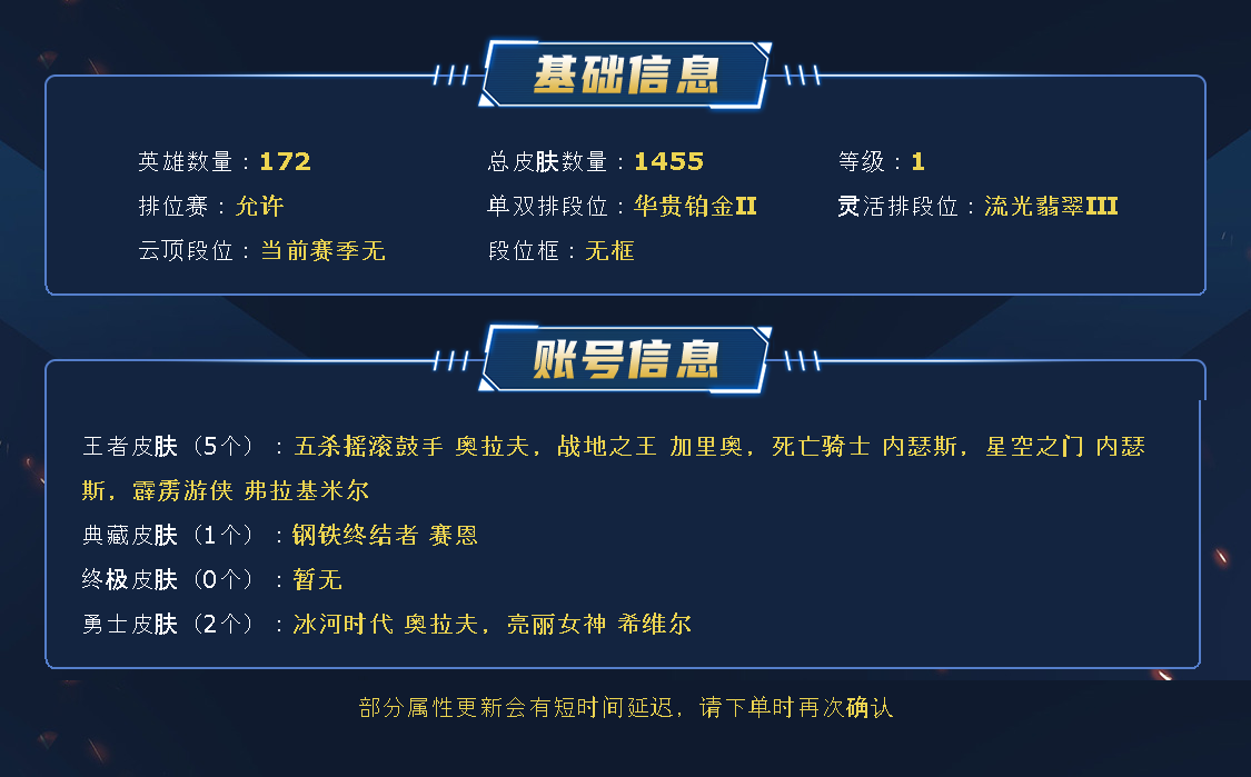 ~~喜欢记得收藏~~可排位~~1455皮全英雄~~租之前尽量查一下游戏ID,确保段位是您需要的,避免浪费您的时间~~请勿挂机逃跑故意送人头,谢谢合作,谢谢~~
