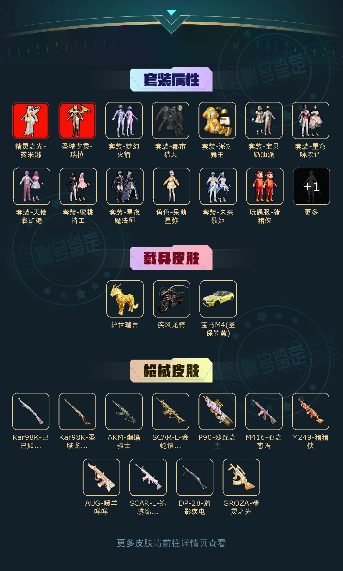【稀有资产】精灵之光-露米娜[3级]/圣域龙灵-瑞拉[1级]/角色-千金淑猫/M416-心之恋语/AUG-暖羊咩咩/AKM-幽焰骑士/SCAR-L-金蛇镇世/GROZA-精灵之光/套装-派对舞王/套装-深海小丑鱼/套装-都市猎人/套装-胖达圆圆/套装-浪漫天命/套装-雪山精英/套装-暗影哥特/套装-龟仙人/套装-兔兔白日梦/套装-霸天金鸿/套装-纯白跃动/套装-狂沙舞者/套装-狂战萌兔/玩偶服-美羊羊/角色-敖闰/角色-都市丽猫/角色-怀庆长公主/角色-俏兔智灵/角色-银尘