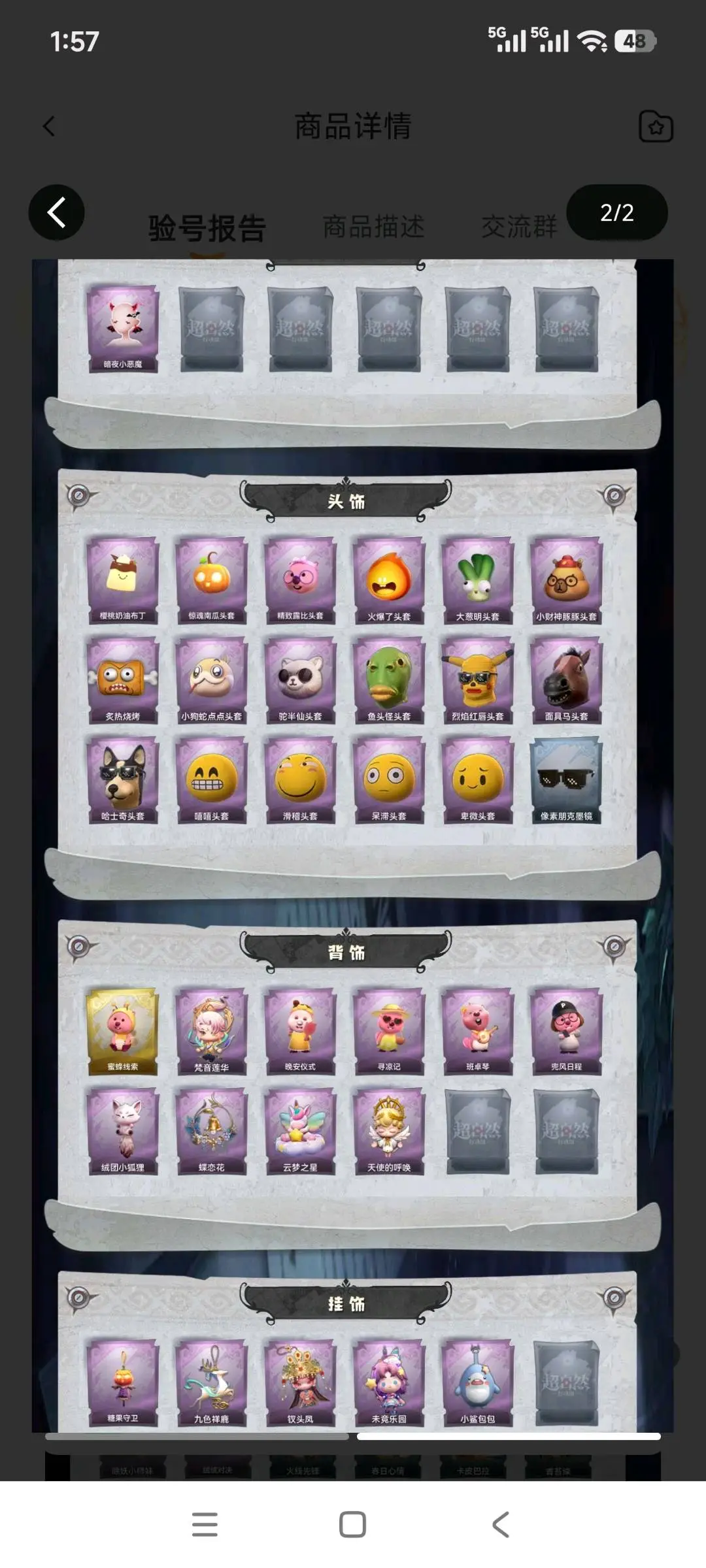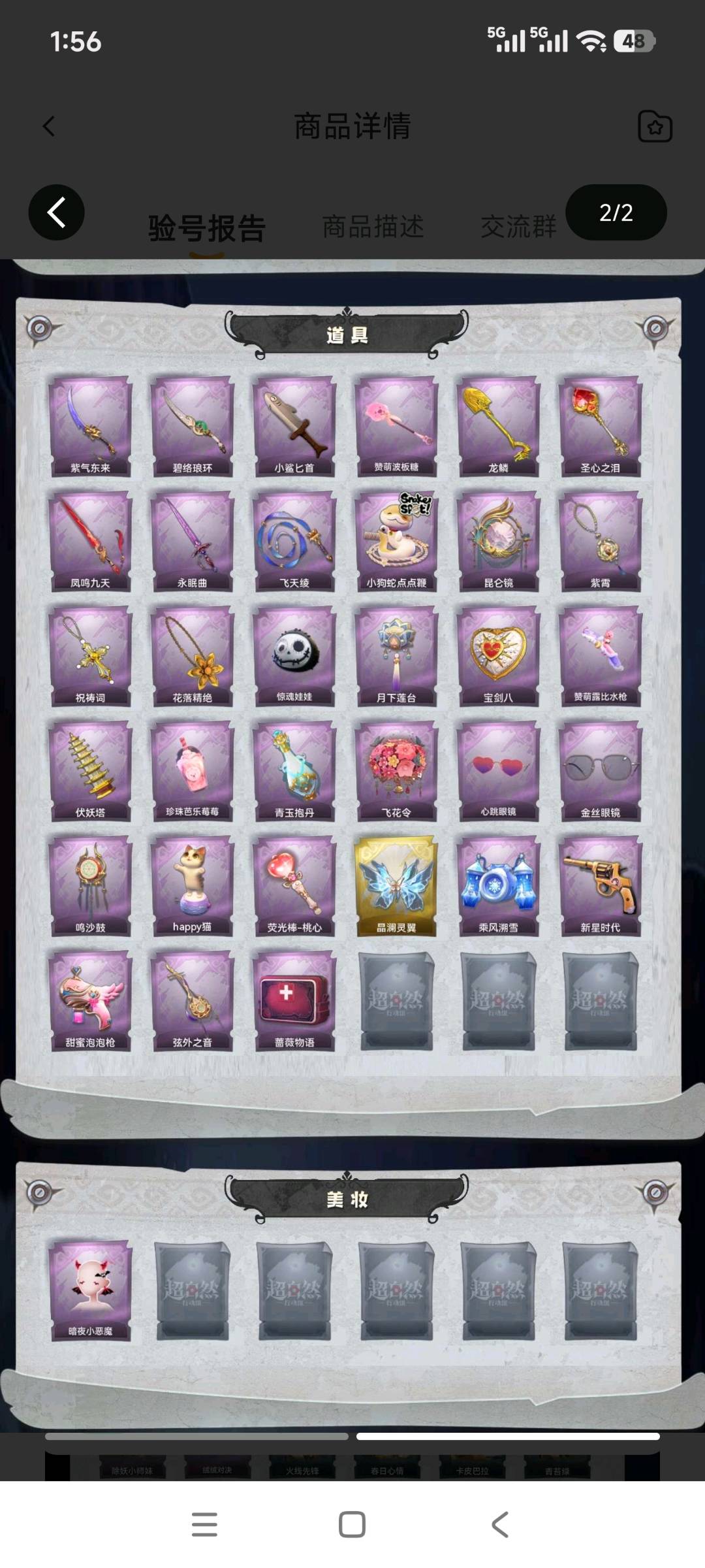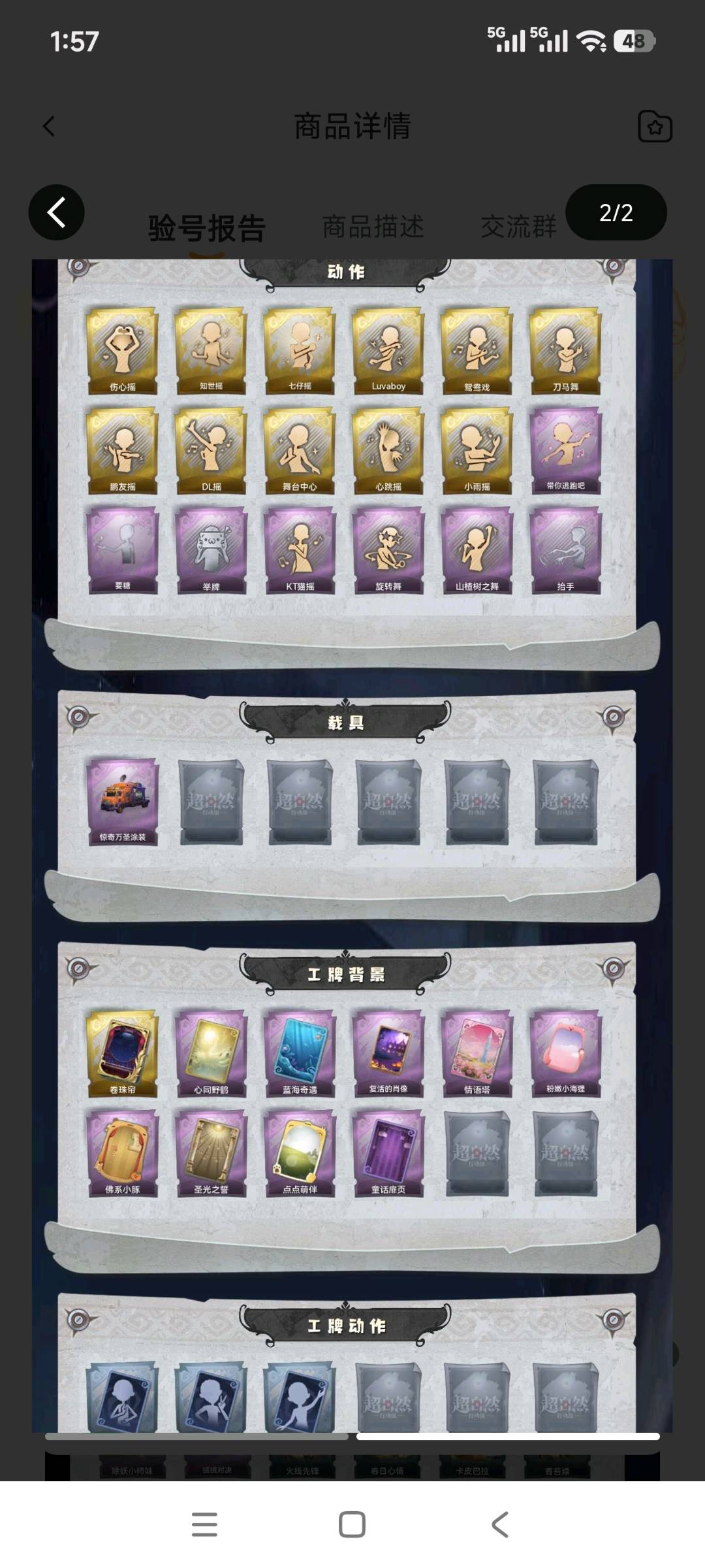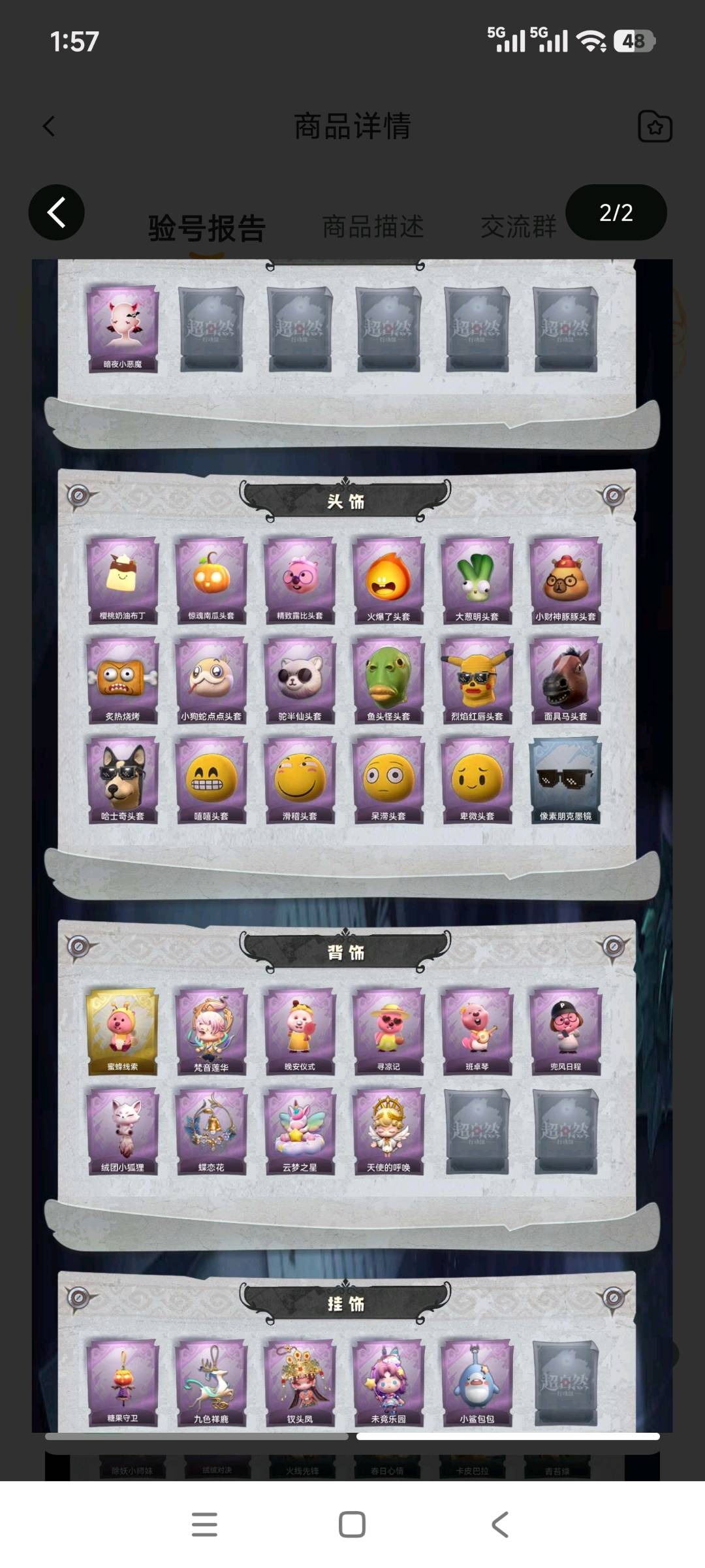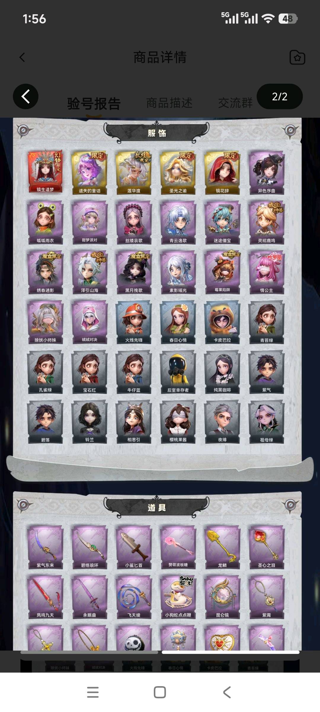 默认有二级密码,关注上限,幻梦1;金皮4;紫皮15;道具33;累充4121元;金砖26;;皮肤:巫铃儿-镜生遗梦,小黄-遗失的童话,逍遥-莲华渡,薇薇安-圣光之谕,巫铃儿-镜花辞,小黄-异色序曲,小黄-呱呱雨衣,爱丽丝-甜梦派对,爱丽丝-丝缕哀歌,零-青云逸歌,阿念-迷途僵宝,阿念-灵昭鹿鸣,逍遥-绣春逍影,逍遥-泽引山海,薇薇安-黑月挽歌,巫铃儿-素影瑶光,莉莉-莓果陷阱,莉莉-情公主,莉莉-除妖小师妹,艾伦-绒绒对决;道具:刺刀-紫气东来,刺刀-碧络琅环,刺刀-小鲨匕首,铲子-赞萌波板糖,铲子-龙鳞,铲子-圣心之泪,桃木剑-凤鸣九天,桃木剑-永眠曲,长鞭-飞天绫,长鞭-小狗蛇点点鞭,传送按钮-昆仑镜,摸金符-紫霄,摸金符-祝祷词,摸金符-花落精绝,腰包-惊魂娃娃,腰包-月下莲台,腰包-宝剑八,短管猎枪-赞萌露比水枪,葫芦-伏妖塔,黄牛能量饮料-珍珠芭乐莓莓,黄牛能量饮料-青玉抱丹,额外的背包-飞花令,夜视仪-心跳眼镜,夜视仪-金丝眼镜,音响-鸣沙鼓,音响-happy猫,荧光棒-桃心-荧光棒-桃心,喷气背包-晶澜灵翼,喷气背包-乘风溯雪,转轮手枪-新星时代,电击枪-甜蜜泡泡枪,除颤仪-弦外之音,急救包-蔷薇物语;美妆:美妆-暗夜小恶魔;饰品:头饰-樱桃奶油布丁,头饰-惊魂南瓜头套,头饰-精致露比头套,头饰-火爆了头套,头饰-大葱明头套,头饰-小财神豚豚头套,头饰-炙热烧烤,头饰-小狗蛇点点头套,头饰-驼半仙头套,头饰-鱼头怪头套,头饰-烈焰红唇头套,头饰-面具马头套,头饰-哈士奇头套,头饰-嘻嘻头套,头饰-滑稽头套,头饰-呆滞头套,头饰-卑微头套,头饰-像素朋克墨镜,背饰-蜜蜂线索,背饰-梵音莲华,背饰-晚安仪式,背饰-寻凉记,背饰-班卓琴,背饰-兜风日程,背饰-绒团小狐狸,背饰-蝶恋花,背饰-云梦之星,背饰-天使的呼唤,挂饰-糖果守卫,挂饰-九色祥鹿,挂饰-钗头凤,挂饰-未竟乐园,挂饰-小鲨包包,美妆-暗夜小恶魔;动作:动作-伤心摇,动作-知世摇,动作-七仔摇,动作-luvaboy,动作-鸳鸯戏,动作-刀马舞,动作-鹏友摇,动作-DL摇,动作-舞台中心,动作-心跳摇,动作-小雨摇,动作-带你逃跑吧,动作-要糖,动作-举牌,动作-KT猫摇,动作-旋转舞,动作-山楂树之舞,动作-抬手;载具:载具-惊奇万圣涂装;工牌背景:卷珠帘,心同野鹤,蓝海奇遇,复活的肖像,情语塔,粉嫩小海狸,佛系小豚,圣光之誓,点点萌伴,童话扉页;工牌动作:净禅,元气剪刀手,虔诚之姿;员工:小黄,爱丽丝,零,阿念,逍遥,薇薇安,巫铃儿,莉莉,艾伦,爱德华,兰