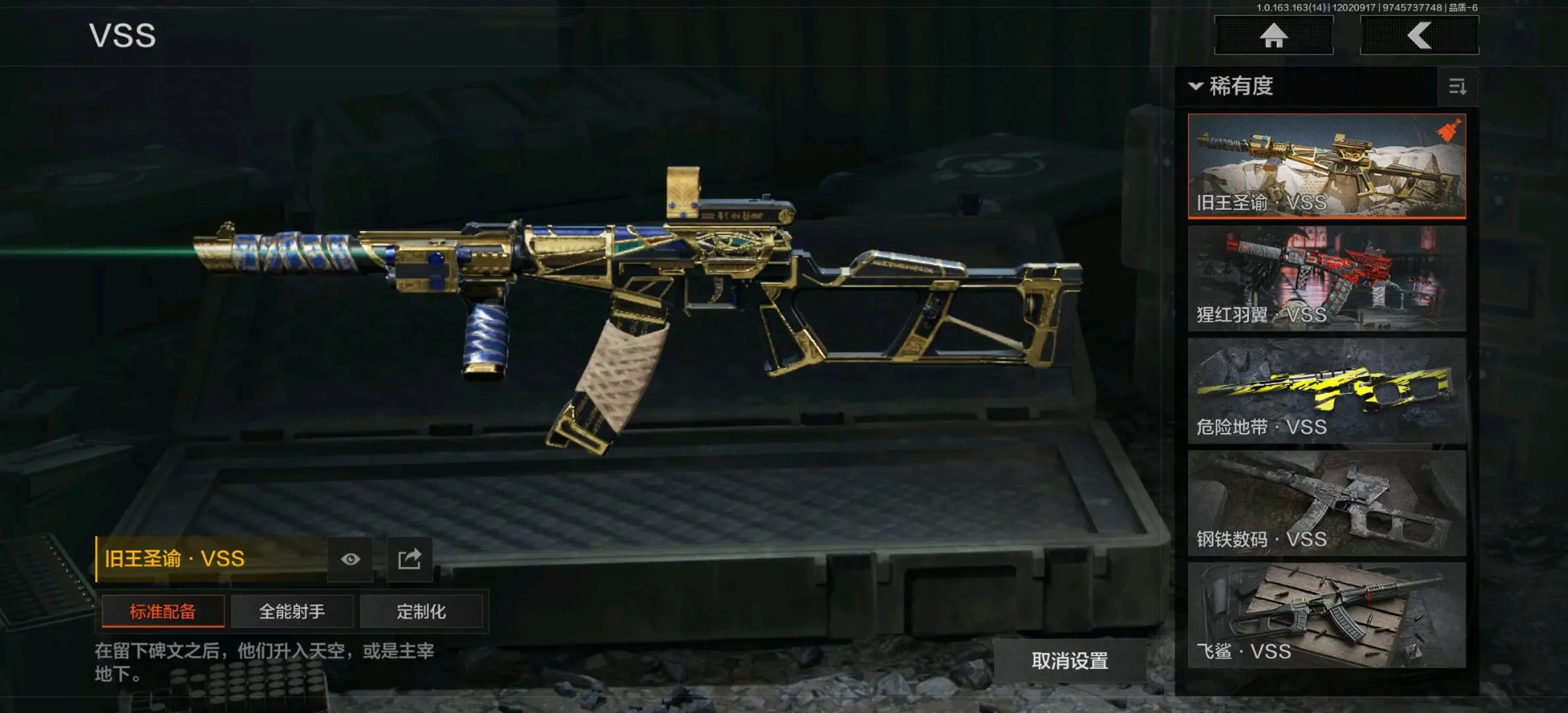 旧王圣谕VSS,棱光裂变QBU191,战术大师SVDS,典礼武备MK14,竞技M110,缟兵玄墨M110,鱼跃丹青QBU191;