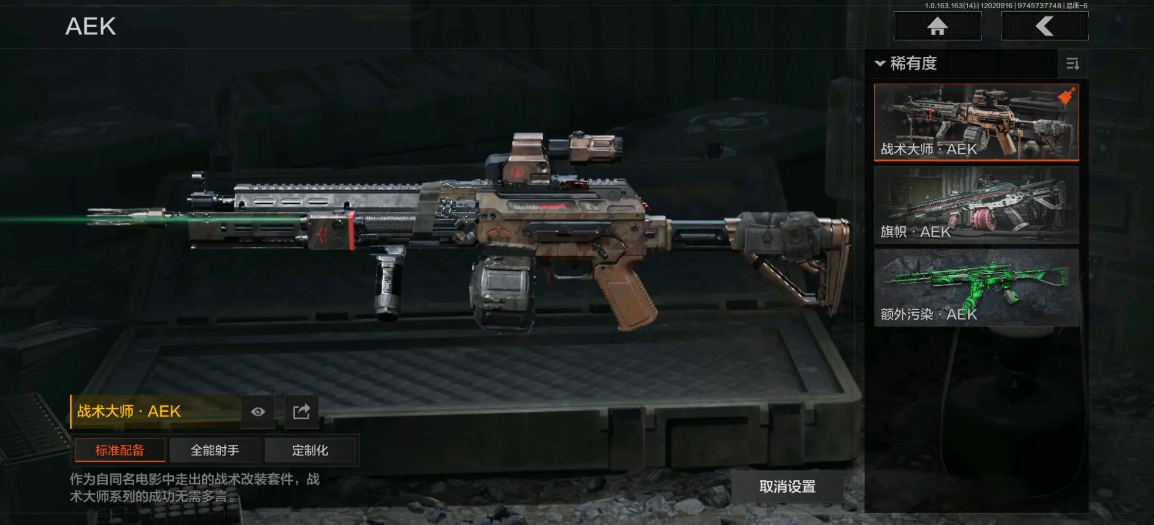 竞技FAL,包络战术AKM,告丧夜曲AR57,战术大师AEK,旗帜AEK,战术大师AN94,旧王圣谕QBZ191,缟兵玄墨AKM,历战AKM,自喷网格H416,德尔塔小队H416,竞技MDR,正在骇入MDR,涂鸦AK102,战术大师AK74N,棱光裂变AK74N,来战AK74N,山地伪装AK74N,火力倾泻AUG,钢铁真理F2000,炎夏浪花AR57,涂绘猎人AR57,粉绒臻选AN94,武侍FAMAS,巡林客T951,伦琴计量T951,利齿风暴T03,林地数码T03,骤羽尖啸AK12,07式林地迷彩QBZ191,利齿风暴MPX,湖冰倒影MP5,骤羽尖啸MPX,涂鸦MPX,利齿风暴T79,伦琴计量Vector45,战术大师Suomi;