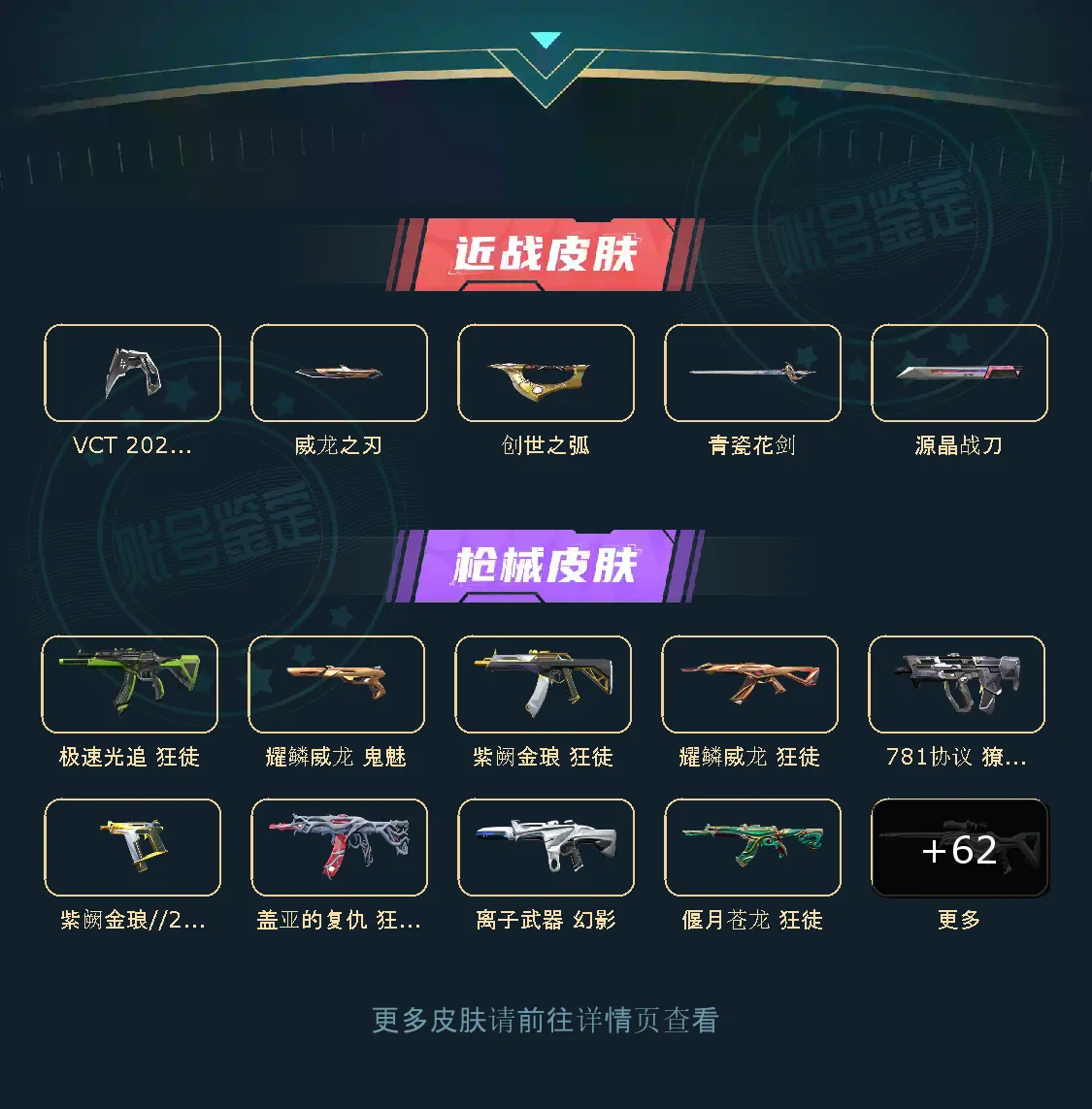 76件皮肤图鉴 全角色 有绝版VCT爪刀 威龙全套 盖亚狂徒 离子幻影 显卡狂徒 青龙狂徒 781撩犬 青花瓷 离子冥驹 等等武器…