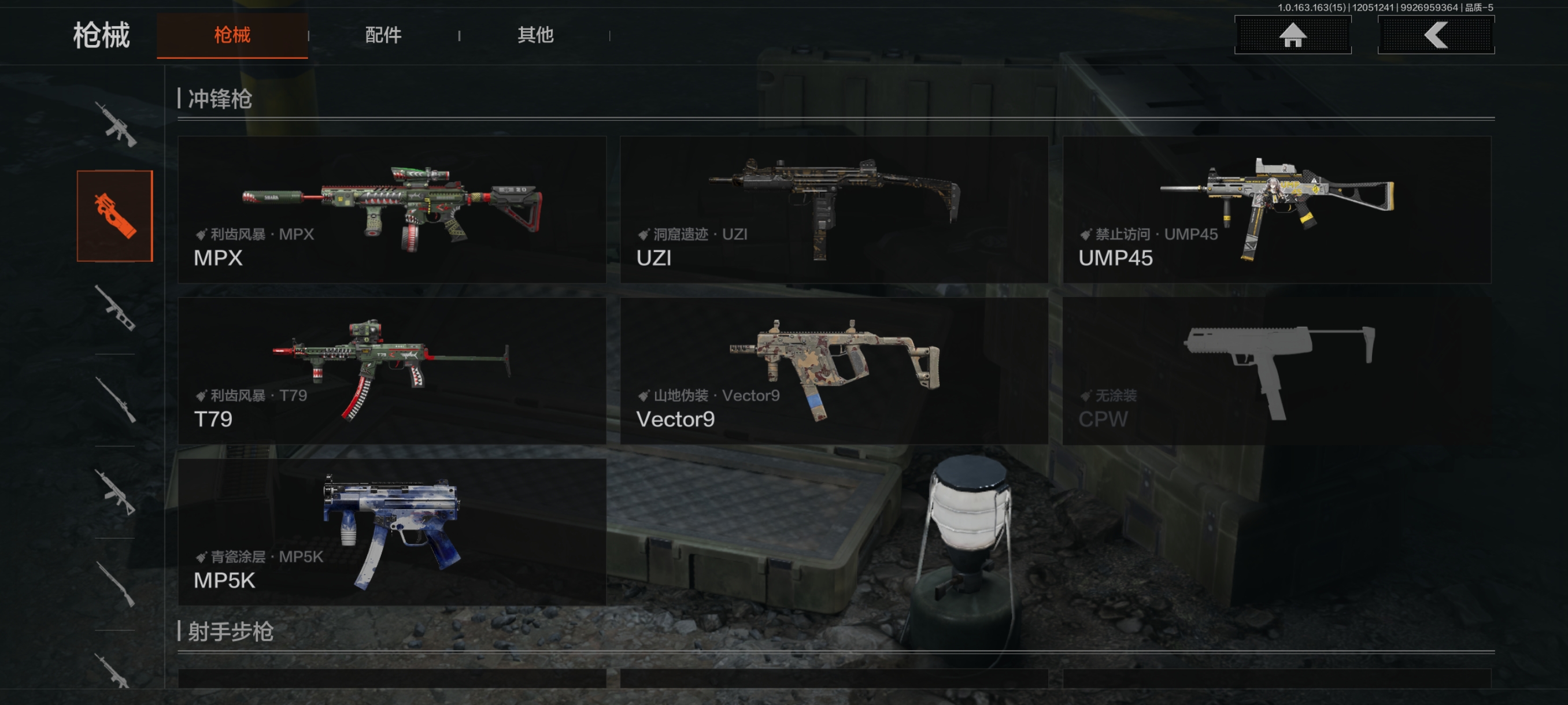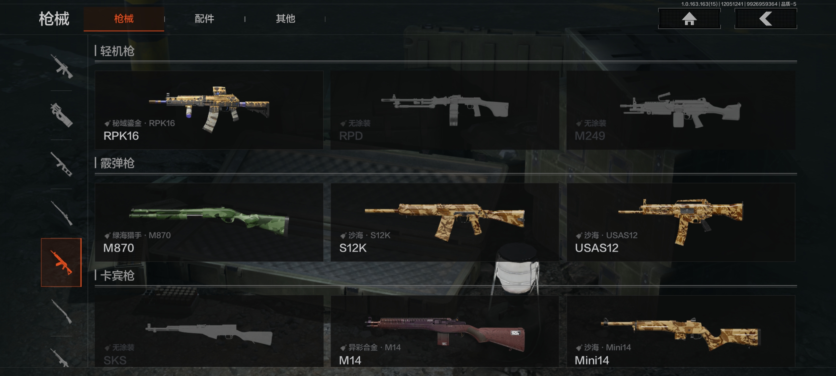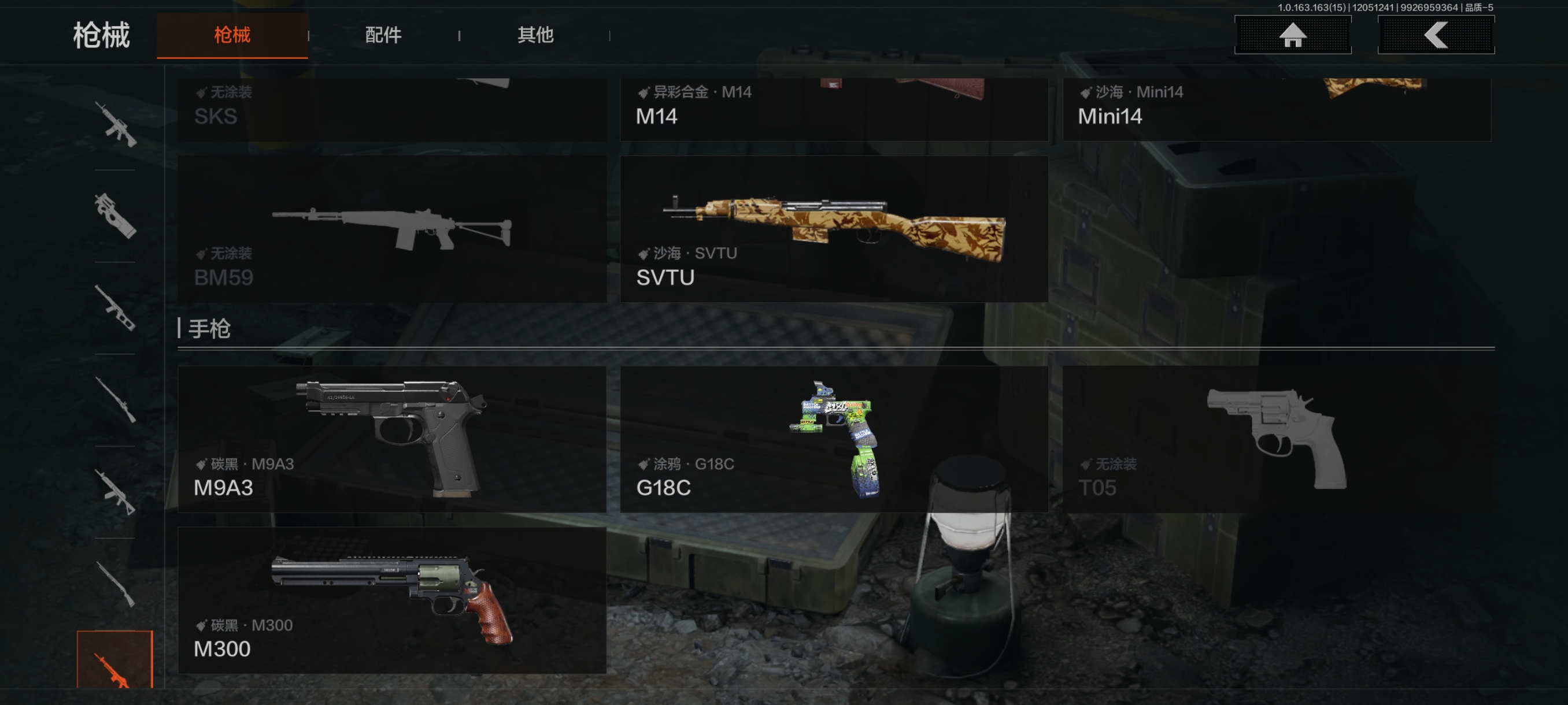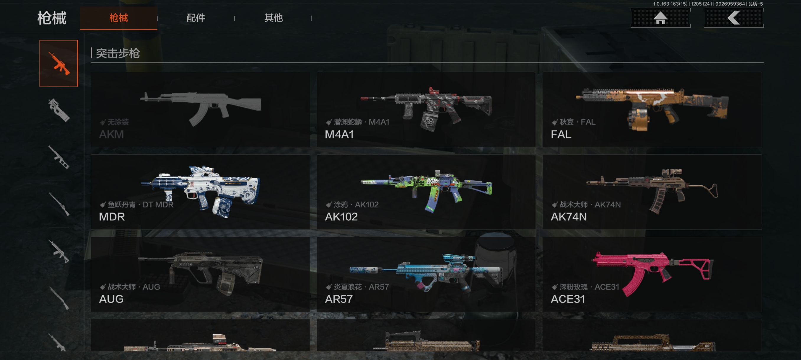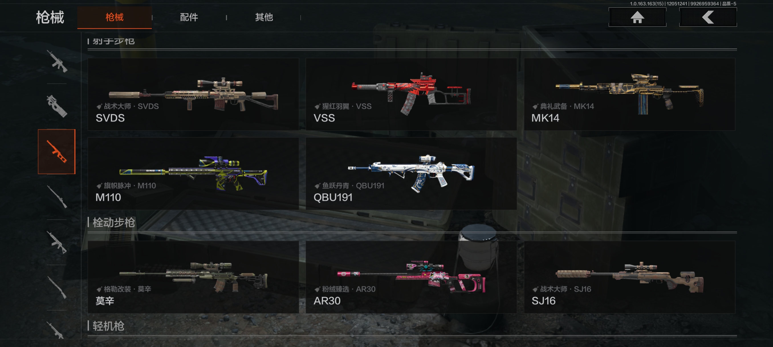 30级,历史最高段位:暗区传说【近战武器】:涂鸦利刃,霜狼生存刀,工兵铲;【角色皮肤】:极低拼图迷彩作战服,城市户外运动套装,森林守望特种服,林地作战服;【突击步枪】:包络战术AKM,缟兵玄墨AKM,潜渊蛇鳞M4A1,秋宴FAL,鱼跃丹青DTMDR,涂鸦AK102,战术大师AK74N,山地伪装AK74N,白狼连队AK74N,战术大师AUG,炎夏浪花AR57,深粉玫瑰ACE31,战术大师AN94,粉绒臻选AN94,虎纹Groza,虎纹FAMAS,青瓷涂层SCAR,巡林客T951,虎纹T03,森林迷彩T03,利齿风暴T03,沙海AK12,沙海MCX;【冲锋枪】:利齿风暴MPX,涂鸦MPX,洞窟遗迹UZI,禁止访问UMP45,洞窟遗迹UMP45,苏梅克UMP45,利齿风暴T79,山地伪装Vector9,绿海猎手CPW,青瓷涂层MP5K,;【射手步枪】:战术大师SVDS,猩红羽翼VSS,典礼武备MK14,旗帜脉冲M110,鱼跃丹青QBU191,绿松石数码QBU191;【栓动步枪】:格勒改装莫辛,粉绒臻选AR30,深粉玫瑰SJ16,战术大师SJ16;【轻机枪】:秘域鎏金RPK16,海水纹路RPD,虎纹M249;【霰弹枪】:绿海猎手M870,沙海S12K,沙海USAS12;【卡宾枪】:战术大师SKS,异彩合金M14,沙海Mini14,绿海猎手Mini14,虎纹迹BM59,沙海SVTU;【手枪】:碳黑M9A3,雪山之王G18C,涂鸦G18C,青瓷涂层T05,碳黑M300;