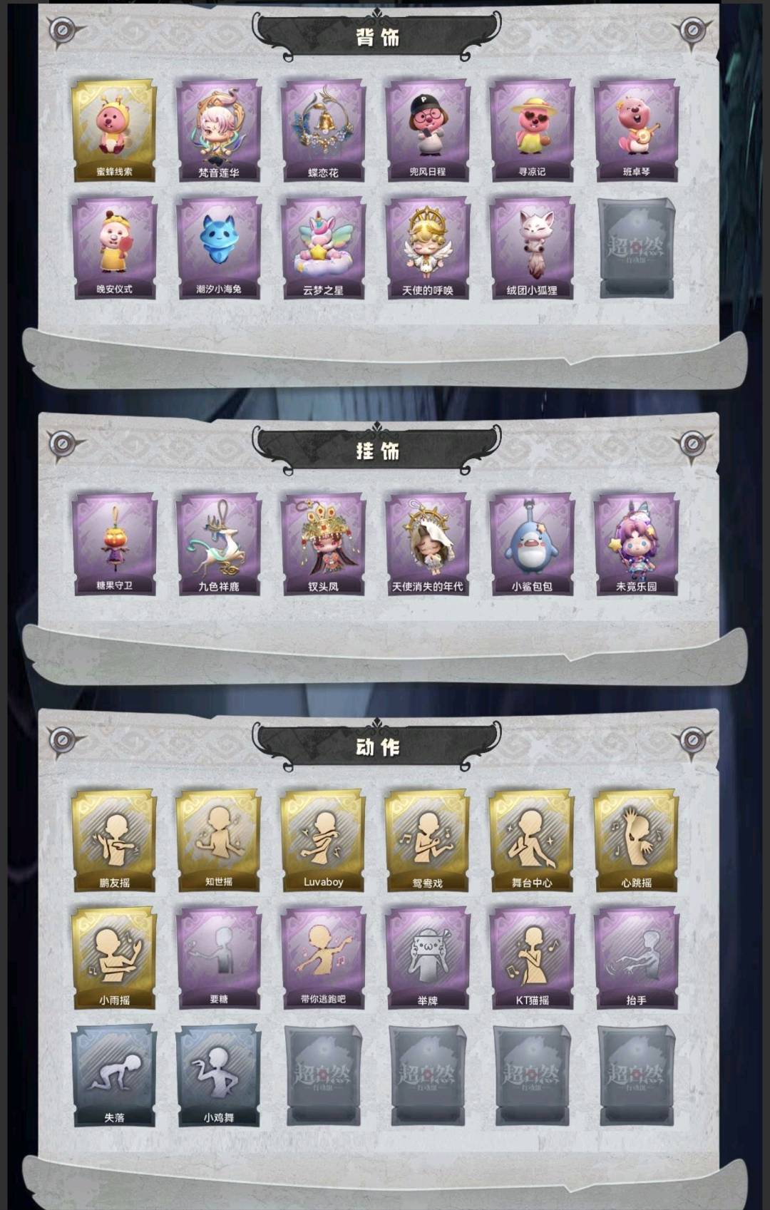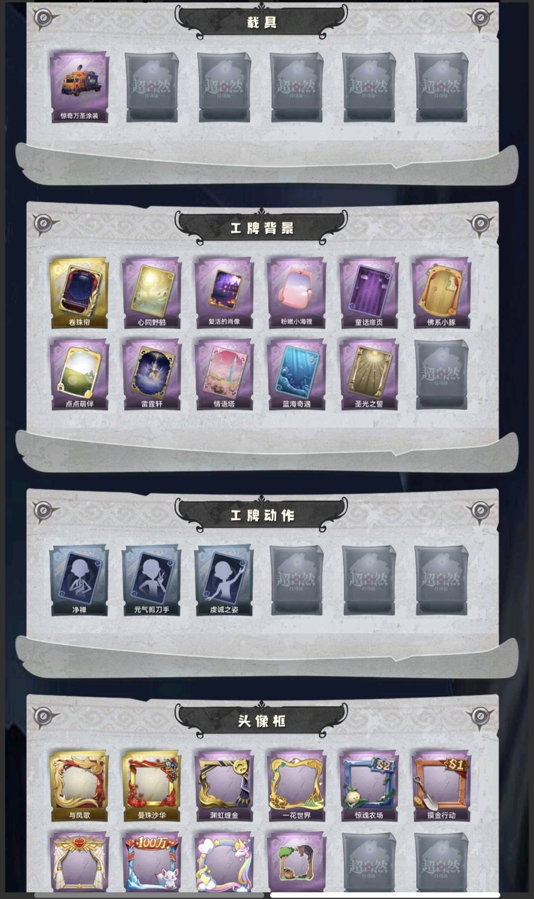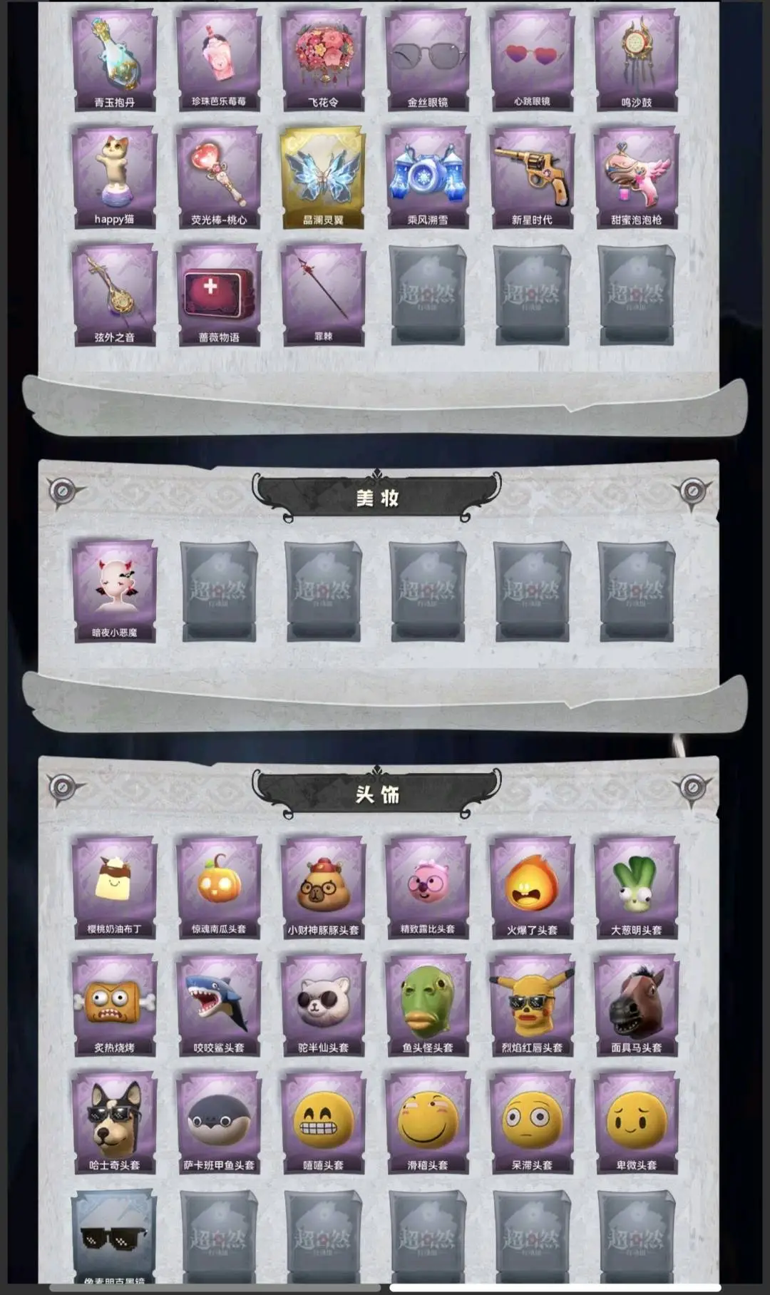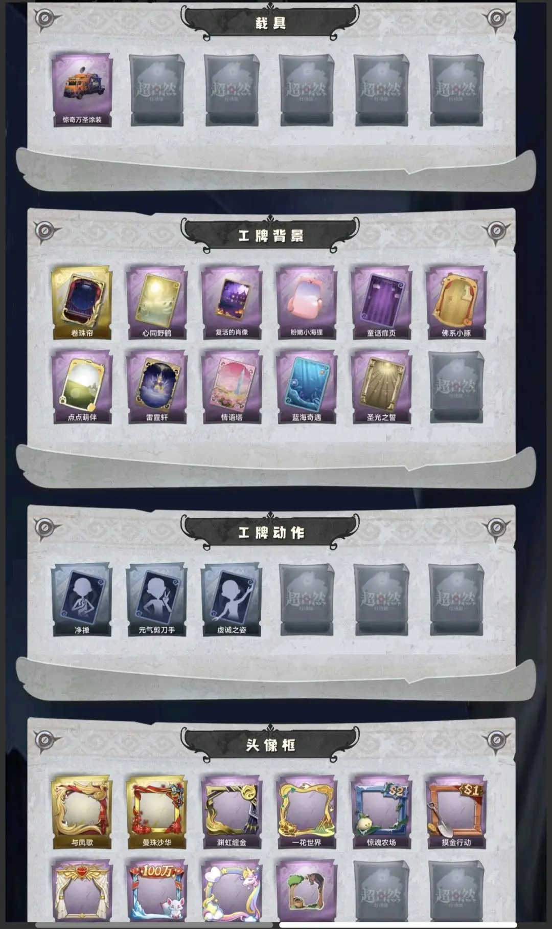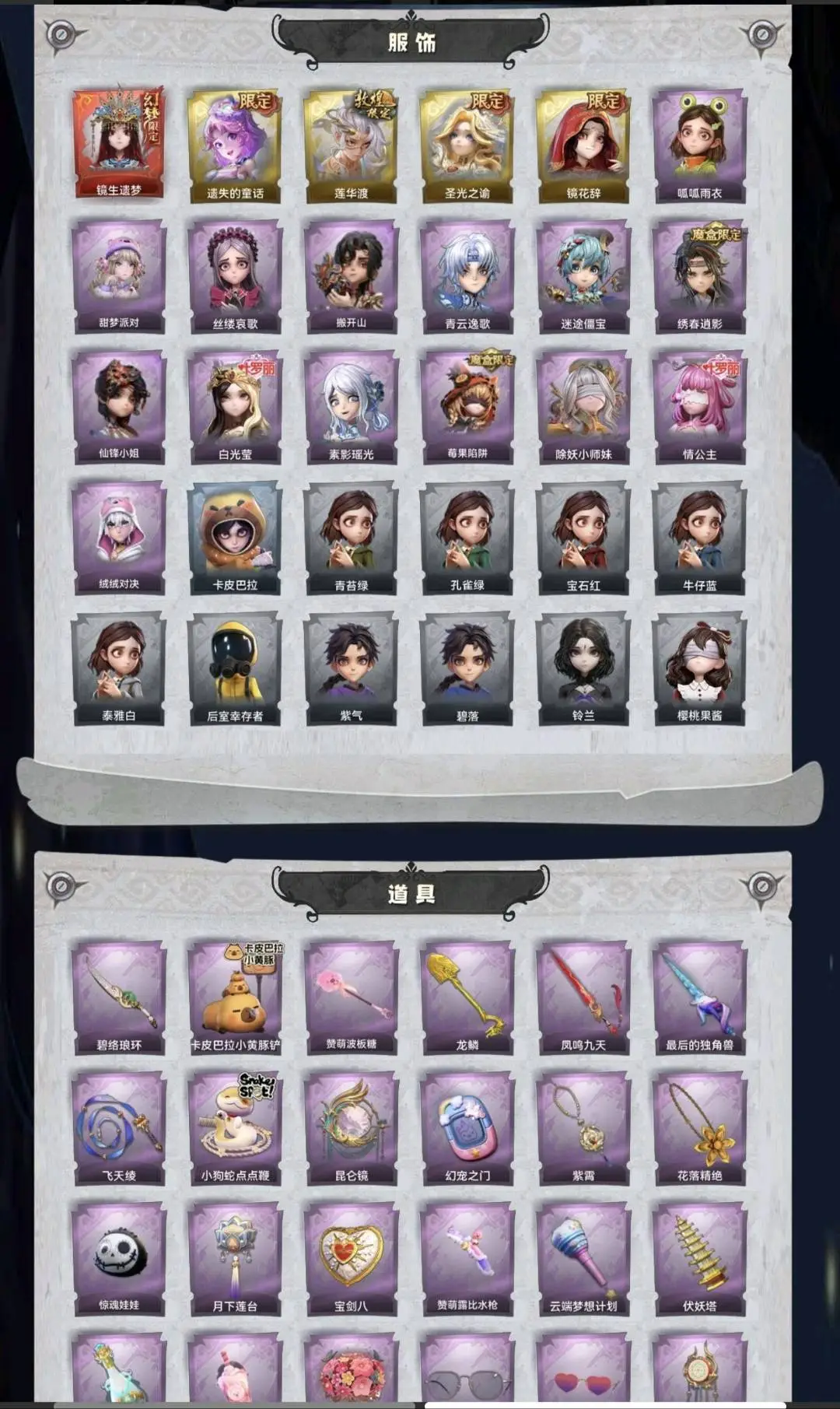 红皮1;金皮4;紫皮14;道具皮33;皮肤:巫铃儿-镜生遗梦,小黄-遗失的童话,逍遥-莲华渡,薇薇安-圣光之谕,巫铃儿-镜花辞,小黄-呱呱雨衣,爱丽丝-甜梦派对,爱丽丝-丝缕哀歌,零-搬开山,零-青云逸歌,阿念-迷途僵宝,逍遥-绣春逍影,薇薇安-仙锋小姐,薇薇安-白光莹,巫铃儿-素影瑶光,莉莉-莓果陷阱,莉莉-除妖小师妹,莉莉-情公主,艾伦-绒绒对决;道具:刺刀-碧络琅环,铲子-卡皮巴拉小黄豚铲,铲子-赞萌波板糖,铲子-龙鳞,桃木剑-凤鸣九天,桃木剑-最后的独角兽,长鞭-飞天绫,长鞭-小狗蛇点点鞭,传送按钮-昆仑镜,传送按钮-幻宠之门,摸金符-紫霄,摸金符-花落精绝,腰包-惊魂娃娃,腰包-月下莲台,腰包-宝剑八,短管猎枪-赞萌露比水枪,专业手电-云端梦想计划,葫芦-伏妖塔,黄牛能量饮料-青玉抱丹,黄牛能量饮料-珍珠芭乐莓莓,额外的背包-飞花令,夜视仪-金丝眼镜,夜视仪-心跳眼镜,音响-鸣沙鼓,音响-happy猫,荧光棒-桃心-荧光棒-桃心,喷气背包-晶澜灵翼,喷气背包-乘风溯雪,转轮手枪-新星时代,电击枪-甜蜜泡泡枪,除颤仪-弦外之音,急救包-蔷薇物语,长枪-罪棘;美妆:美妆-暗夜小恶魔;饰品:头饰-樱桃奶油布丁,头饰-惊魂南瓜头套,头饰-小财神豚豚头套,头饰-精致露比头套,头饰-火爆了头套,头饰-大葱明头套,头饰-炙热烧烤,头饰-咬咬鲨头套,头饰-驼半仙头套,头饰-鱼头怪头套,头饰-烈焰红唇头套,头饰-面具马头套,头饰-哈士奇头套,头饰-萨卡班甲鱼头套,头饰-嘻嘻头套,头饰-滑稽头套,头饰-呆滞头套,头饰-卑微头套,头饰-像素朋克墨镜,背饰-蜜蜂线索,背饰-梵音莲华,背饰-蝶恋花,背饰-兜风日程,背饰-寻凉记,背饰-班卓琴,背饰-晚安仪式,背饰-潮汐小海兔,背饰-云梦之星,背饰-天使的呼唤,背饰-绒团小狐狸,挂饰-糖果守卫,挂饰-九色祥鹿,挂饰-钗头凤,挂饰-天使消失的年代,挂饰-小鲨包包,挂饰-未竟乐园,美妆-暗夜小恶魔;动作:动作-鹏友摇,动作-知世摇,动作-luvaboy,动作-鸳鸯戏,动作-舞台中心,动作-心跳摇,动作-小雨摇,动作-要糖,动作-带你逃跑吧,动作-举牌,动作-KT猫摇,动作-抬手,动作-失落,动作-小鸡舞;载具:载具-惊奇万圣涂装;工牌背景:卷珠帘,心同野鹤,复活的肖像,粉嫩小海狸,童话扉页,佛系小豚,点点萌伴,雷霆轩,情语塔,蓝海奇遇,圣光之誓;工牌动作:净禅,元气剪刀手,虔诚之姿;员工:小黄,爱丽丝,零,阿念,逍遥,薇薇安,巫铃儿,莉莉,艾伦,爱德华,兰;累充4140元;无兔宝无兔宝无兔宝